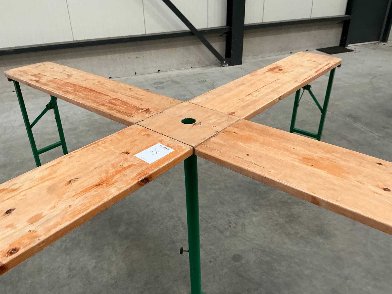 Inklapbaar; houten blad; stalen onderstel Model: Kruis Lengte: 255cm Breedte: 255cm Hoogte: 107cm