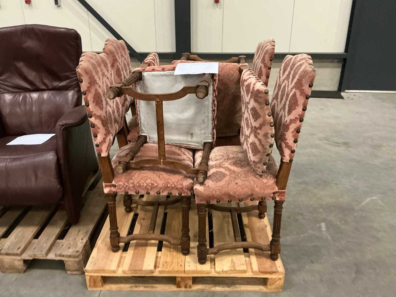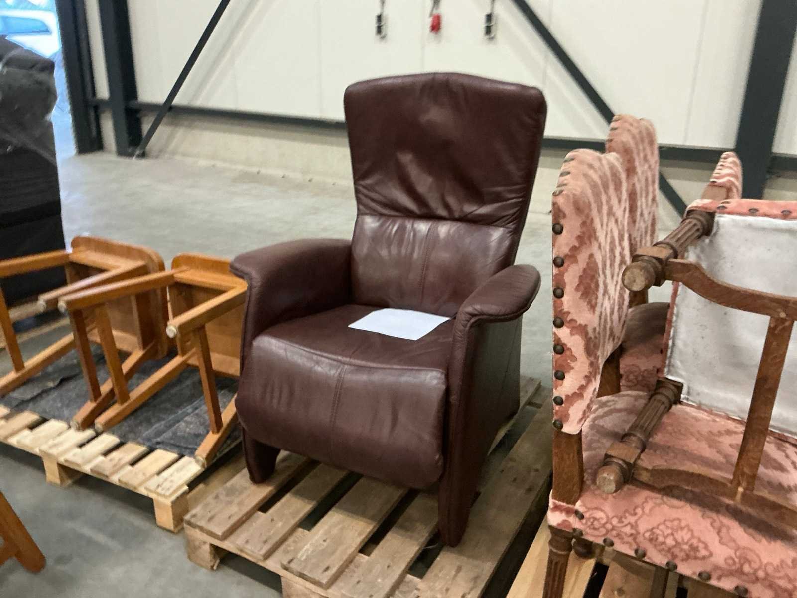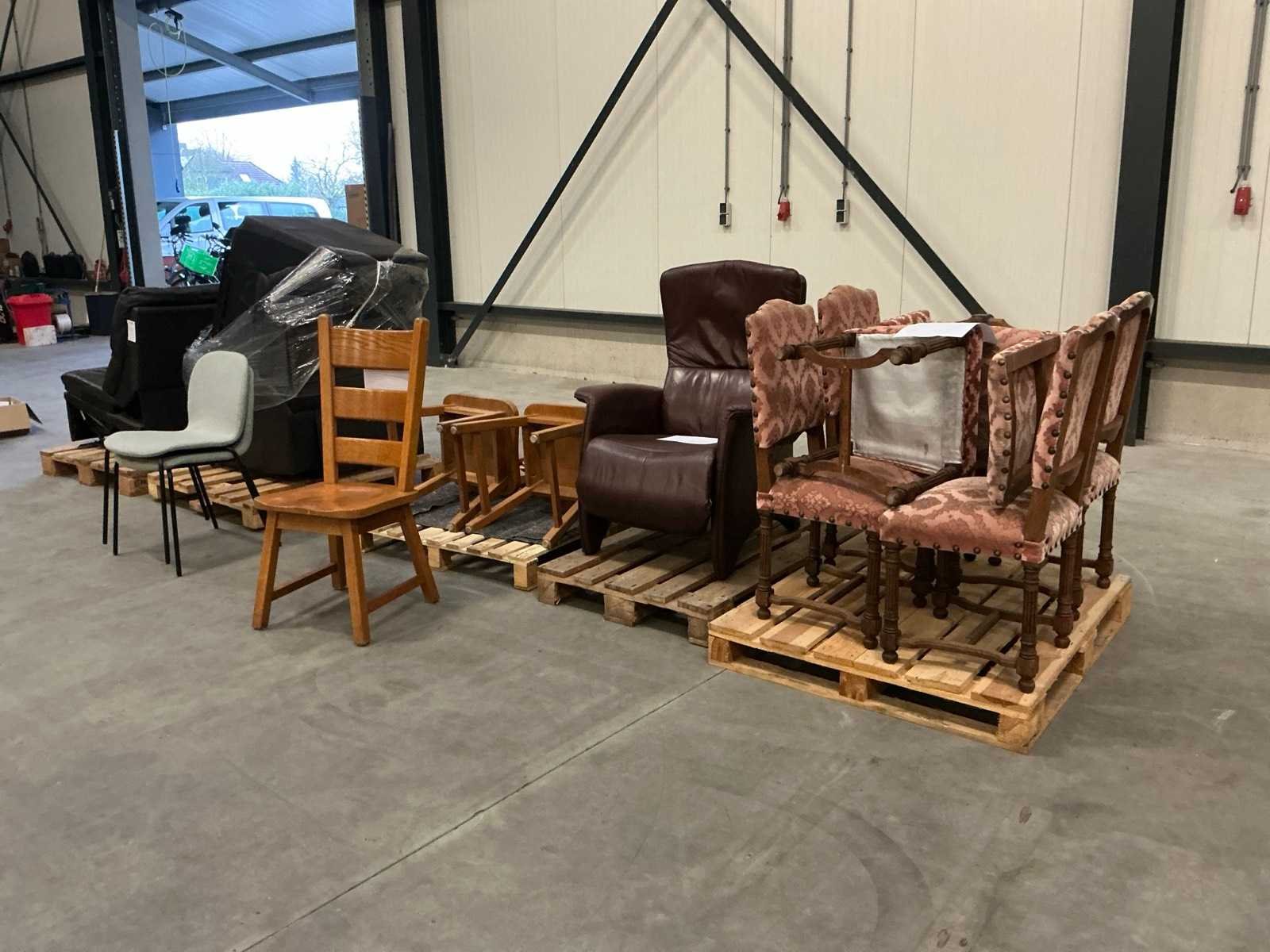 Bestaande uit 6x vintage stoel waarvan 1x beschadigde rugleuning; stofbekleed; 1x lederen relaxstoel; 3x houten eetkamerstoel; 2x stofbeklede stoel; 1x lederen 3-persoons zitbank