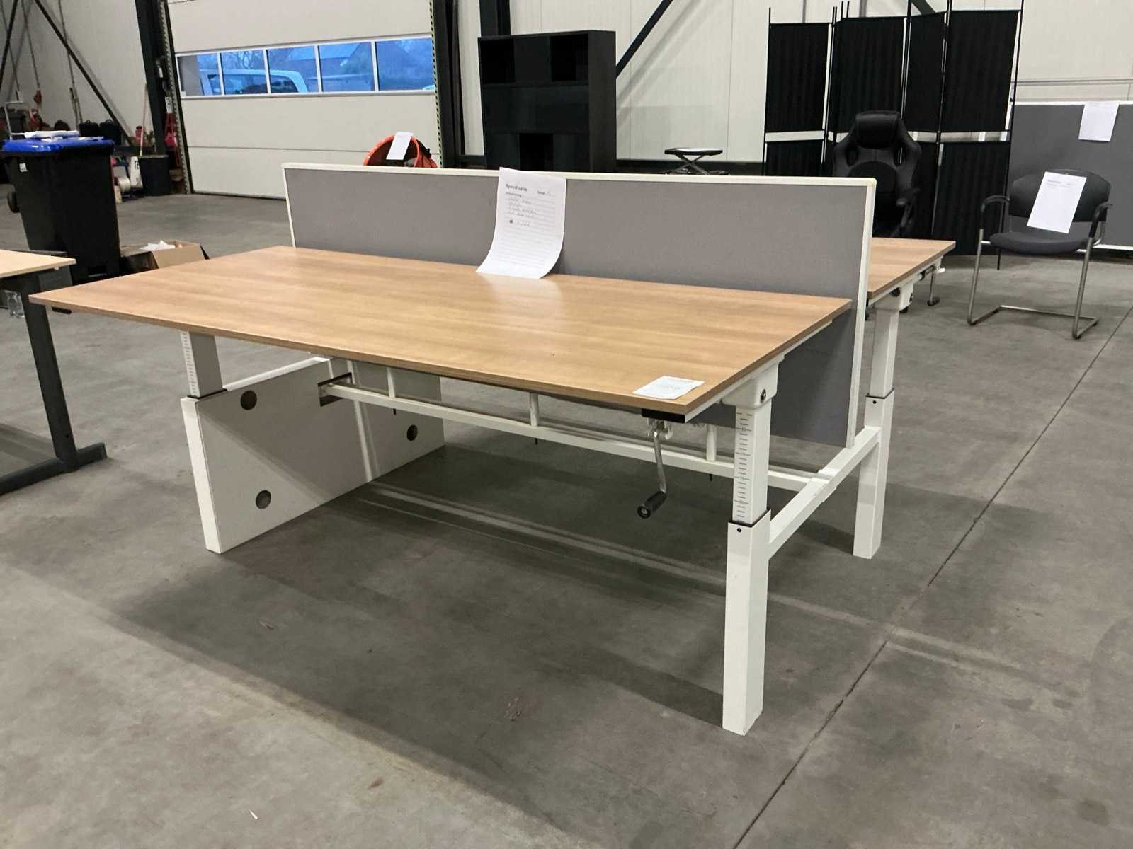 Dubbele bureau; in hoogte verstelbaar; tafelblad 180x80; 3x bureau reeds gedemonteerd Lengte: 180cm Breedte: 170cm Hoogte: 108cm