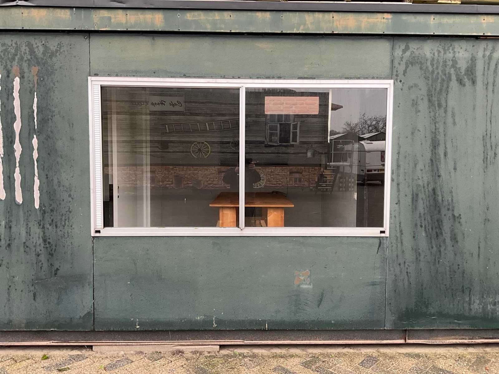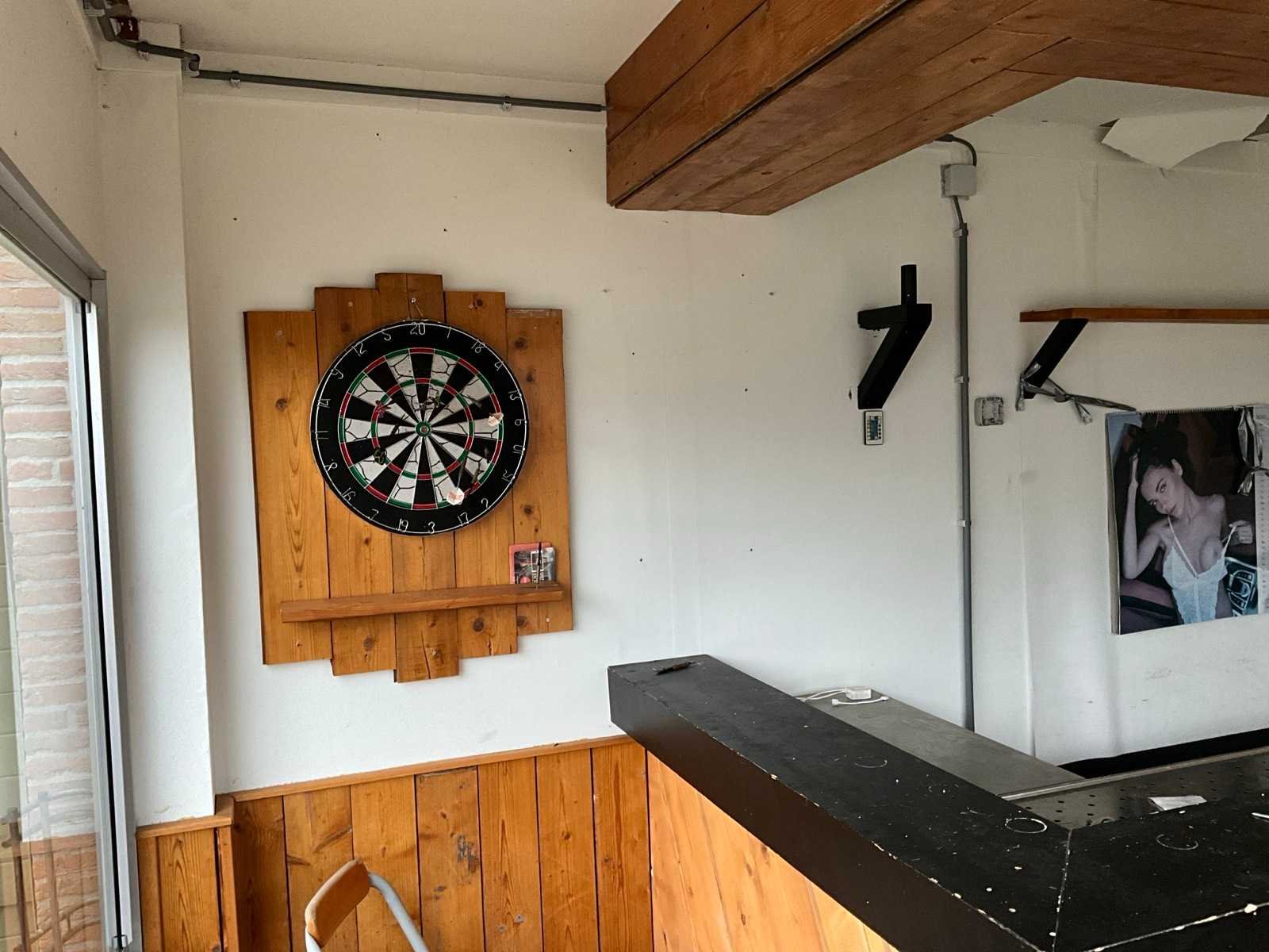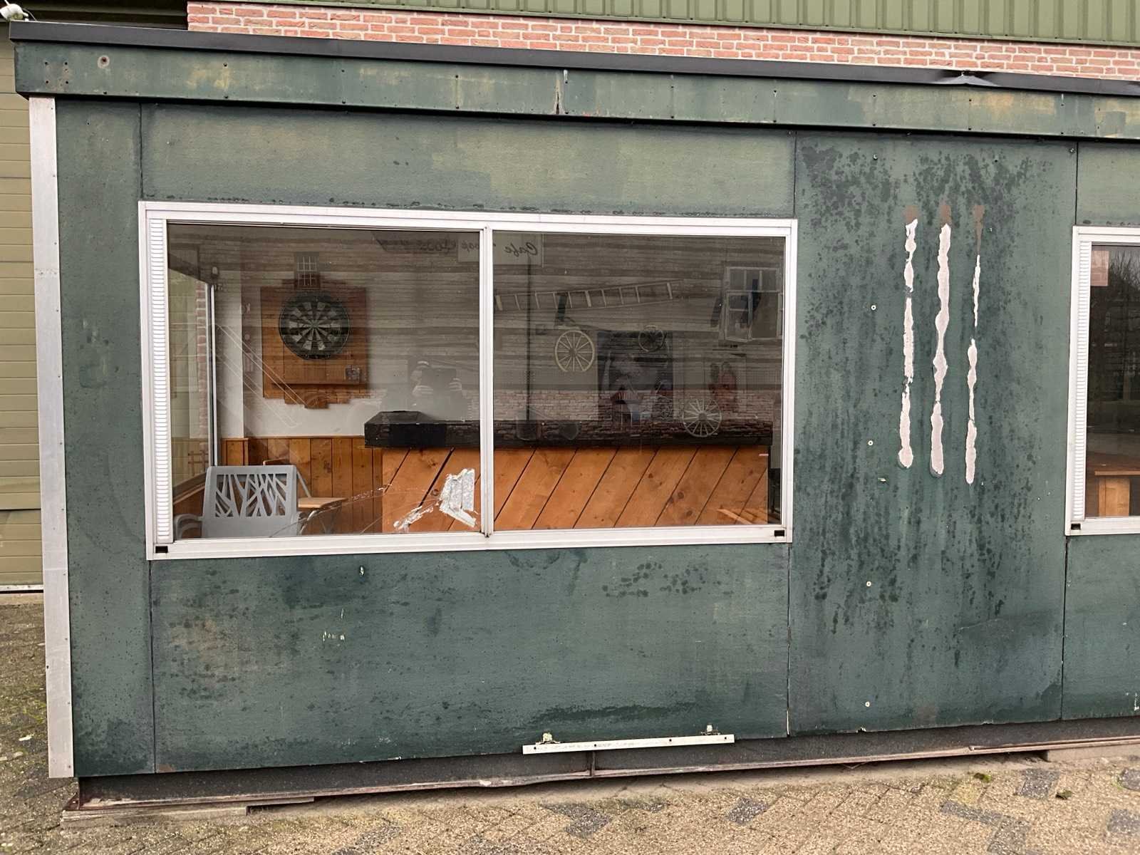 Voorzien van 3 afsluitbare vertrekken, eerste verstrek met keukenblok en wasbak, tweede vertrek met tafel en Samsung televisie, derde vertrek met 2 schuifdeuren, houten bar inclusief bovenbouw en dartbord, 3 schuiframen Aantal ramen: 4 Totale afmeting L: 8600mm Totale afmeting Breedte: 2900mm Totale afmeting Hoogte: 2780mm