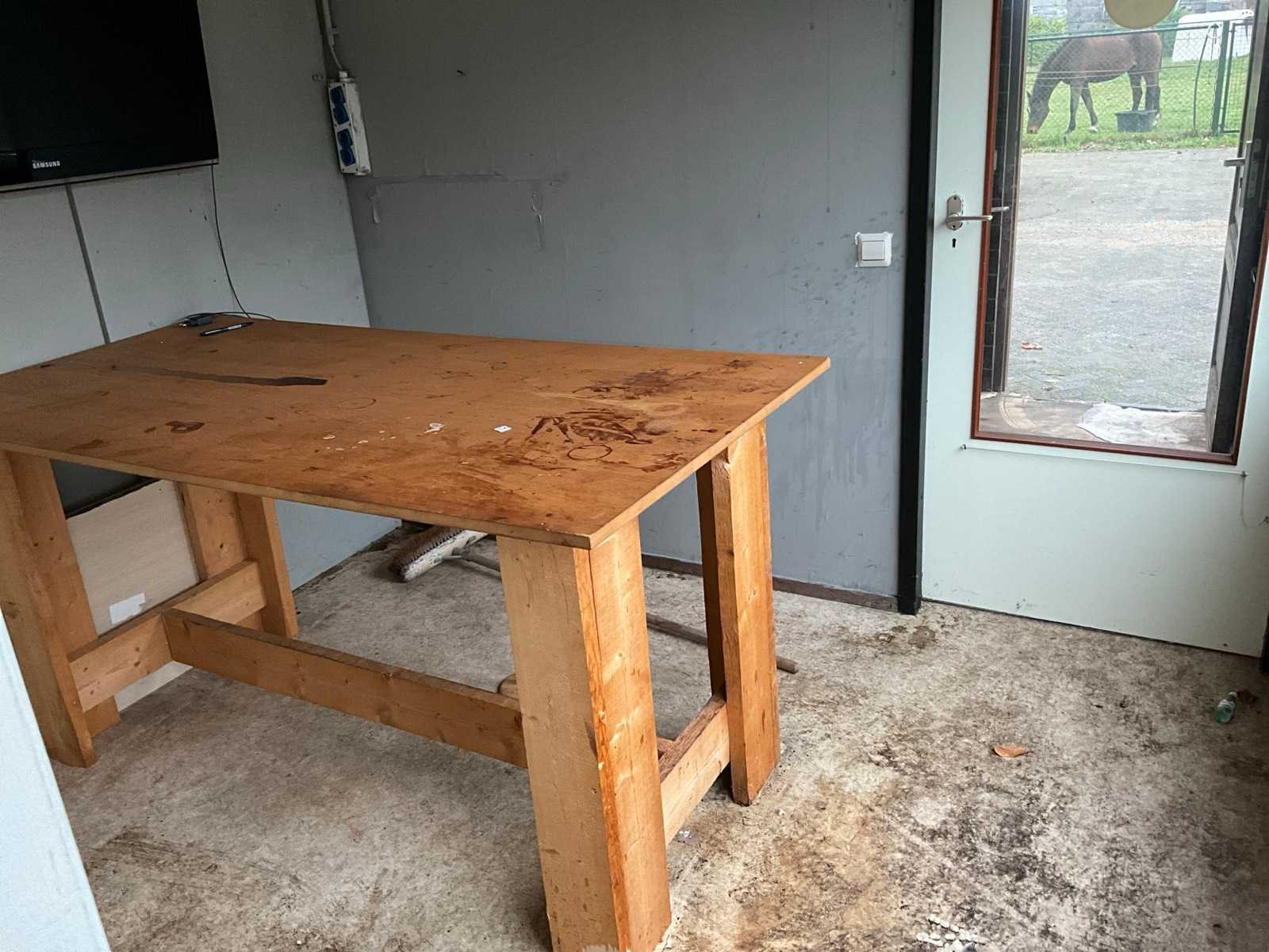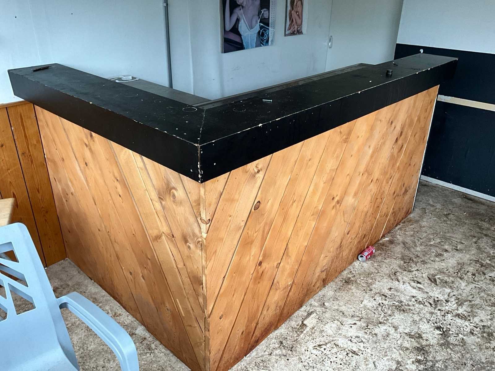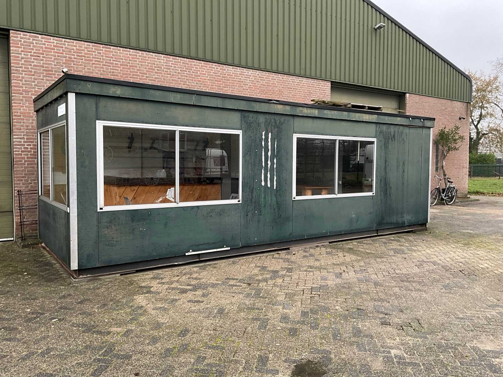 Voorzien van 3 afsluitbare vertrekken, eerste verstrek met keukenblok en wasbak, tweede vertrek met tafel en Samsung televisie, derde vertrek met 2 schuifdeuren, houten bar inclusief bovenbouw en dartbord, 3 schuiframen Aantal ramen: 4 Totale afmeting L: 8600mm Totale afmeting Breedte: 2900mm Totale afmeting Hoogte: 2780mm