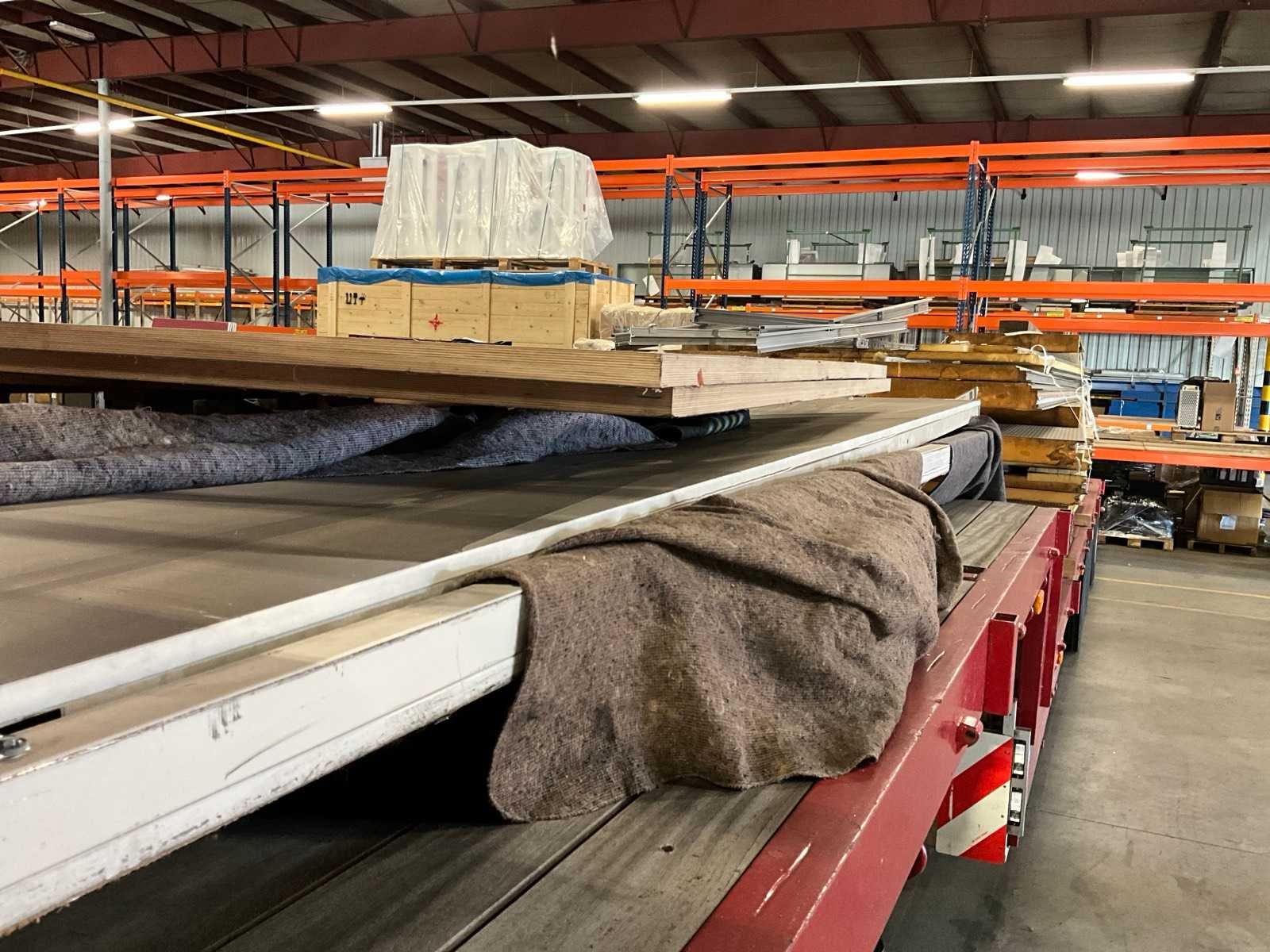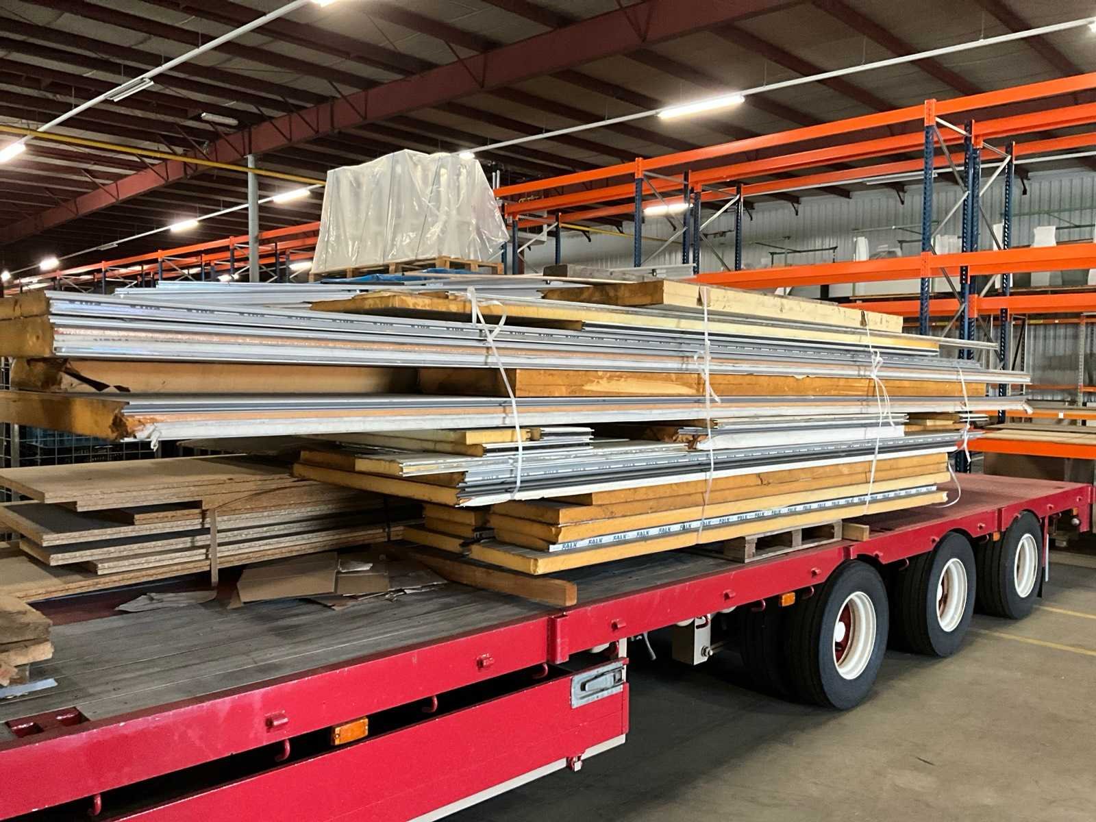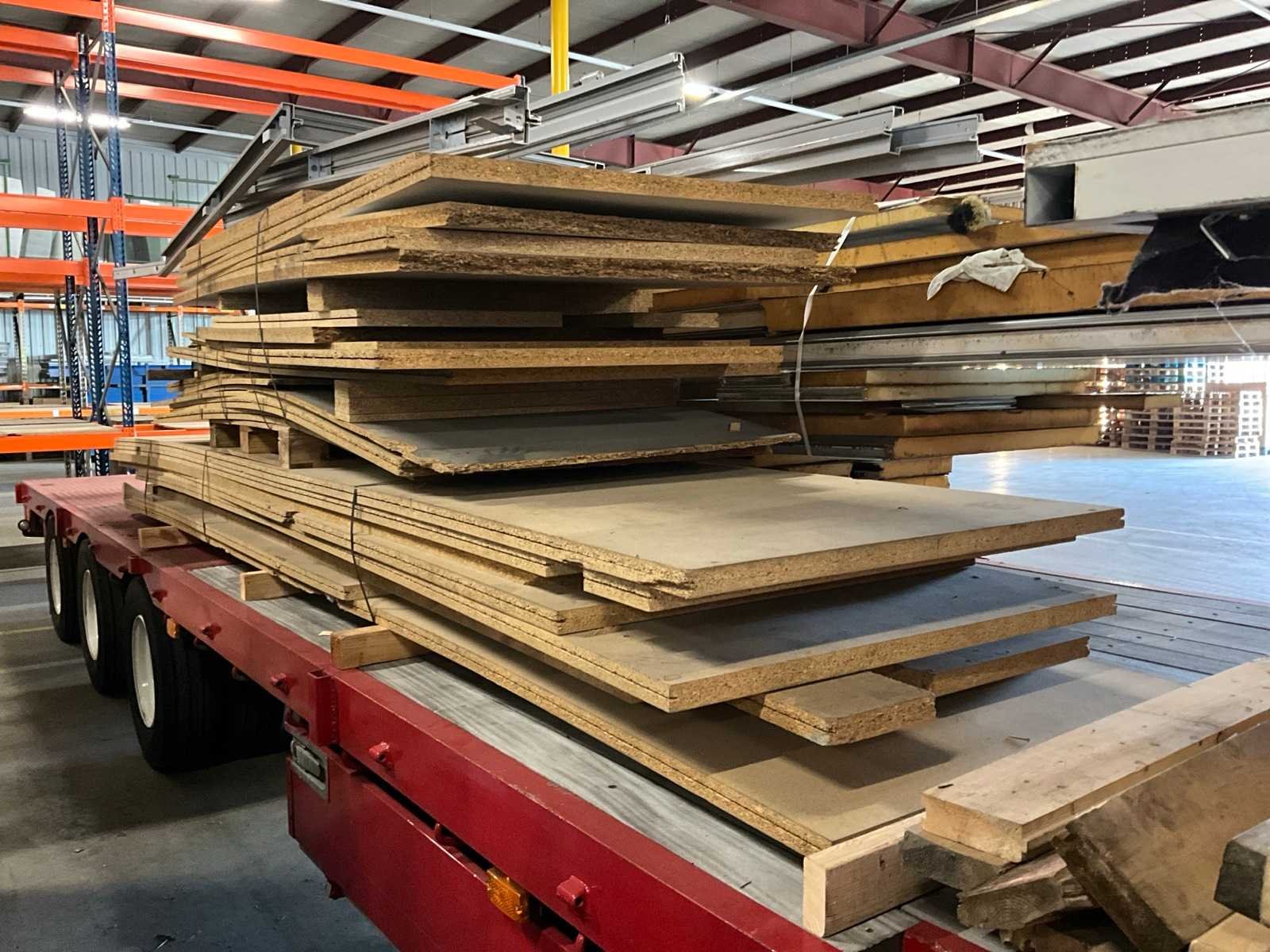 Waaronder geïsoleerde wandpanelen in diverse afmetingen, partij spaanplaat breedte 100 cm, dikte 4 cm in diverse lengtes , 2 stuks multiplex plaat met aluminium belkleding afmeting 188x216x4cm en 2 stuks fotobord met stalen frame( komplete inhoud trailer)