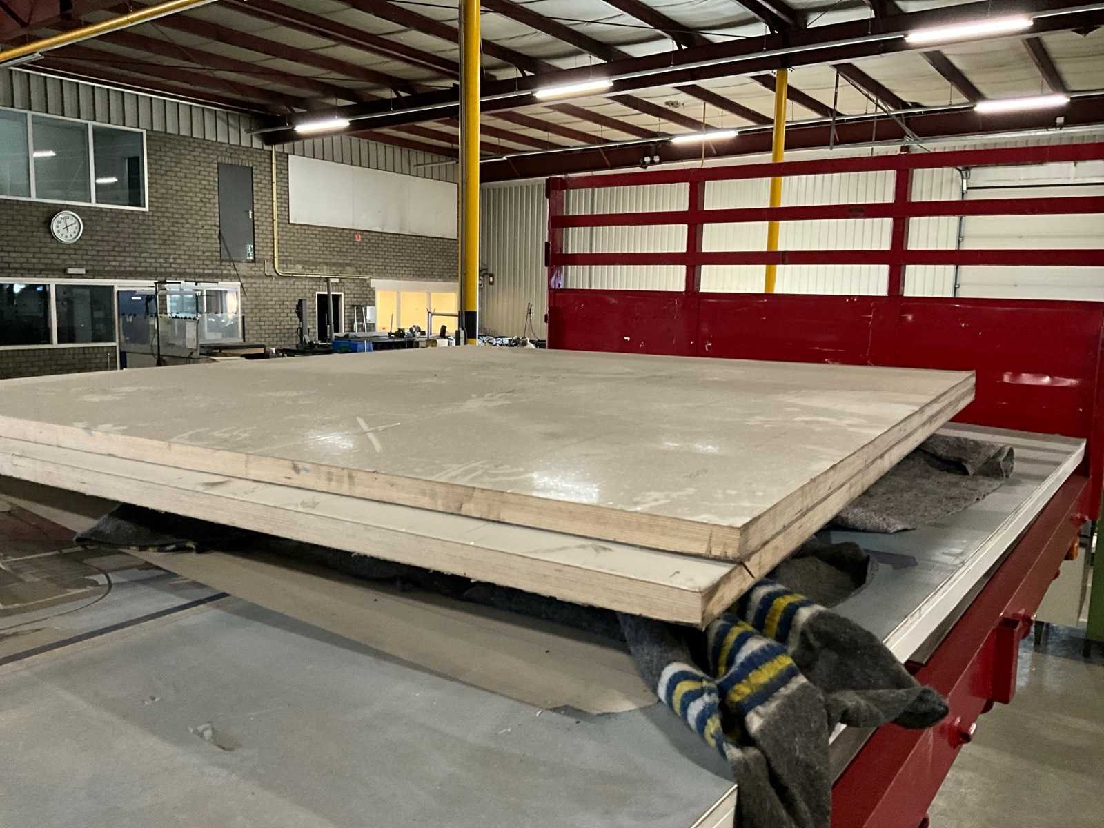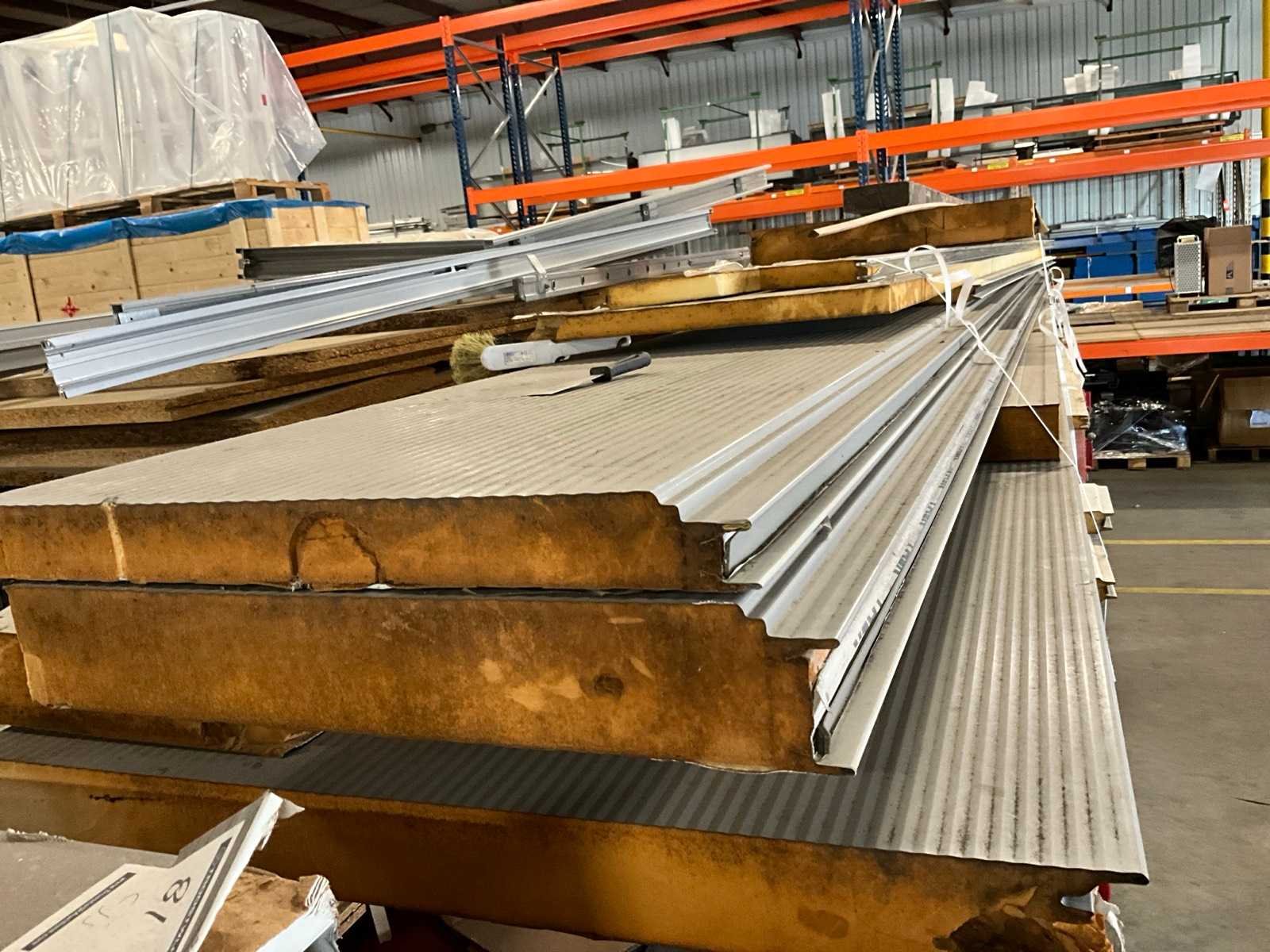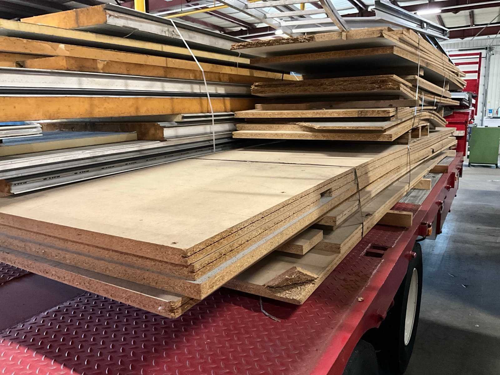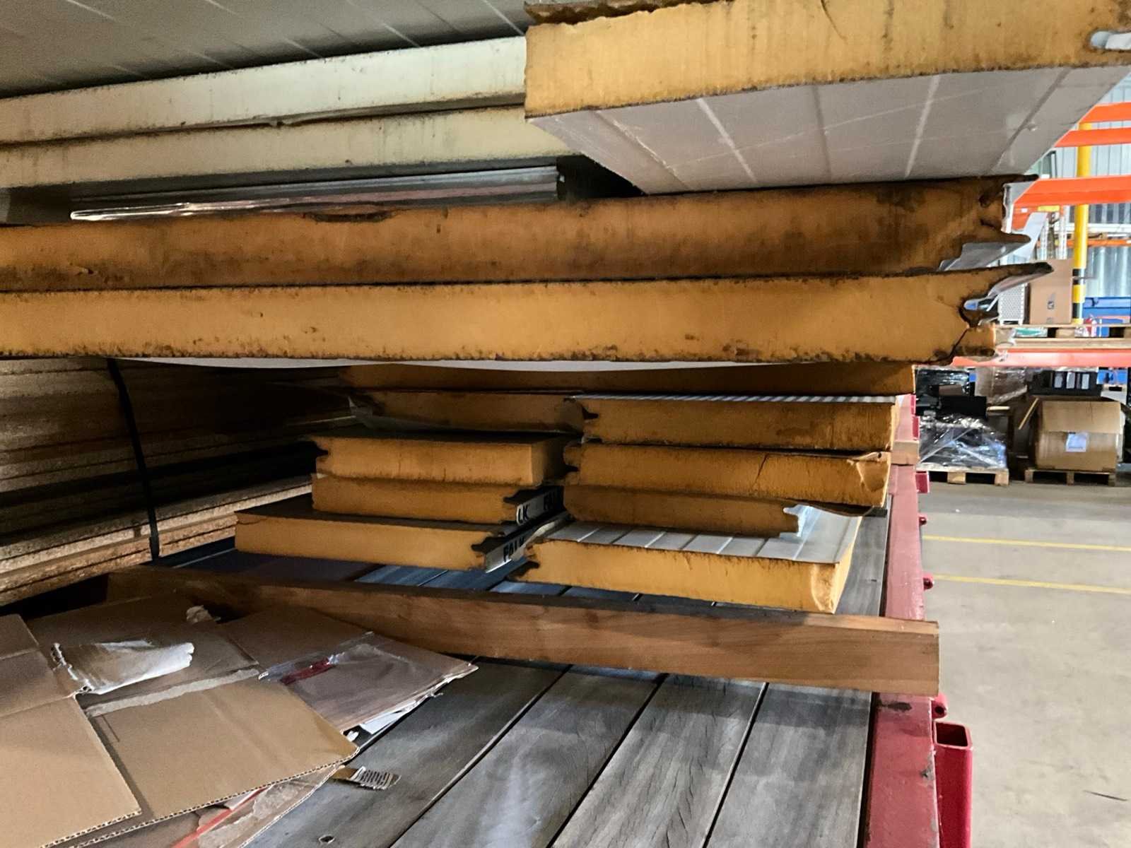 Waaronder geïsoleerde wandpanelen in diverse afmetingen, partij spaanplaat breedte 100 cm, dikte 4 cm in diverse lengtes , 2 stuks multiplex plaat met aluminium belkleding afmeting 188x216x4cm en 2 stuks fotobord met stalen frame( komplete inhoud trailer)
