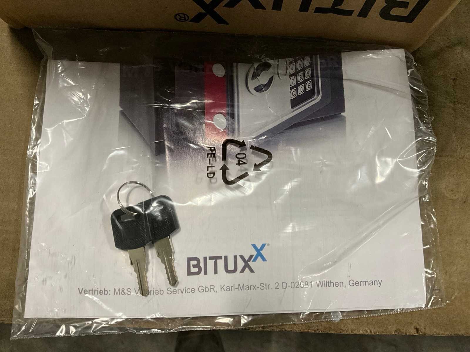 Ongebruikt in verpakking Merk: Bitux Model: Mini safe Product type: MS-12667 Lengte: 17cm Breedte: 23cm Hoogte: 17cm