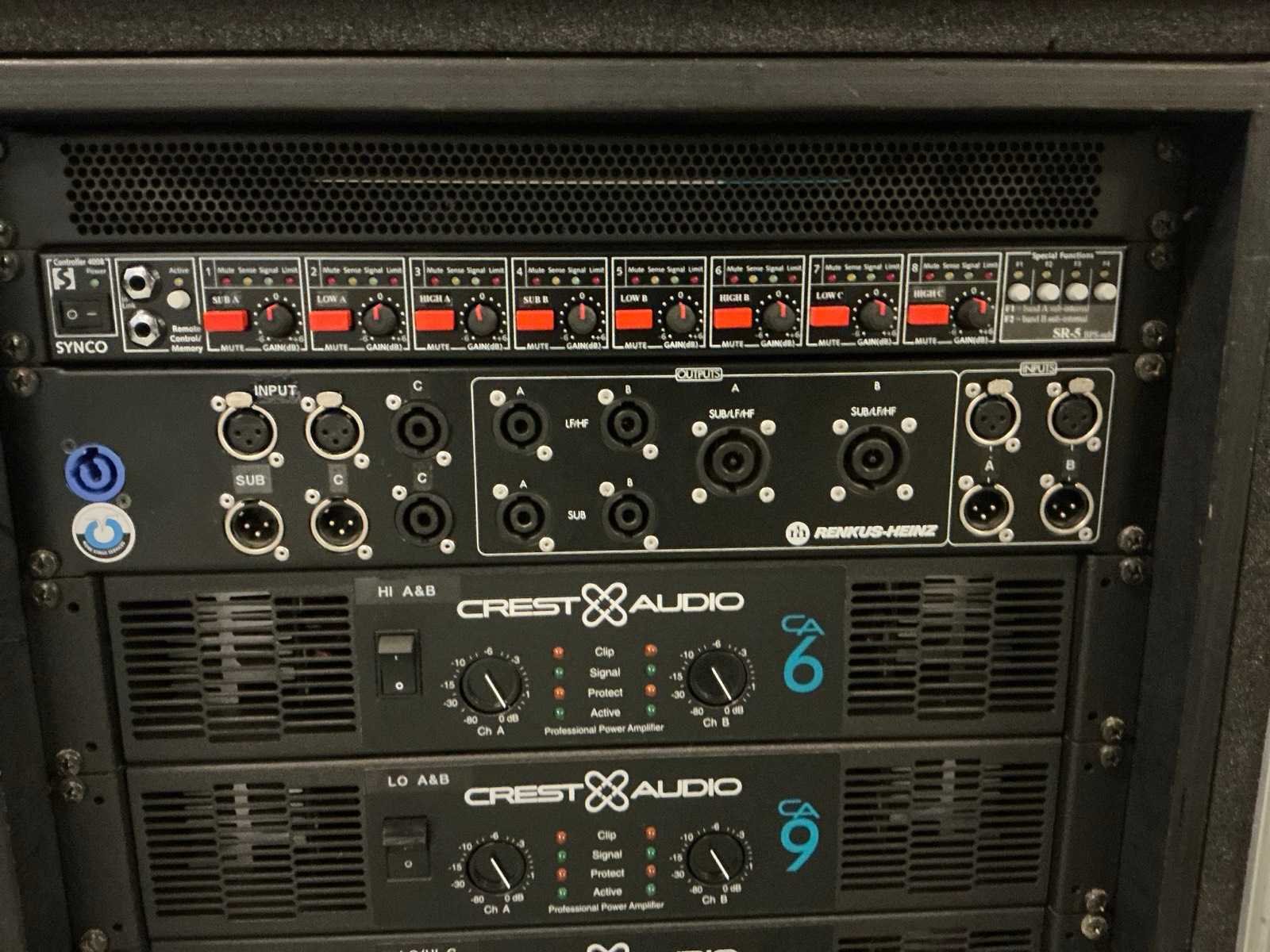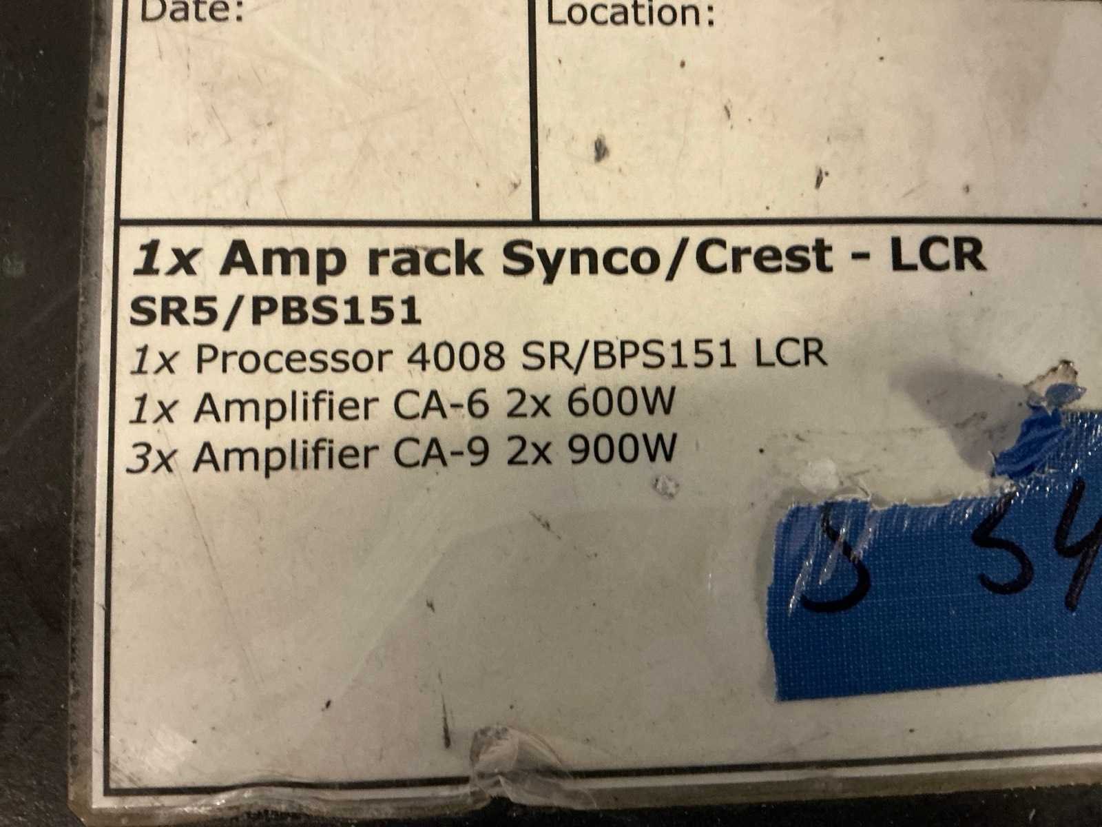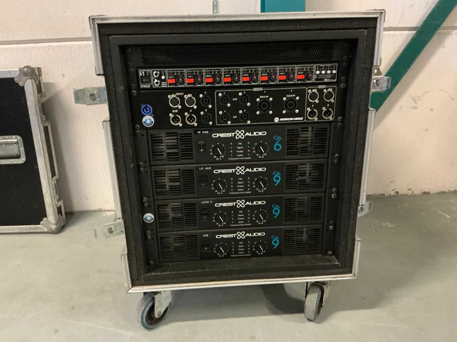 Synco 4008 en Crest Ca6 3x CA9 LCR rack for SR/BPS151; in case ( 75x58x78cm) Merk: Synco/Crest Eindversterker: true