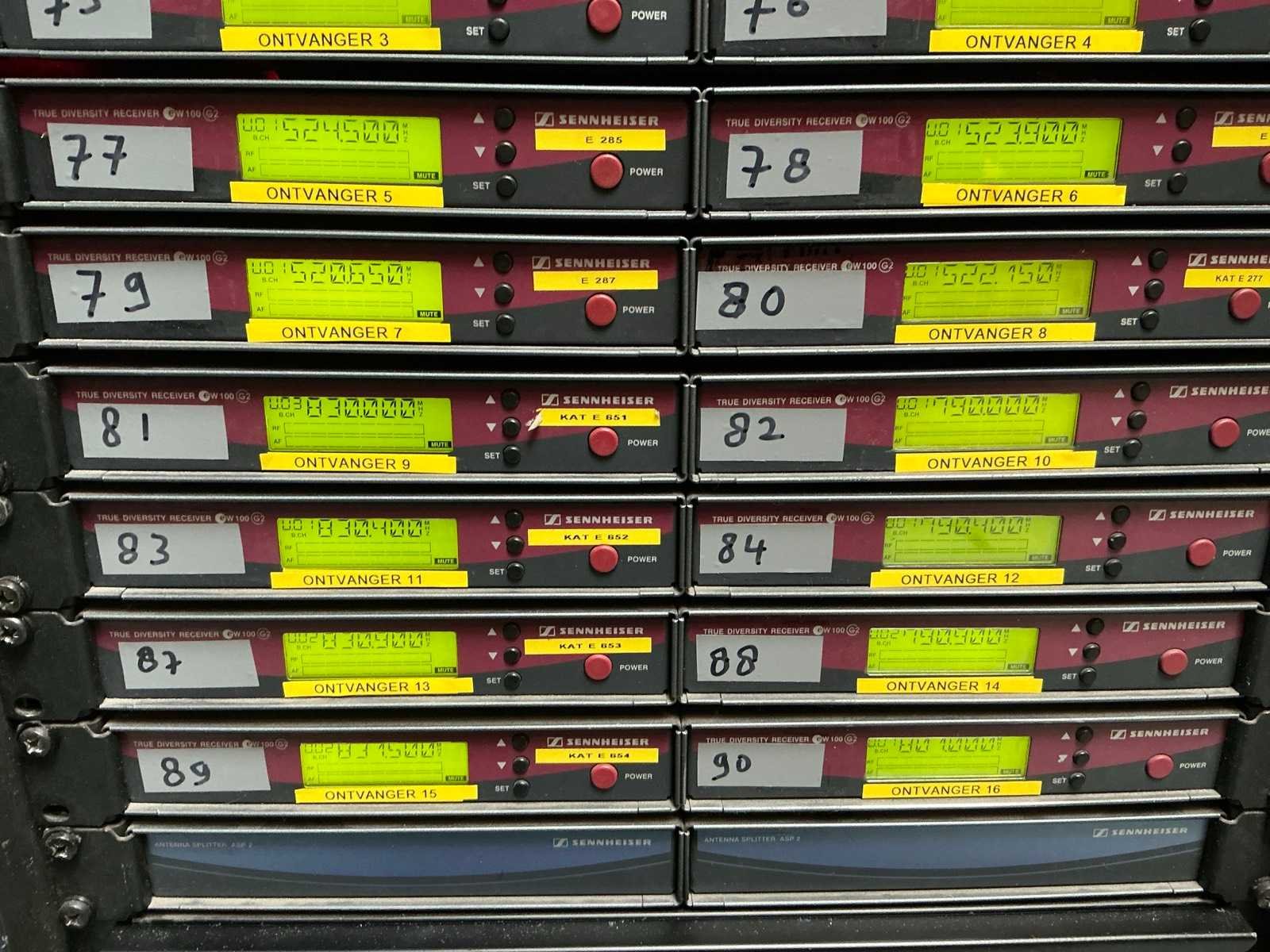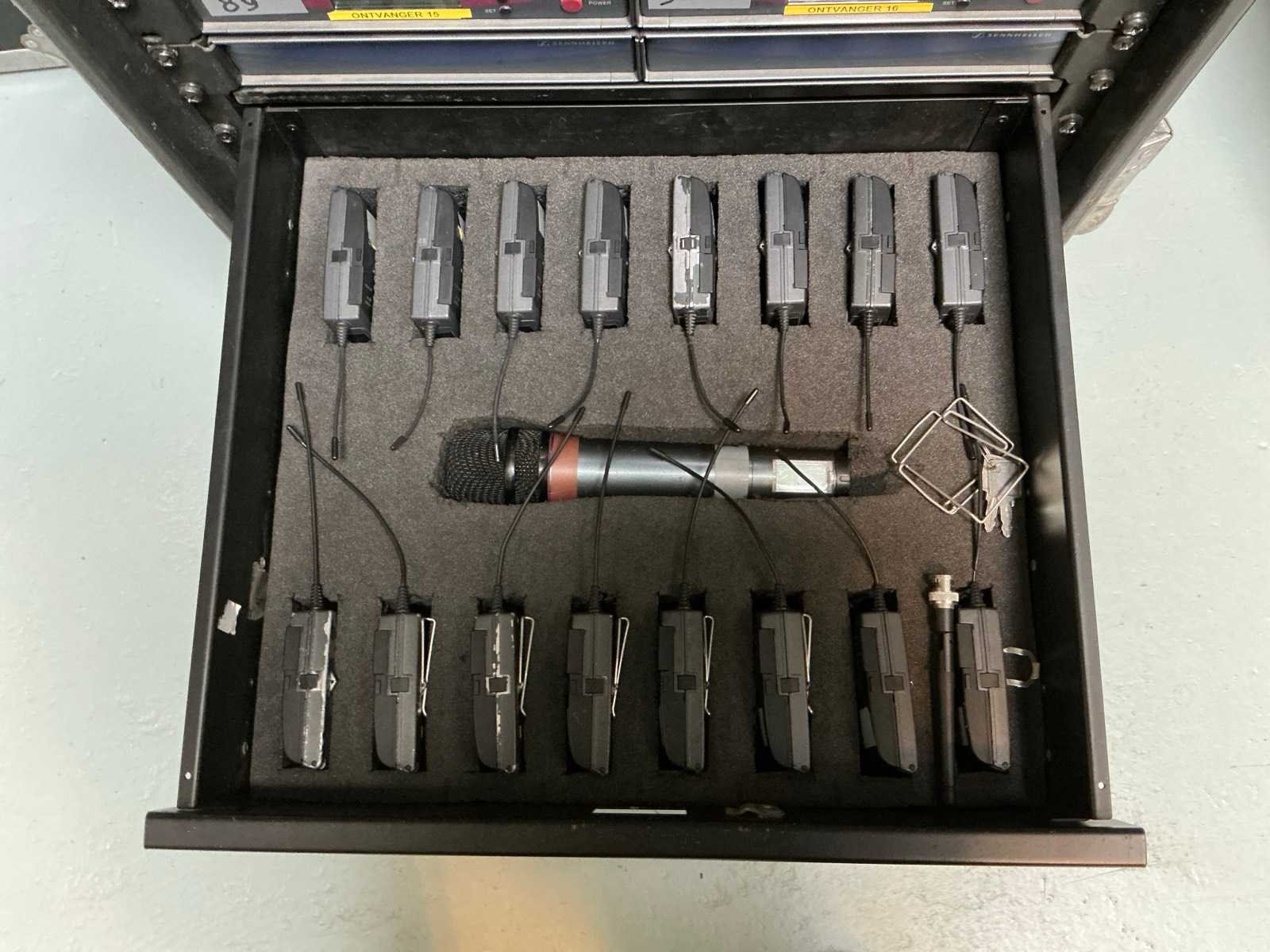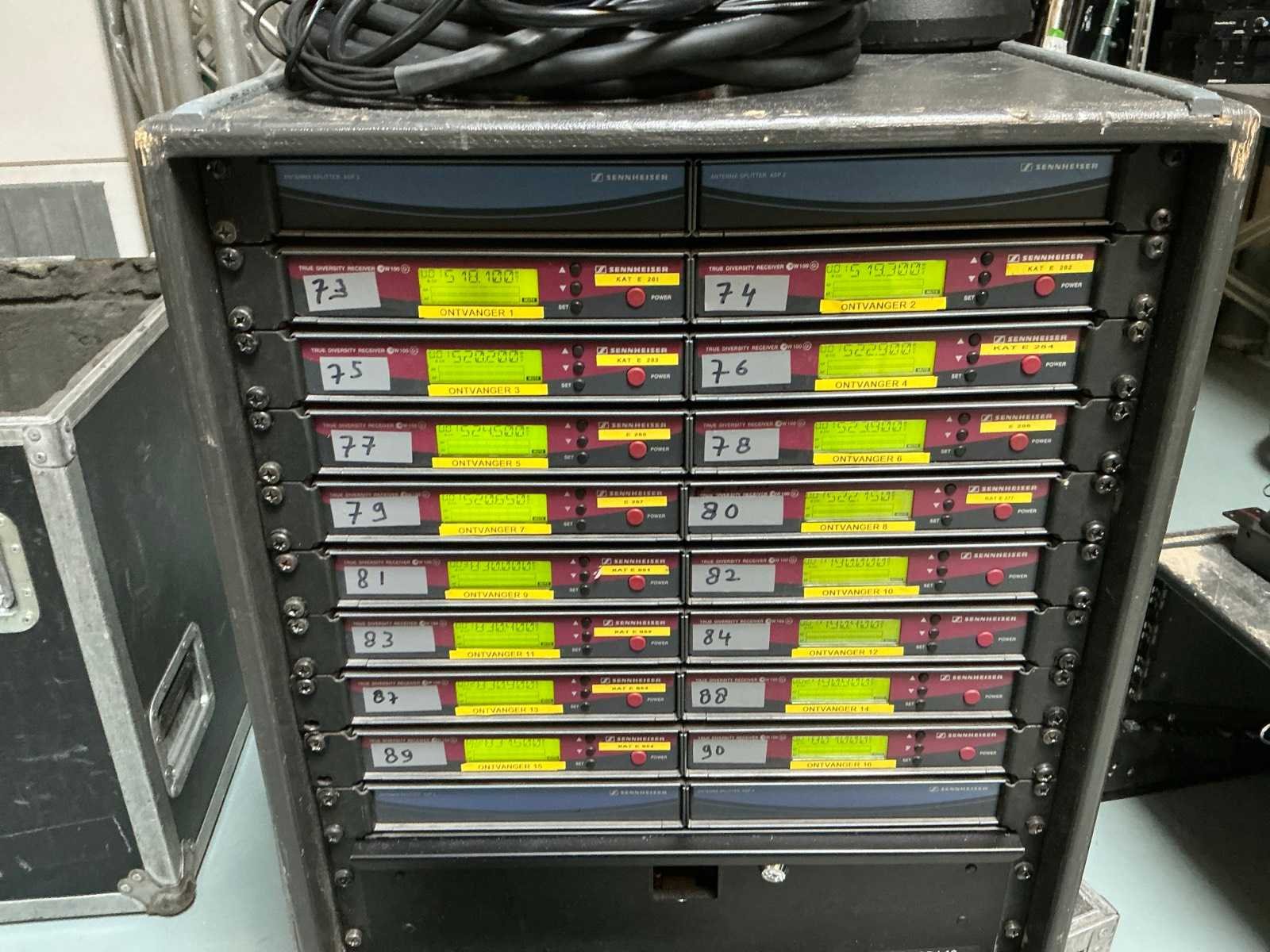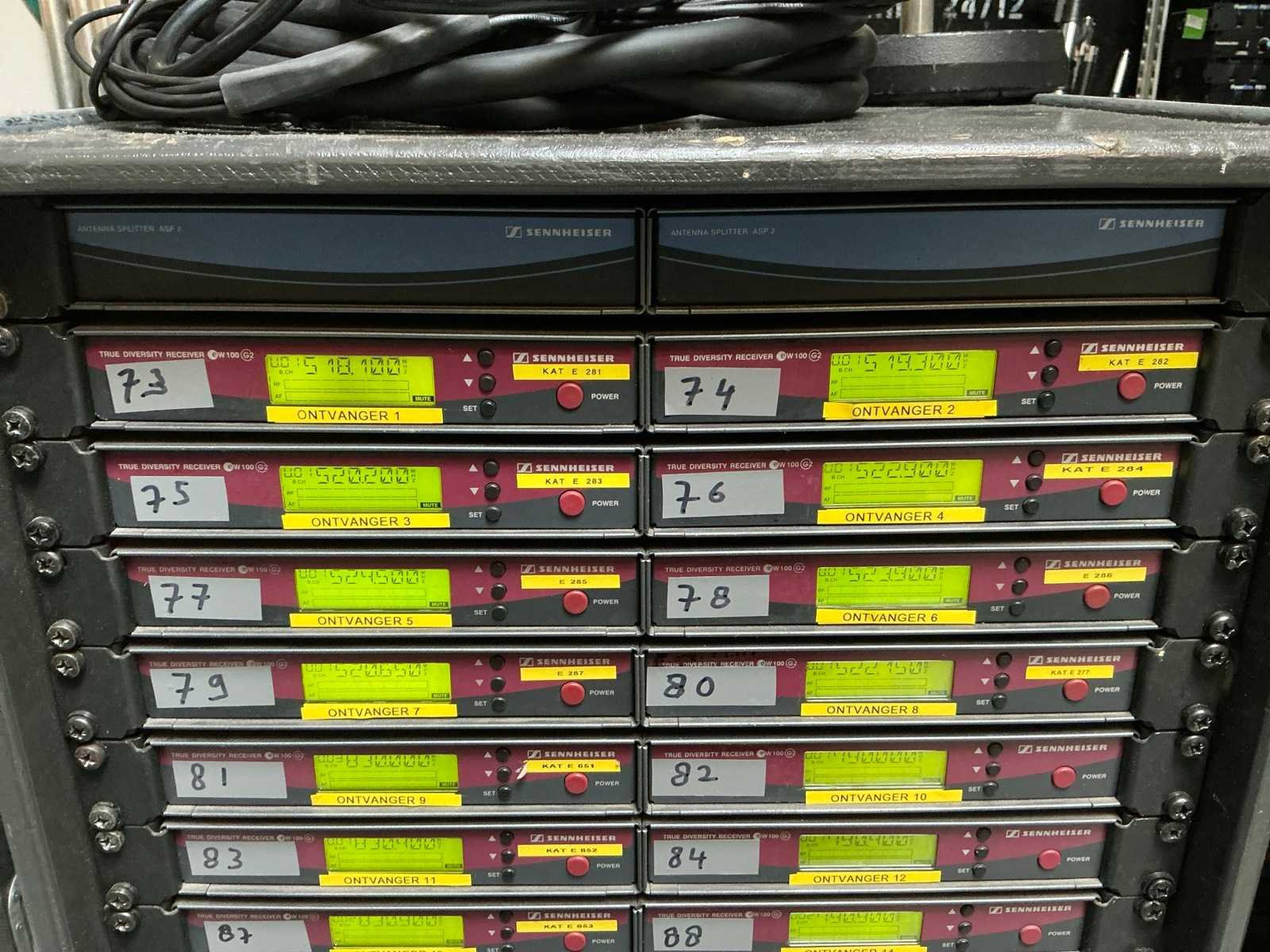 16 kanaals rack met splitters antennes en 16 3pin belts ranges A D and E Merk: Sennheiser