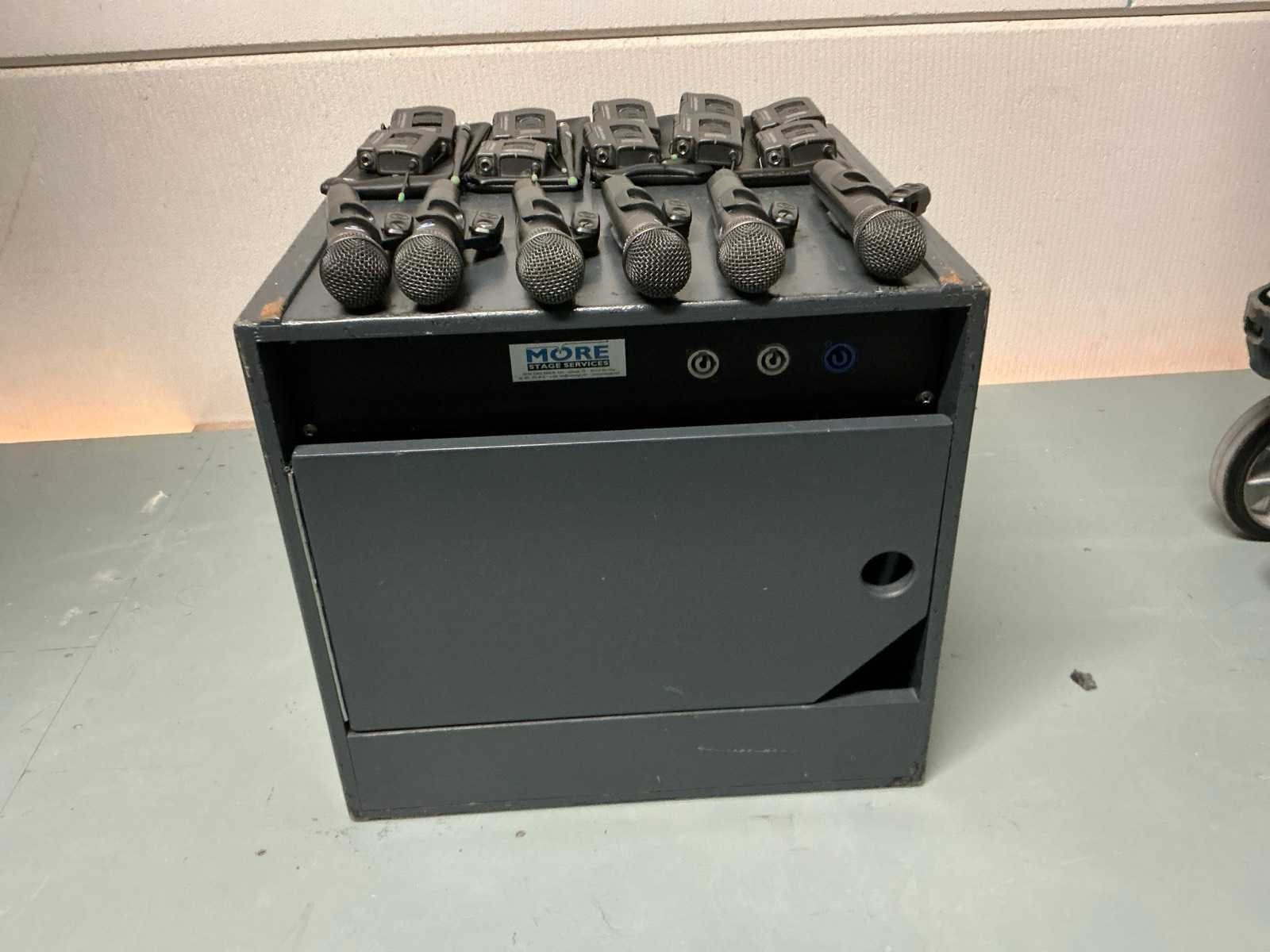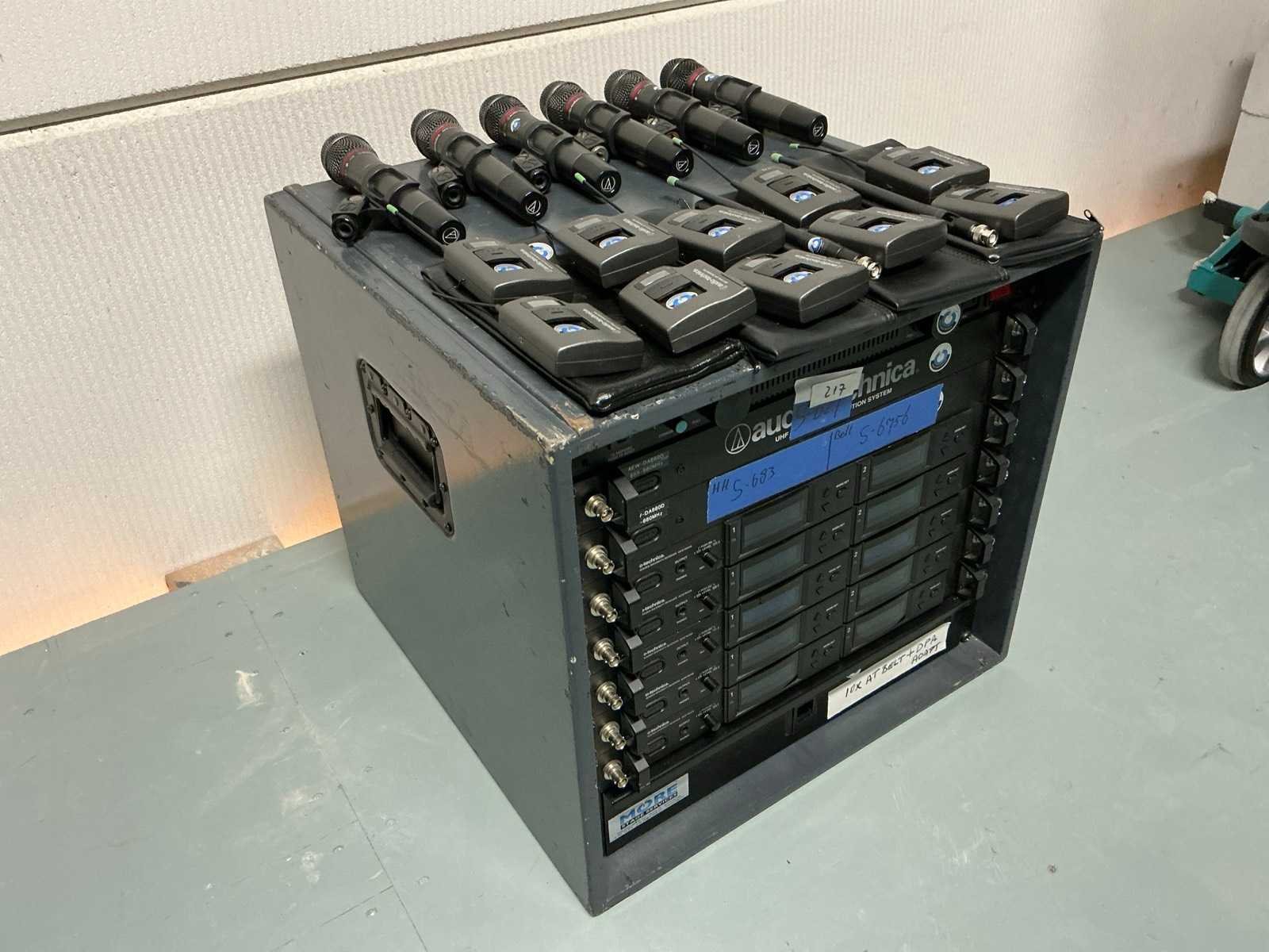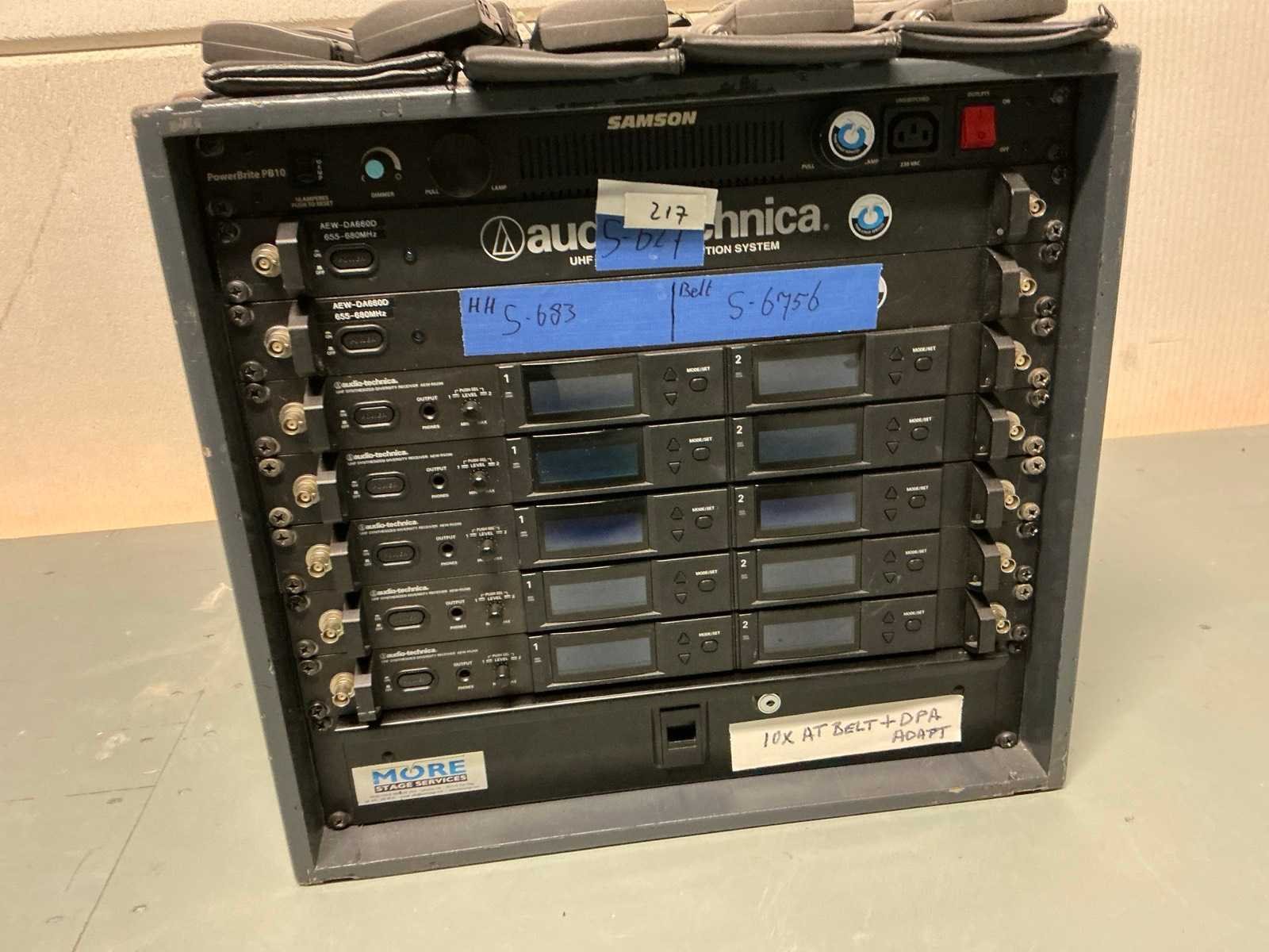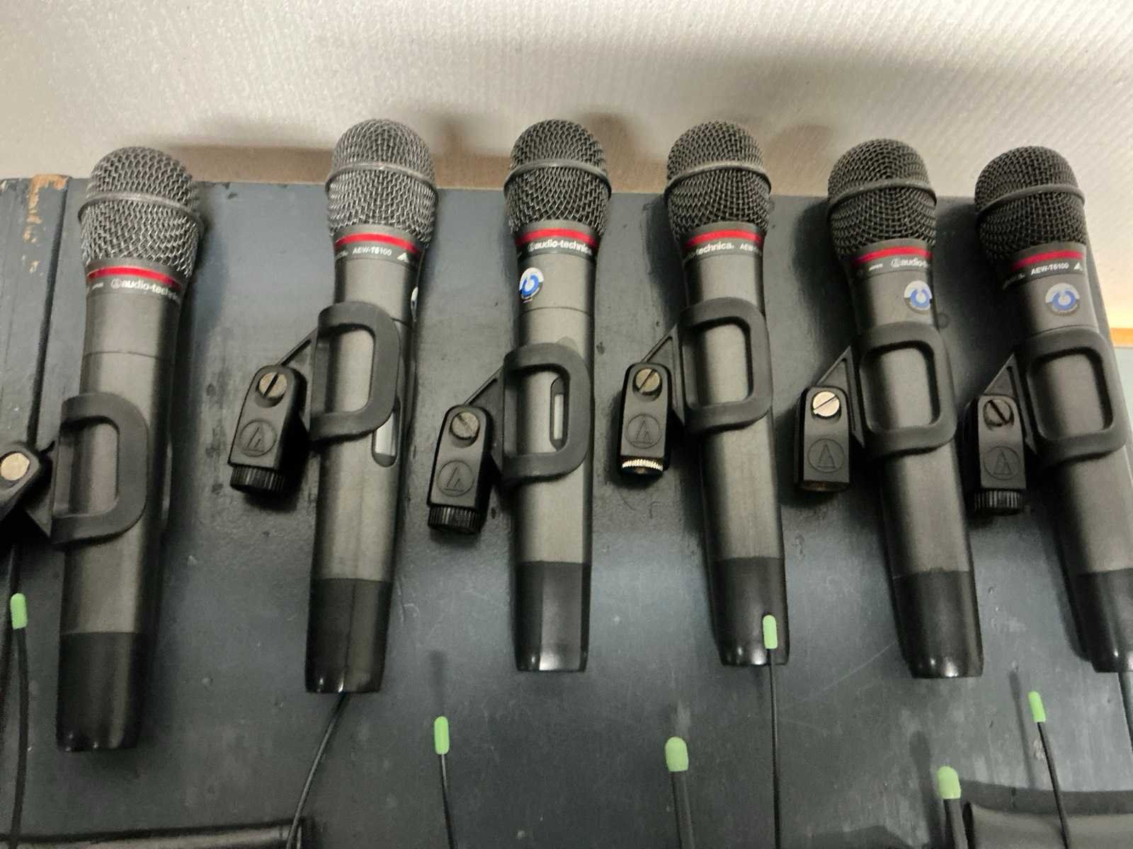10 kanaals set met 10 beltpacks en 6 handhelds 655-680MHz en 5 microfoons, 4 kabels. Merk: Audio Technica