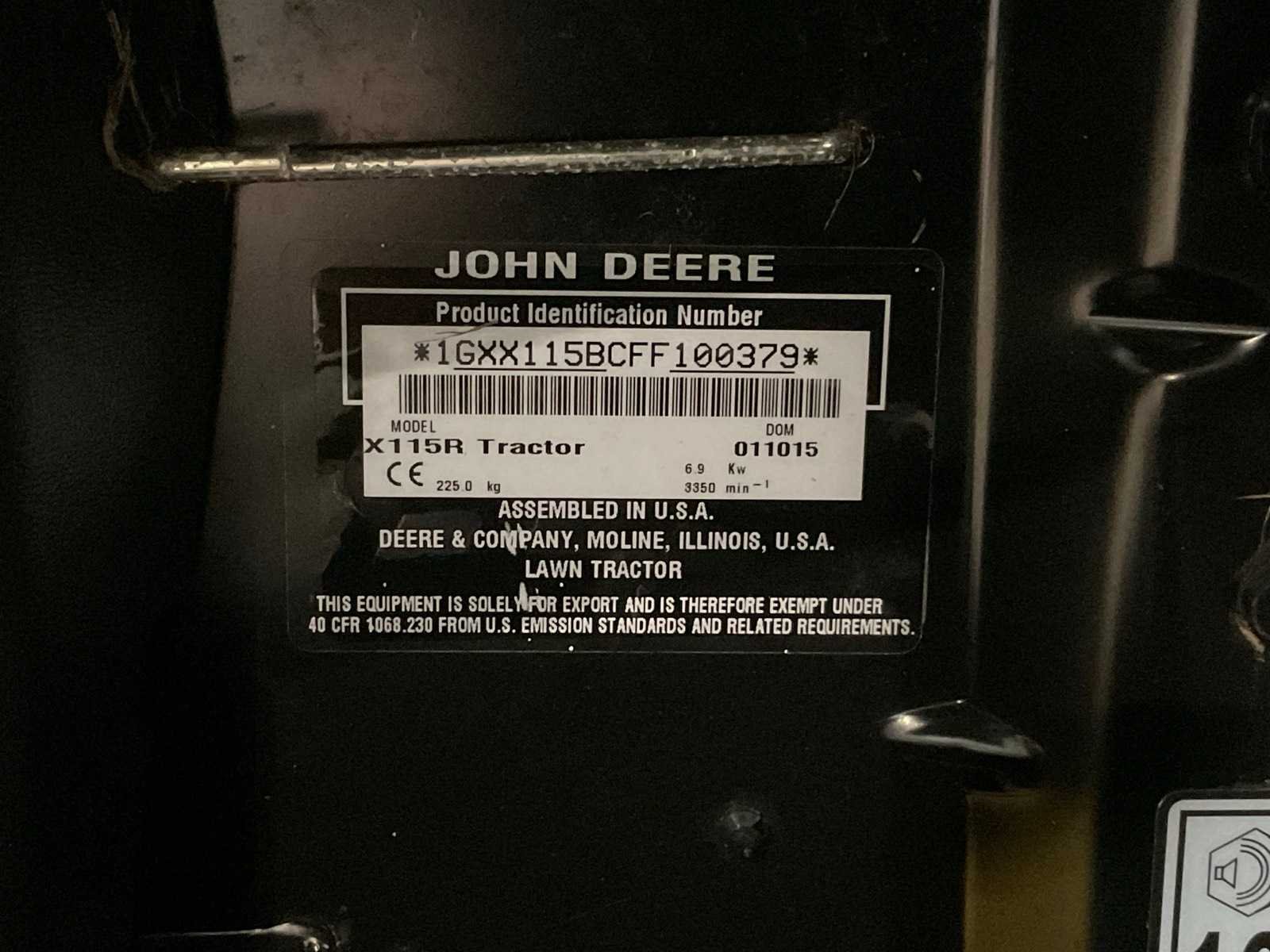 Voorzien van John Deere benzinemotor Merk: John Deere Type: X115R Bouwjaar: 2015 Serienummer: 1GXX115BCFF100379 Werkbreedte: 900mm Zelfrijdend: true Zitmaaier: true Benzinemotor: true Brandstof: Benzine Motorvermogen (kW): 6.9kW Opvang container: true Eigen gewicht: 225kg Totale afmeting L: 2500mm Totale afmeting Breedte: 1000mm Totale afmeting Hoogte: 1100mm