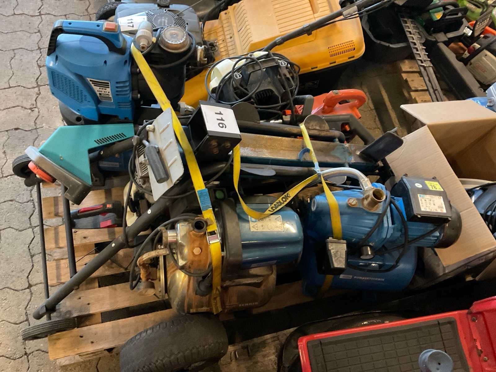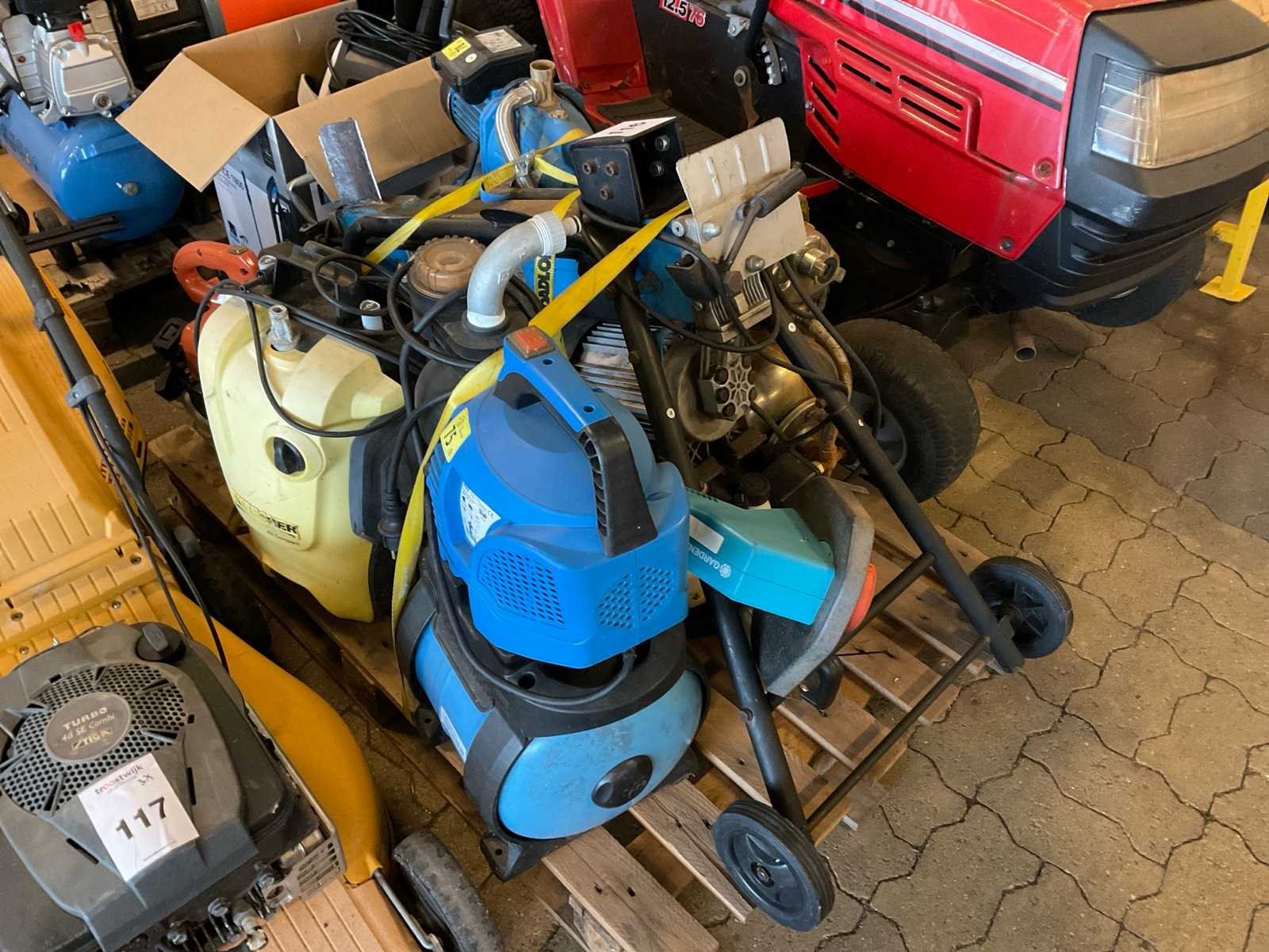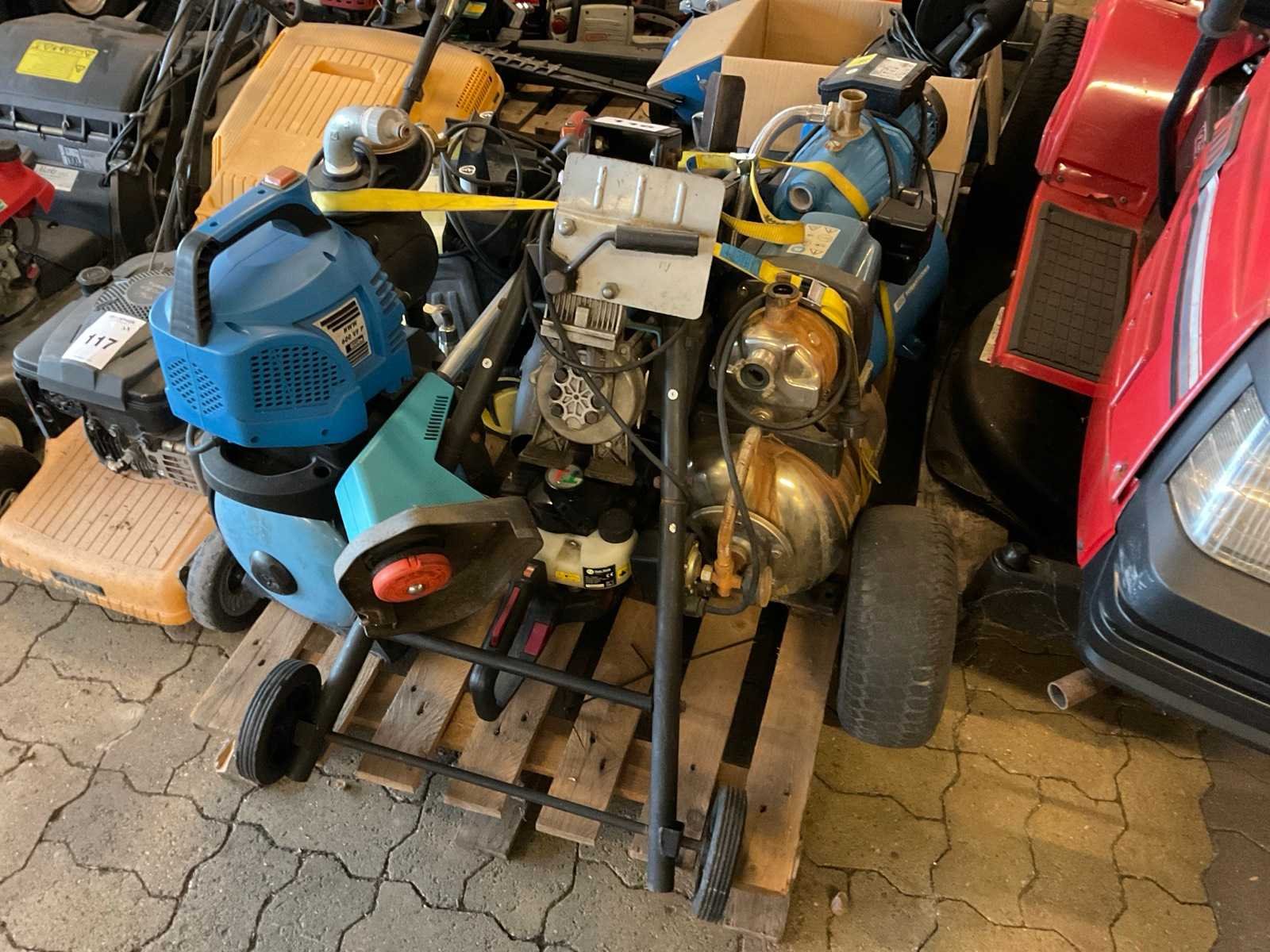 Waaronder 3x Güde hydrofoorpomp, Kärcher hogedrukspuit, kloofmachine, benzine bladblazer, etc