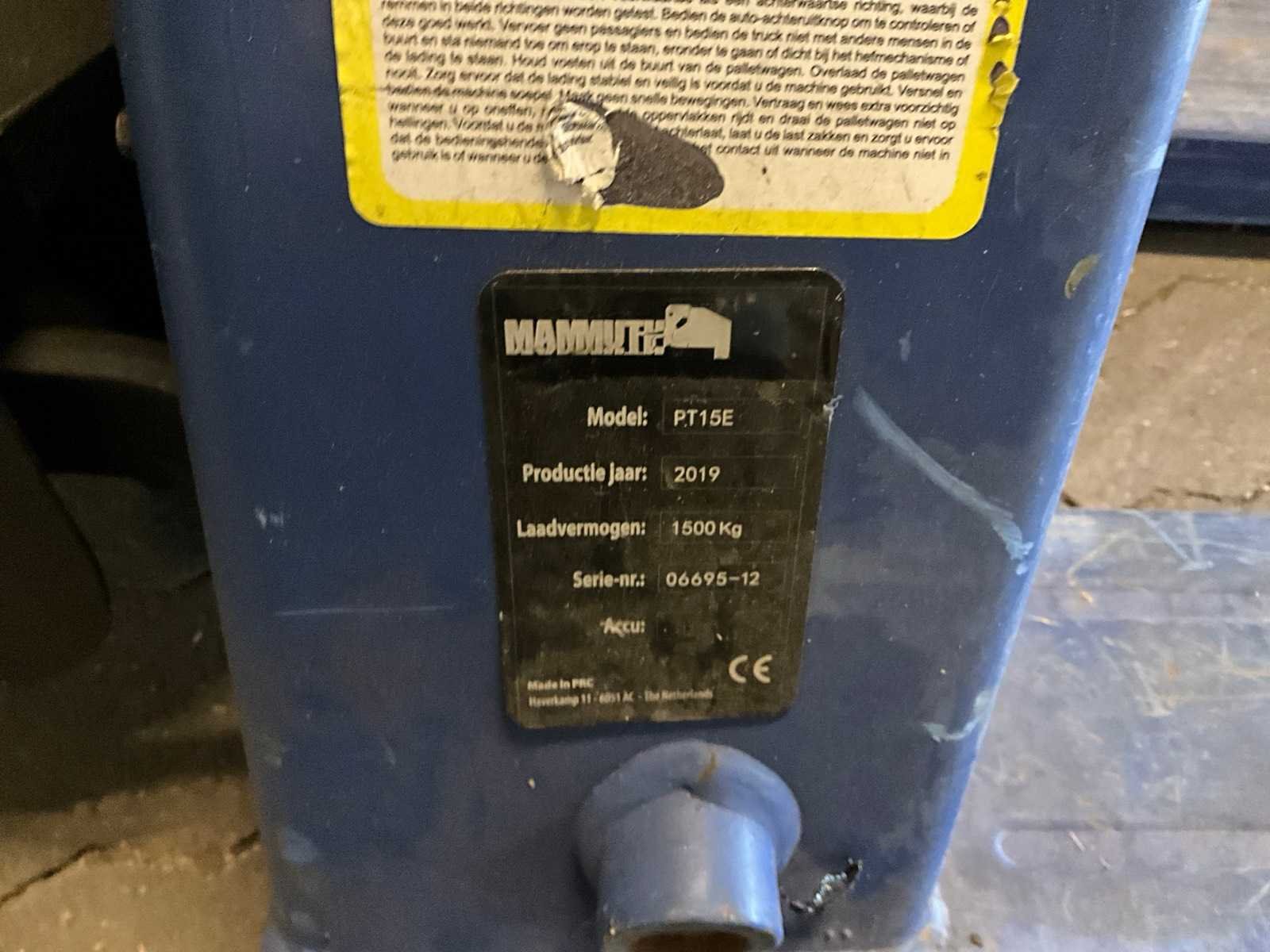 Merk: Mammut Type: PT115E Bouwjaar: 2019 Serienummer: 06695 Hefvermogen: 1500kg Lepellengte: 1150mm Totale afmeting L: 1550mm Totale afmeting Breedte: 550mm Totale afmeting Hoogte: 1320mm