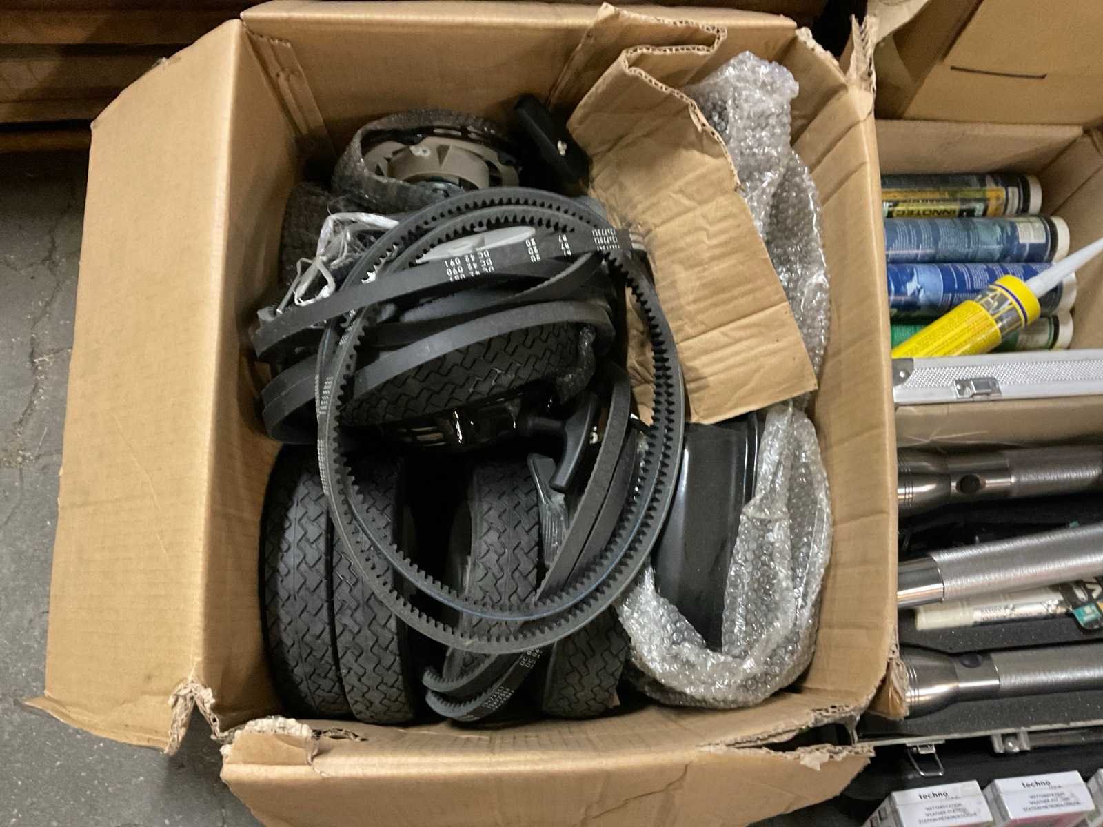Waaronder diverse aandrijfriemen, loopwielen, zaklampen, weerstations, afdekkleden voor gazonmaaiers, slanghaspel, Loctite Framento roest behandeling, magazijnbakken, tubes kit