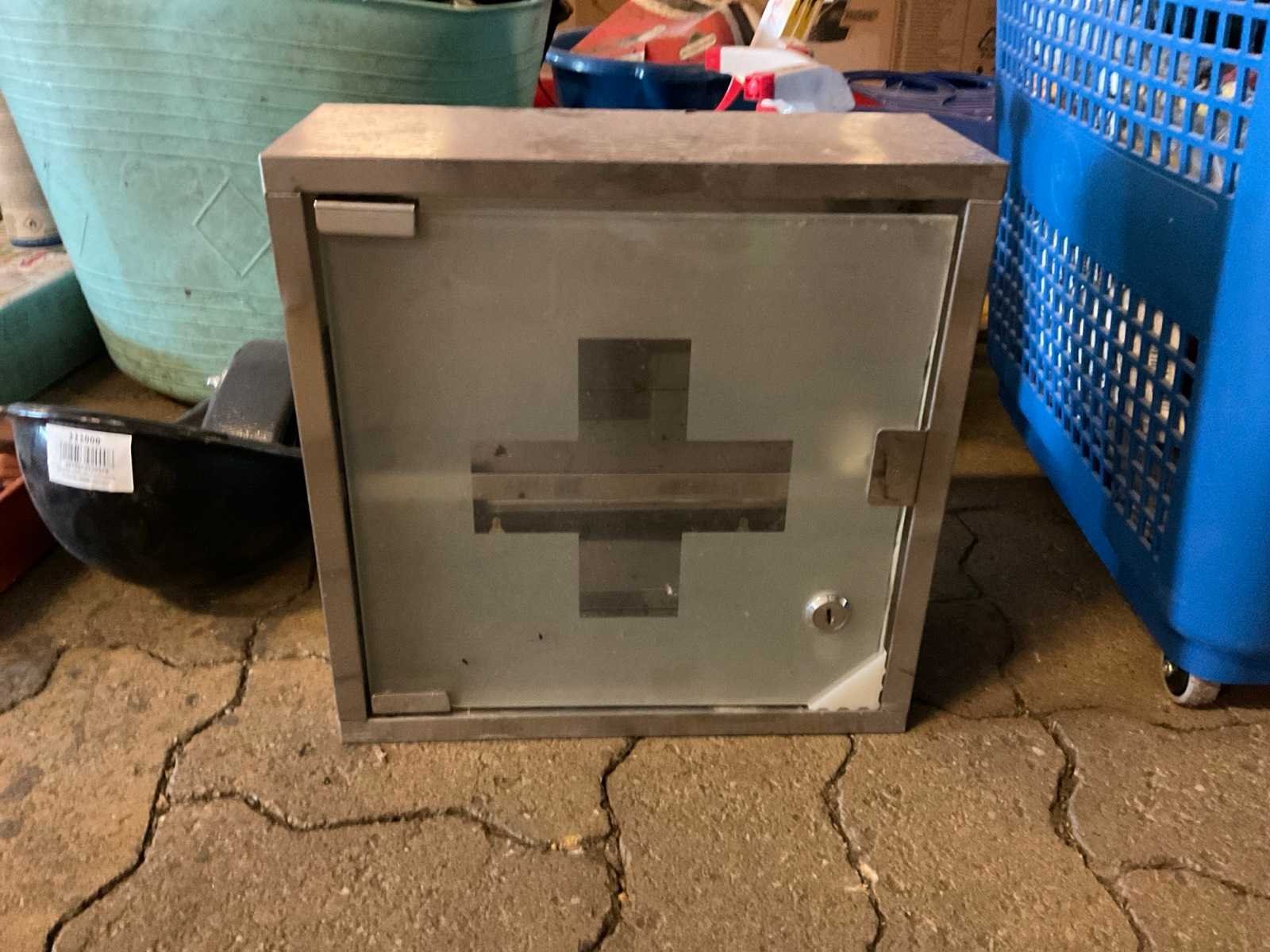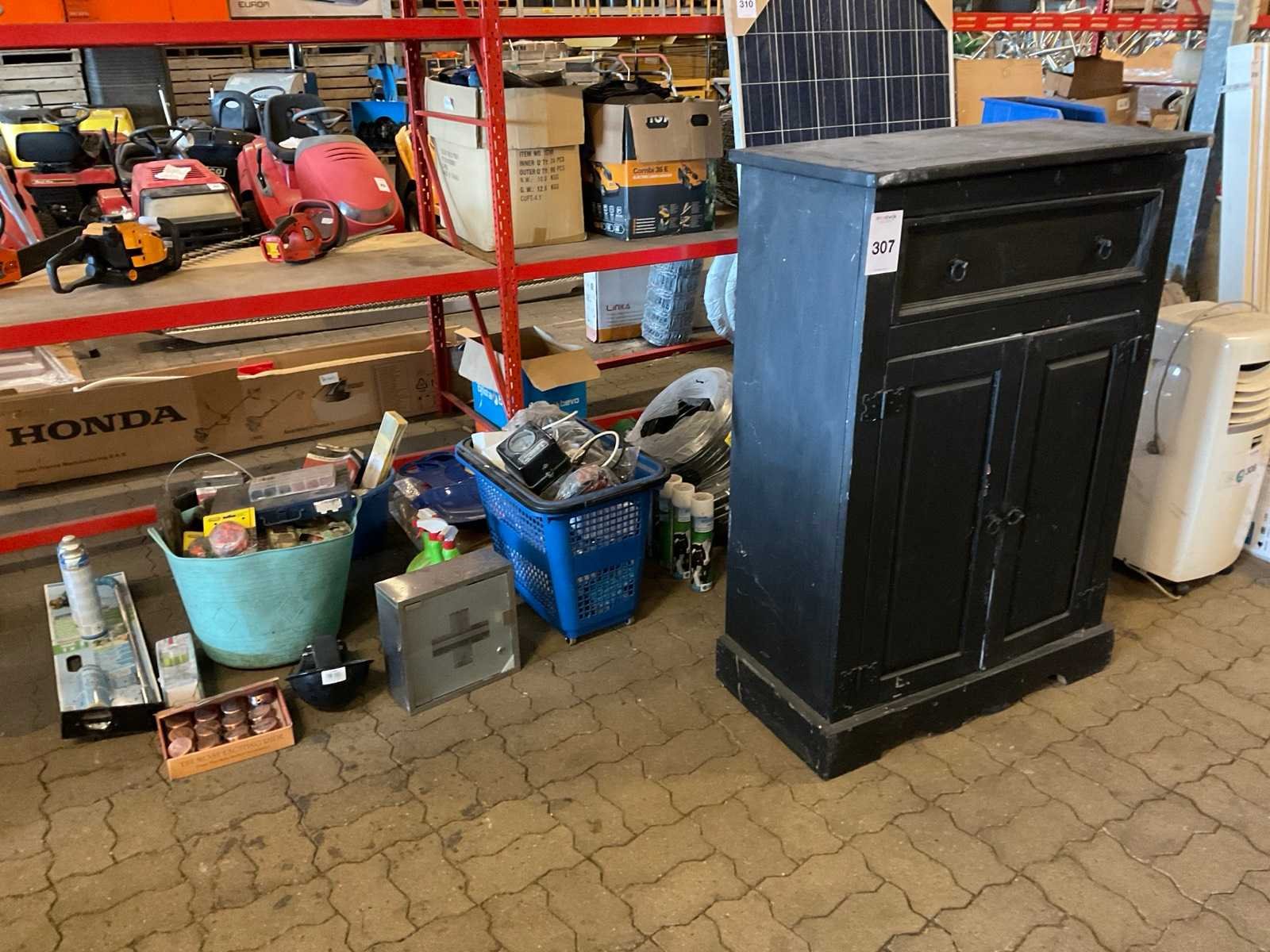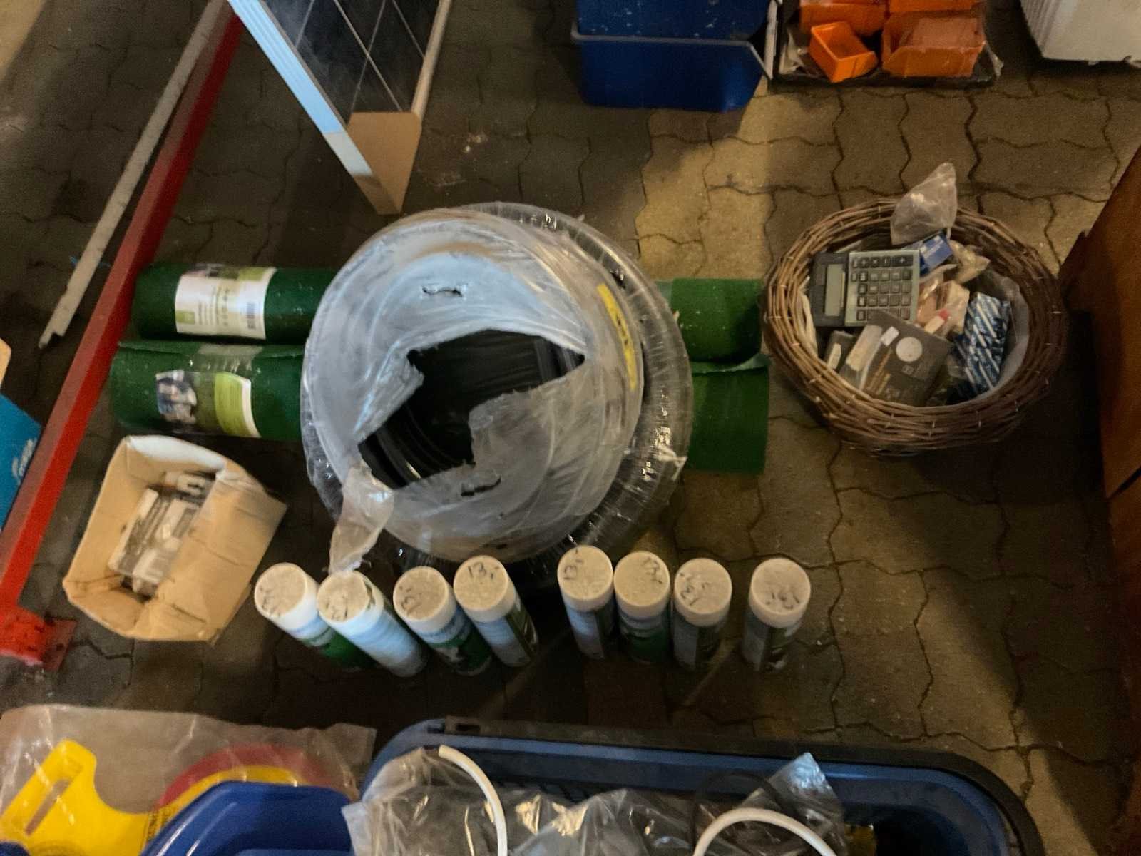 1e: Houten kast 82x40x126cm 2e: Alfaflex slang 25m ø16x25mm 3e: Alfaflex slang 25m ø19x28mm 4e: 2x rol grastapijt 100x400cm 5e: Stalvlieg bestrijdingsmiddel 6e: Sneeuwglijmatten 7e: Onkruidbrander 8e: Weide drinkbak 9e: Diverse gereedschap accessoires 10e: Fietsbellen