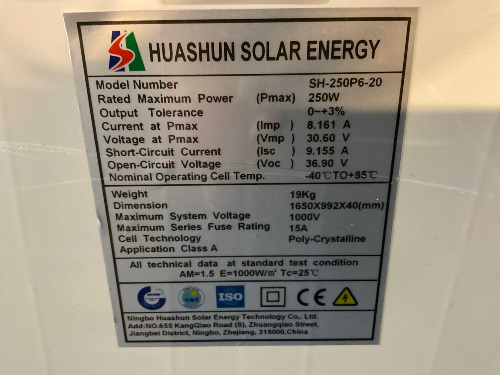 Merk: Huashun Type: SH-250P6-20 Max. dc power: 250W Max. ac current: 15A Eigen gewicht: 19kg Totale afmeting Breedte: 992mm Totale afmeting Hoogte: 1650mm