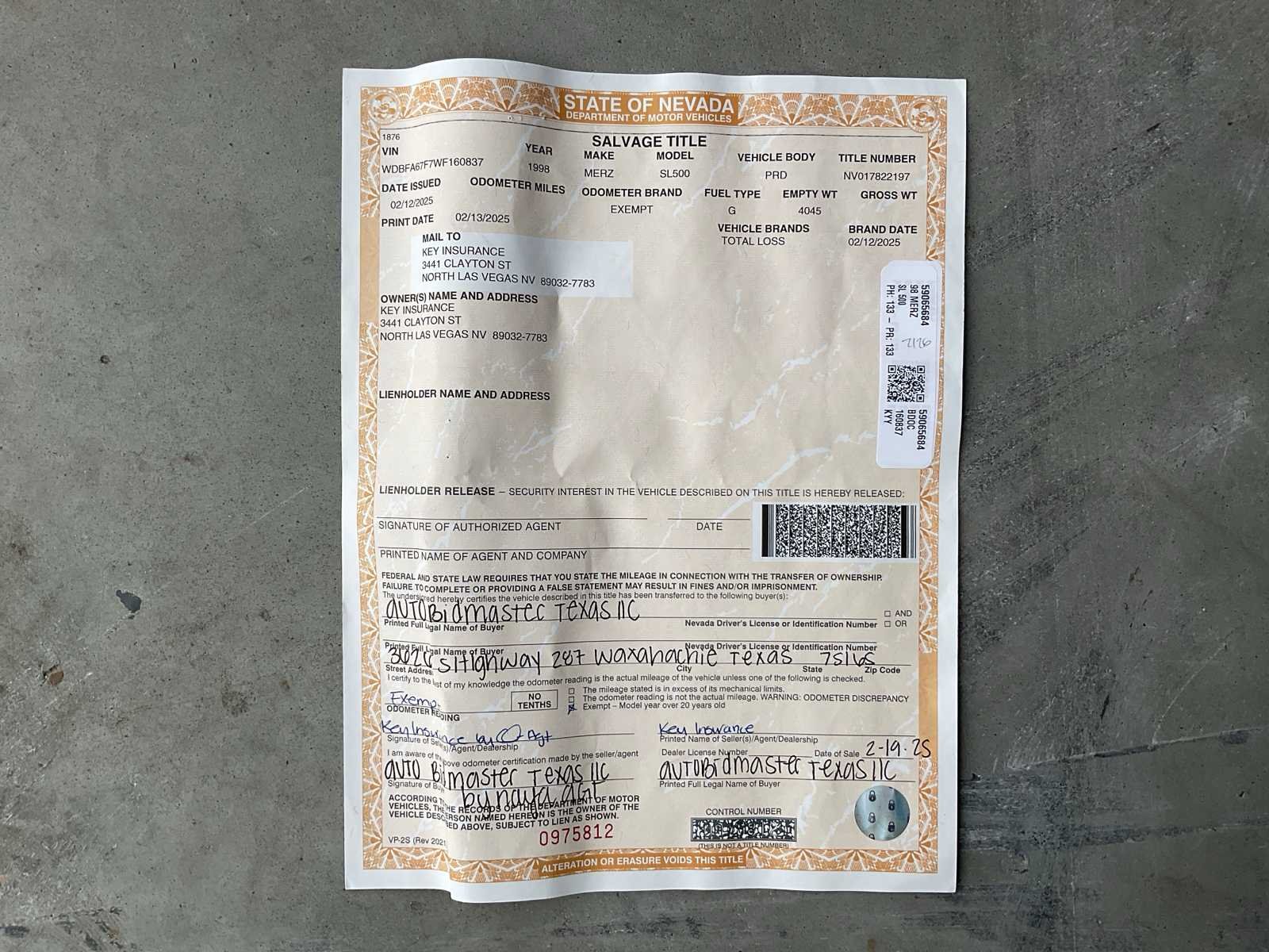 Nevada import, cabrio voorzien van soft-/en hard-top, USA voertuigdocument, start wel op externe brandstof, loopt niet op eigen brandstof (brandstofpomp vervuild/defect) Merk: Mercedes-Benz Type: SL500 Cabriolet Bouwjaar: 1998 Chassisnummer: WDBFA67F7WF160837 Afgelezen mijlenstand: 175652mi Brandstof: Benzine Nationaliteit documenten: USA voertuigdocument Carrosserie: Cabrio Transmissie: Automaat Vermogen (pk): 406 Aantal deuren: 2 Aantal zitplaatsen: 2 Aantal sleutels: 1 Cilinderinhoud: 5000 Aantal cilinders: 8 No self drive export!: true