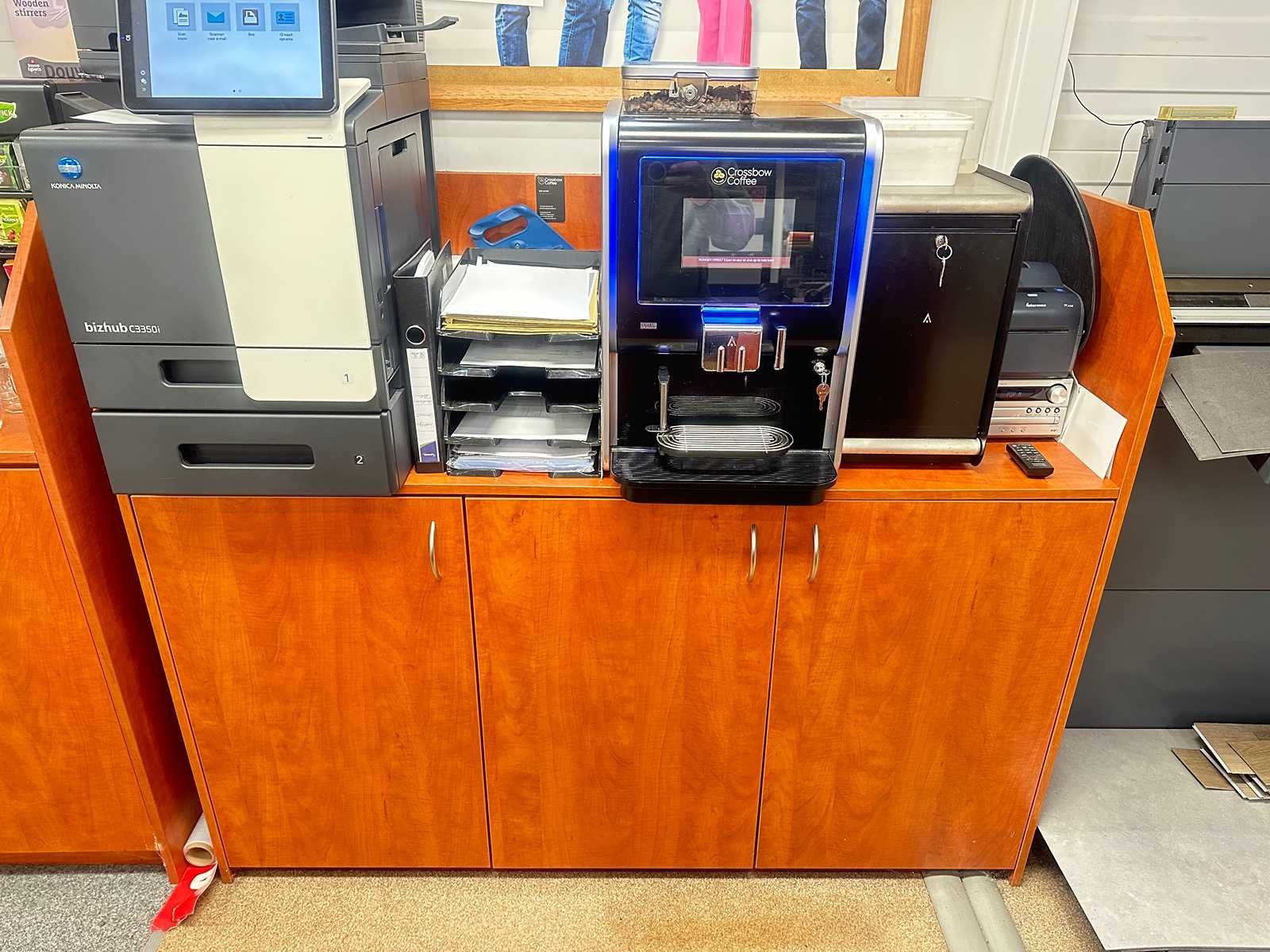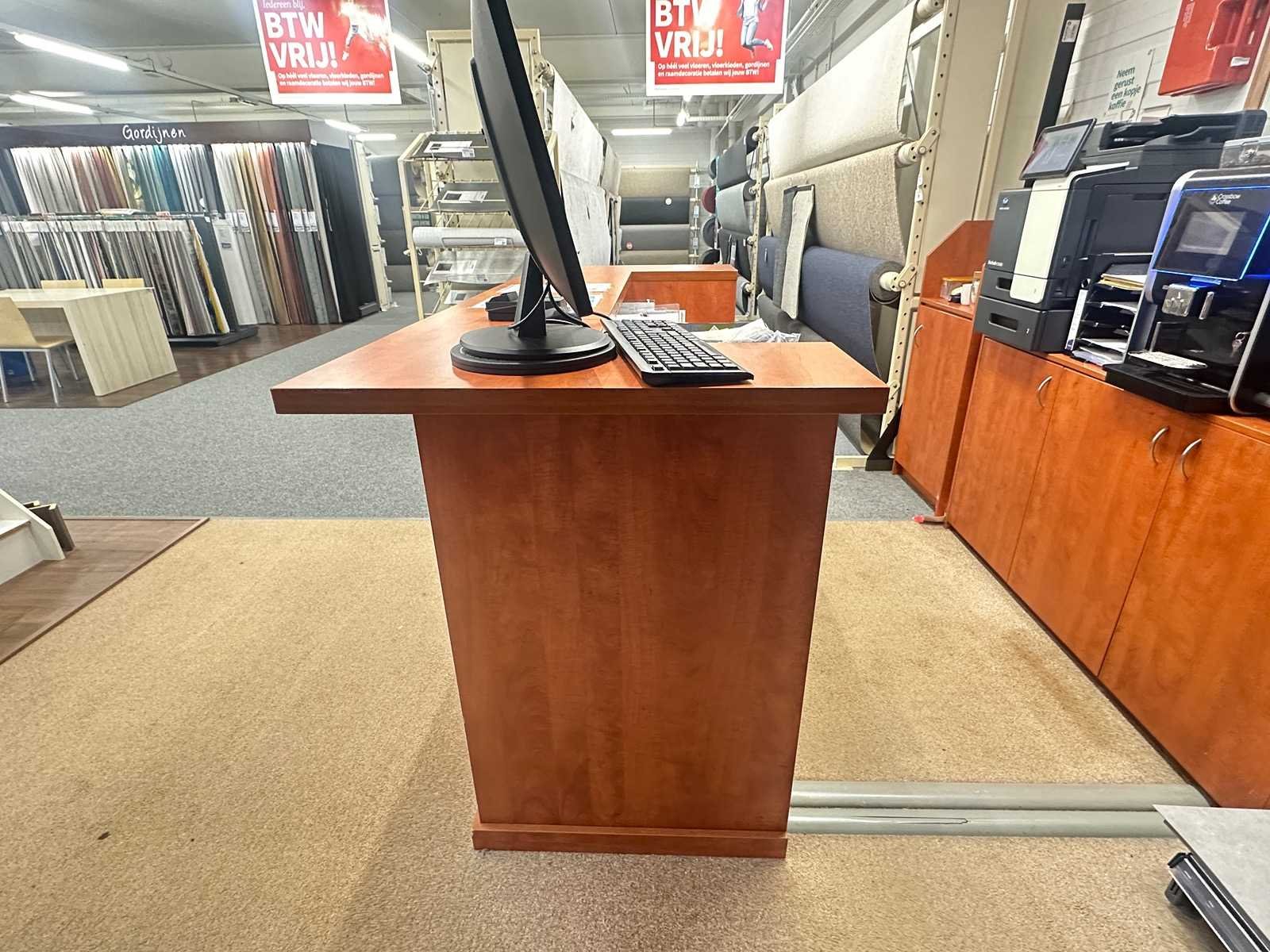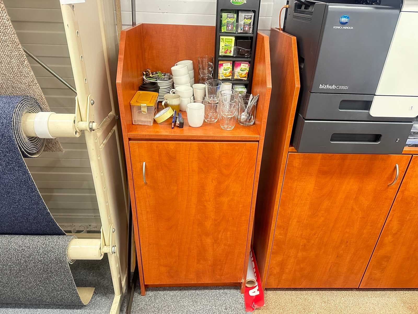 De afmeting van de wandkast is 160x60x134 cm (BxDxH). De losse kast met deur heeft een afmeting van 56x56x134 cm (BxDxH). De inhoud bestaat uit kantoorgerief, Panasonic audio, labelprinter, kassalade en afstortkluis. Exclusief koffiemachine en printer. Totale afmeting L: 2000mm Totale afmeting Breedte: 800mm Totale afmeting Hoogte: 1150mm