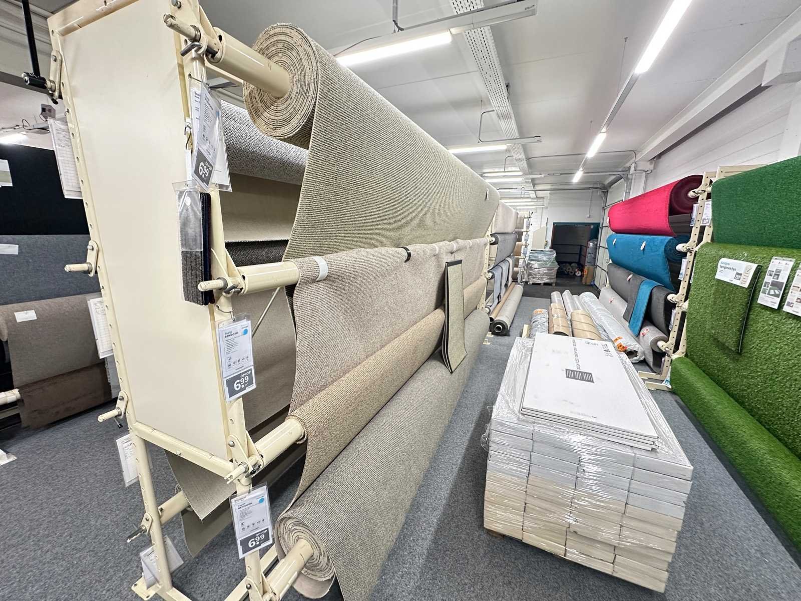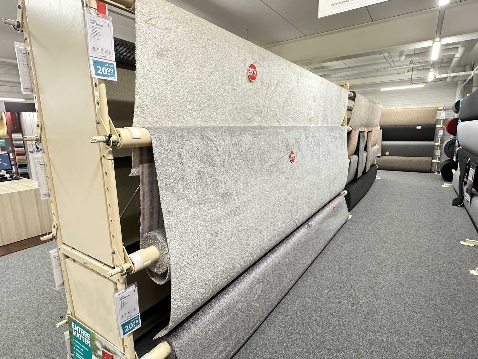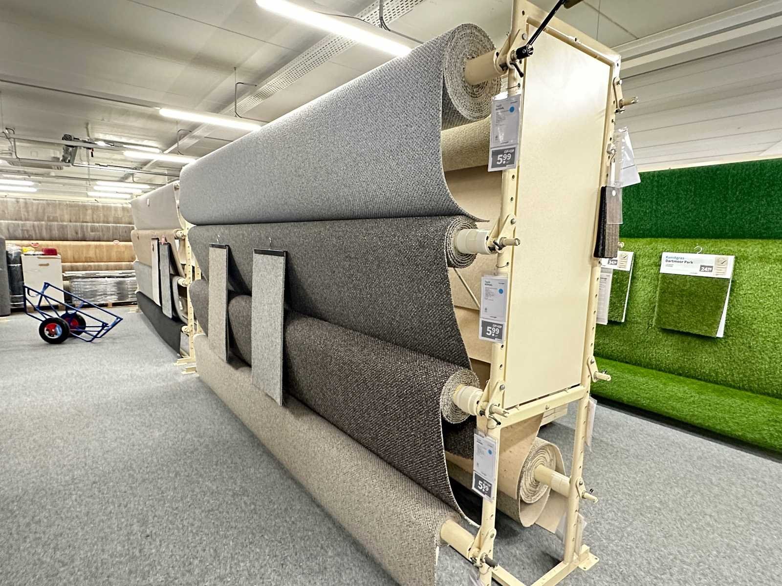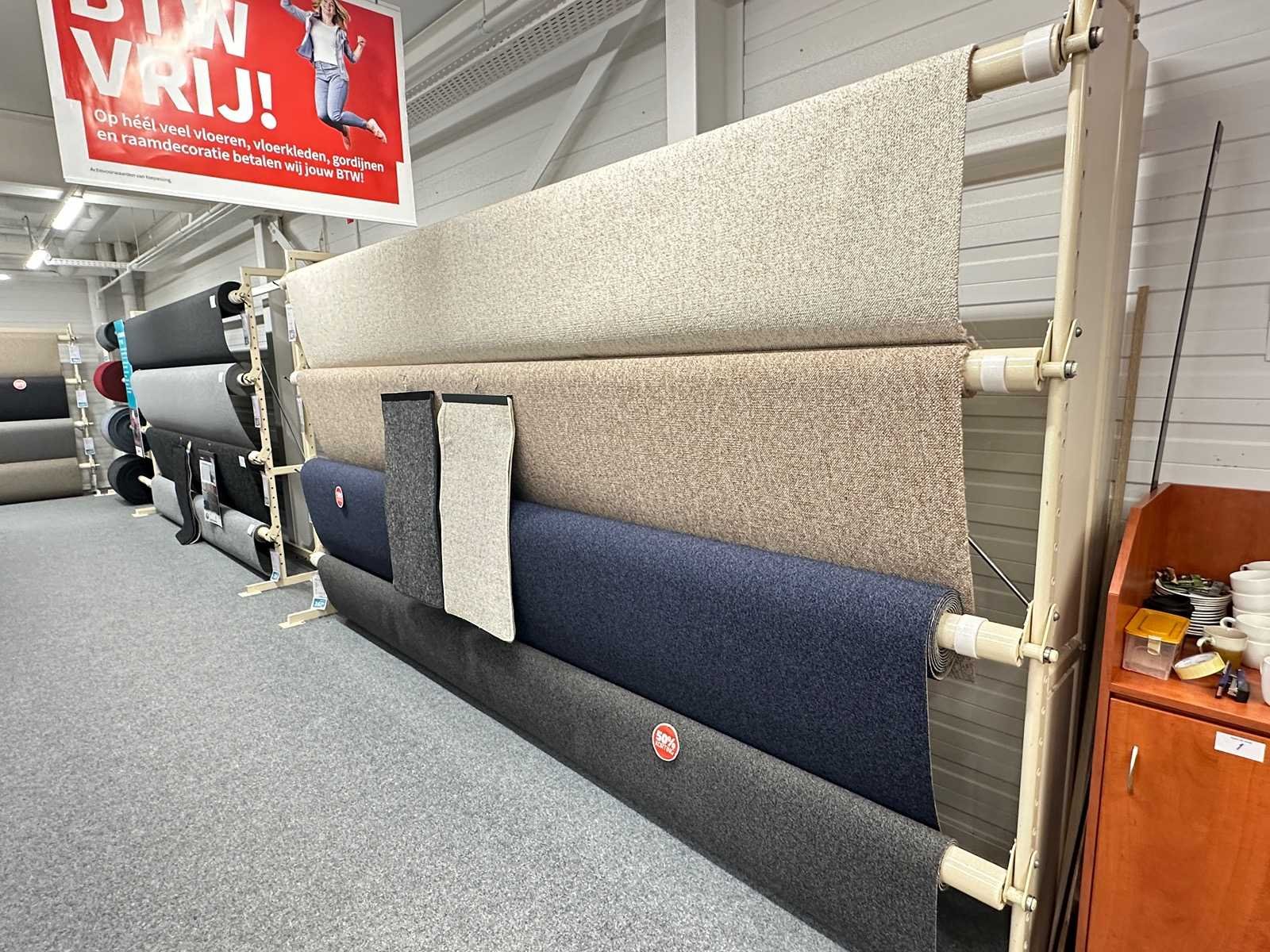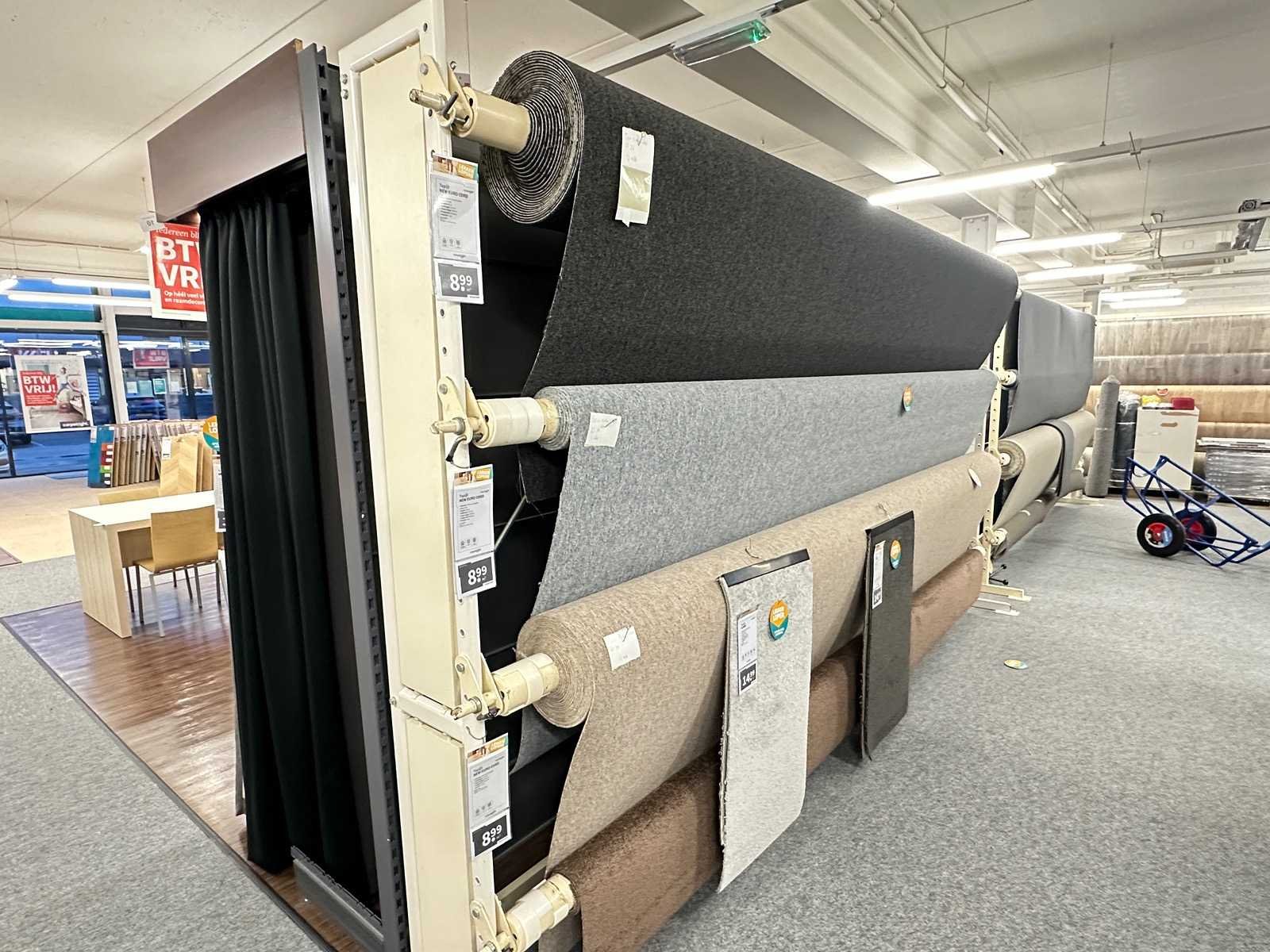 Deze partij bestaat uit diverse soorten vloerbedekking op 15 rekken. Verschillende afmetingen en kleuren. Exclusief rekken.