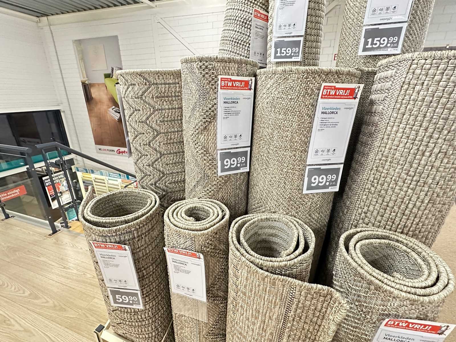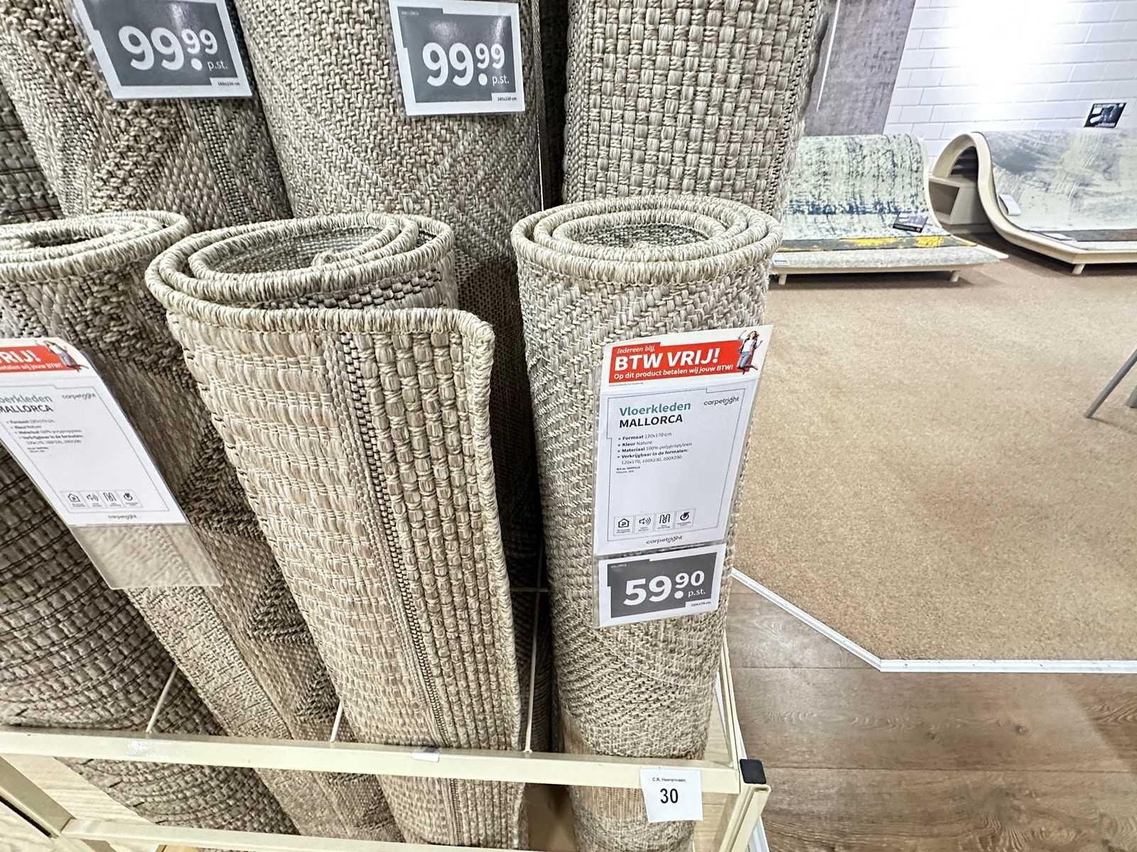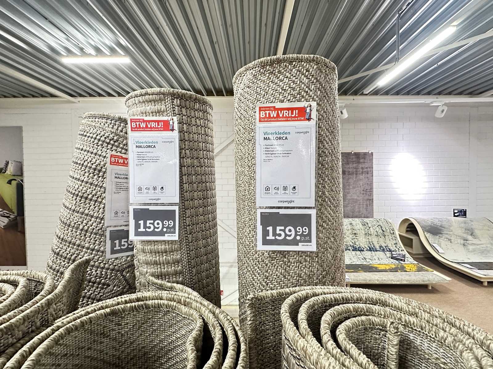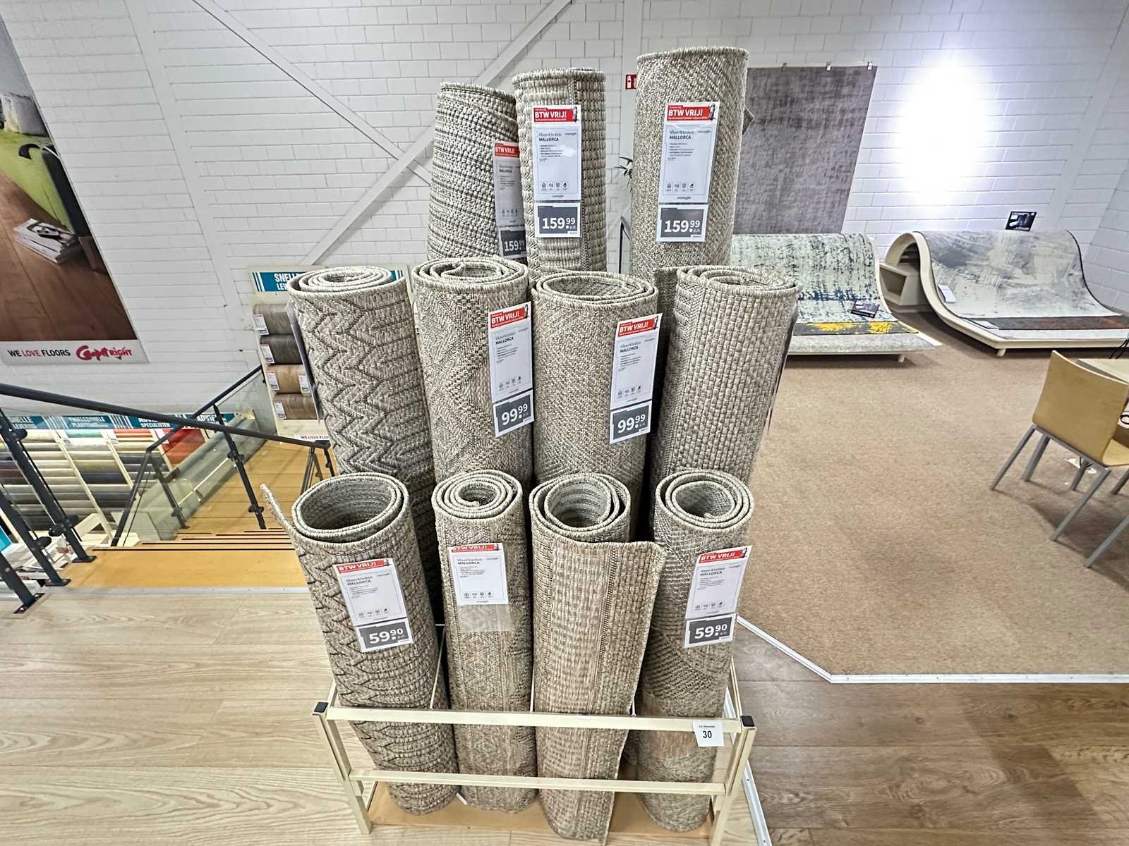 Deze partij bestaat uit 11 vloerkleden Mallorca. Diverse afmetingen. Exclusief rek.