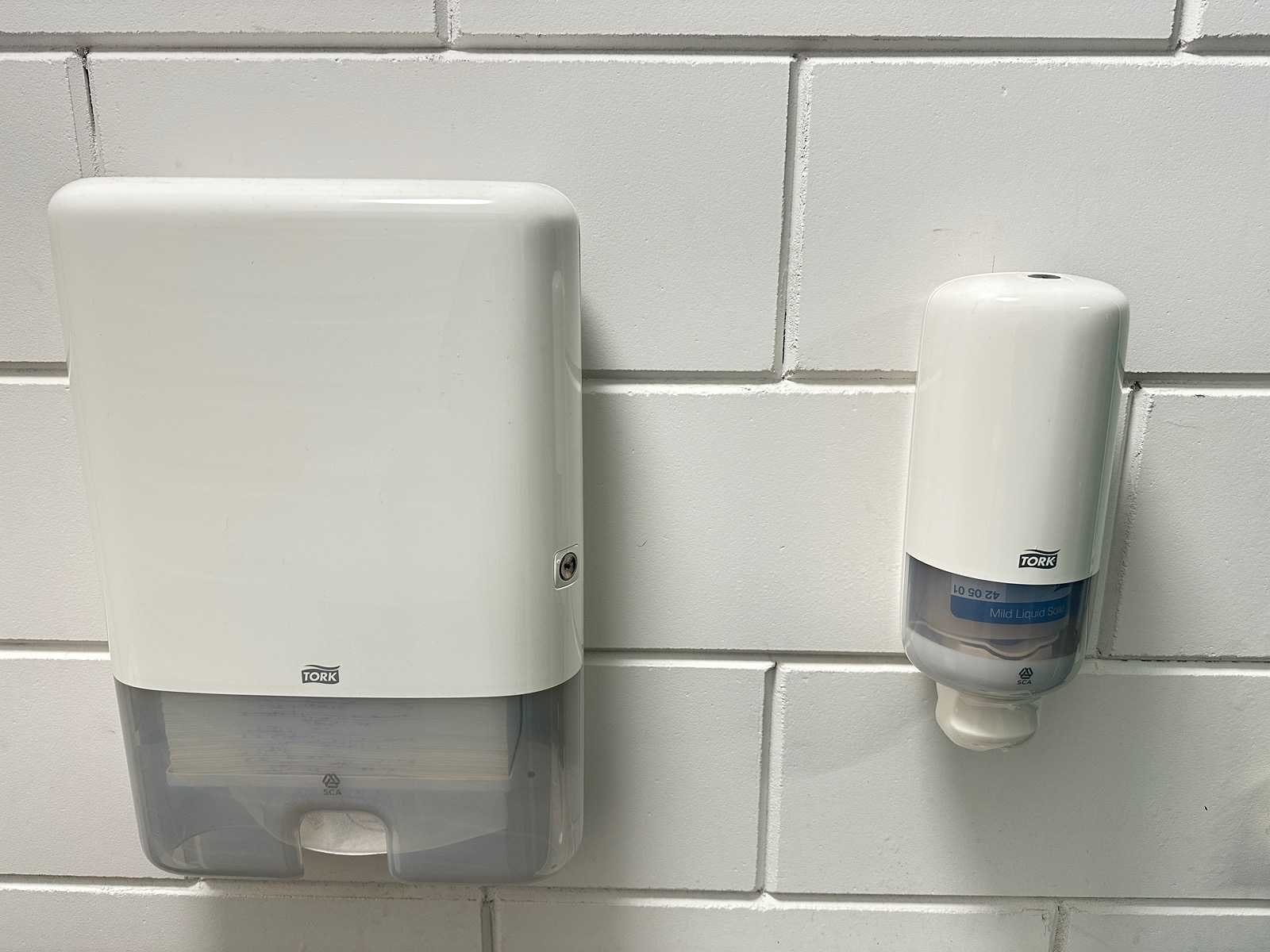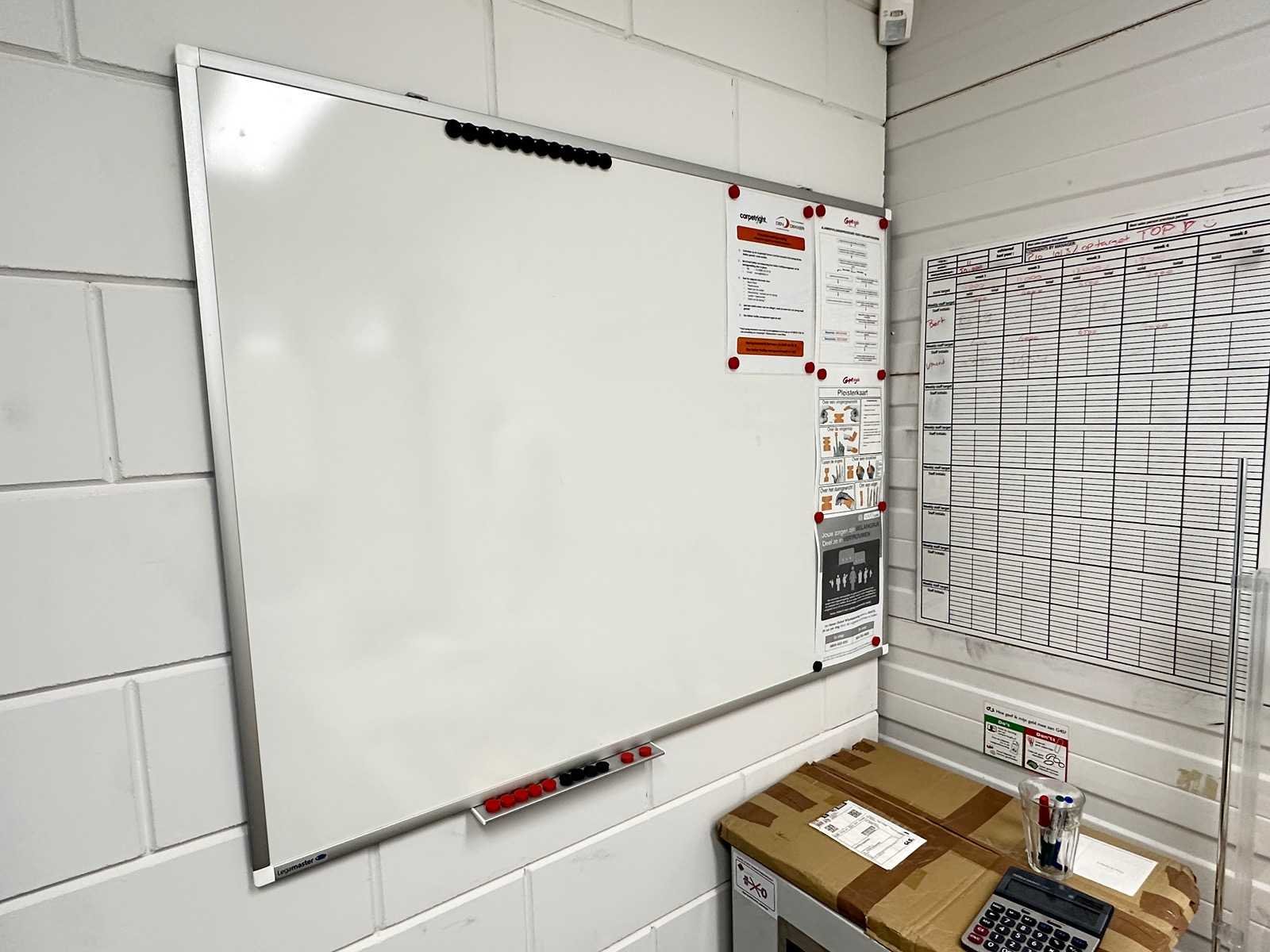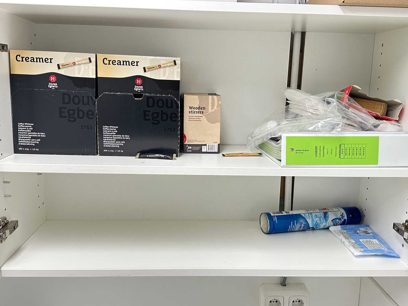 Deze inhoud bestaat uit tafel met stoelen, whiteboard, Tork papierdispenser en zeepdispenser, koelkast, prullebak, waterkoker, serviesgoed, lockerkast, magnetron, handgereedschap en schoonmaakartikelen.