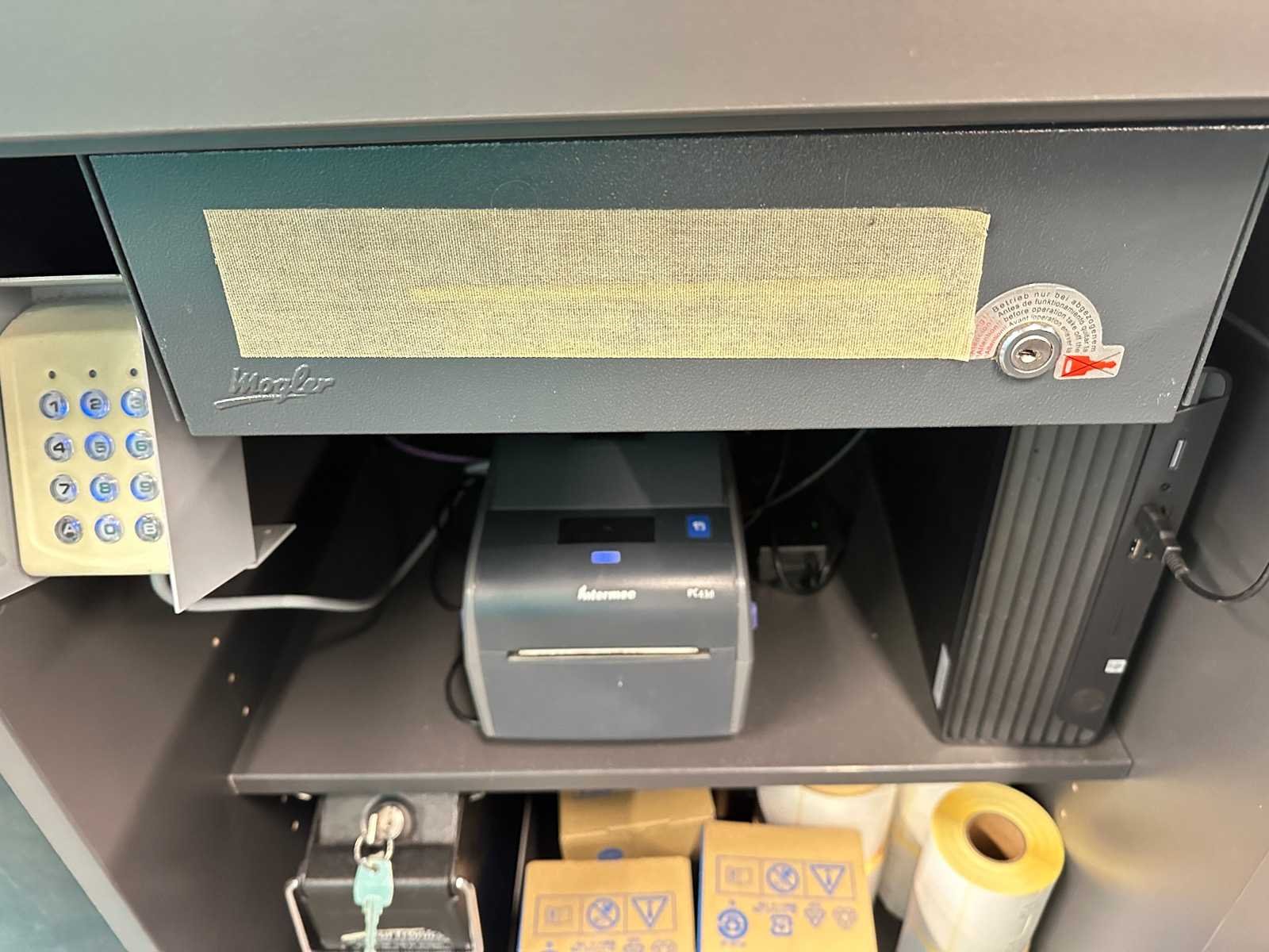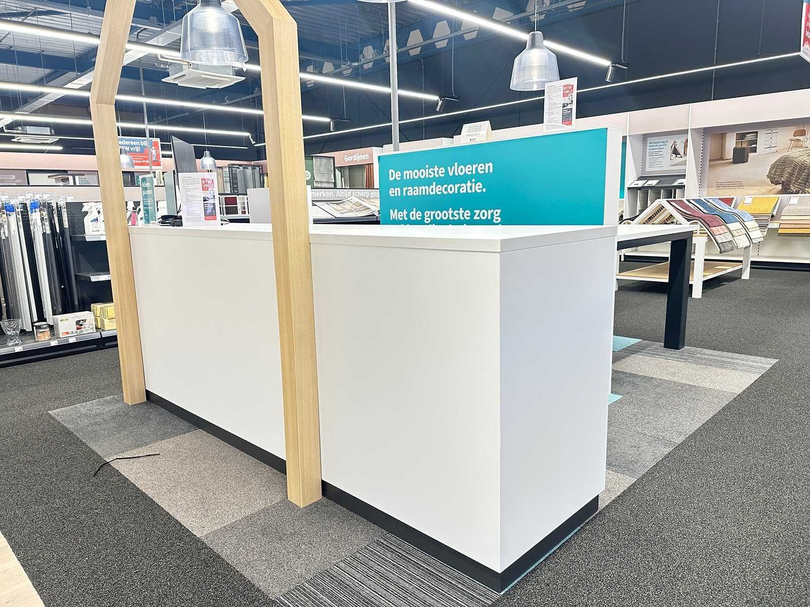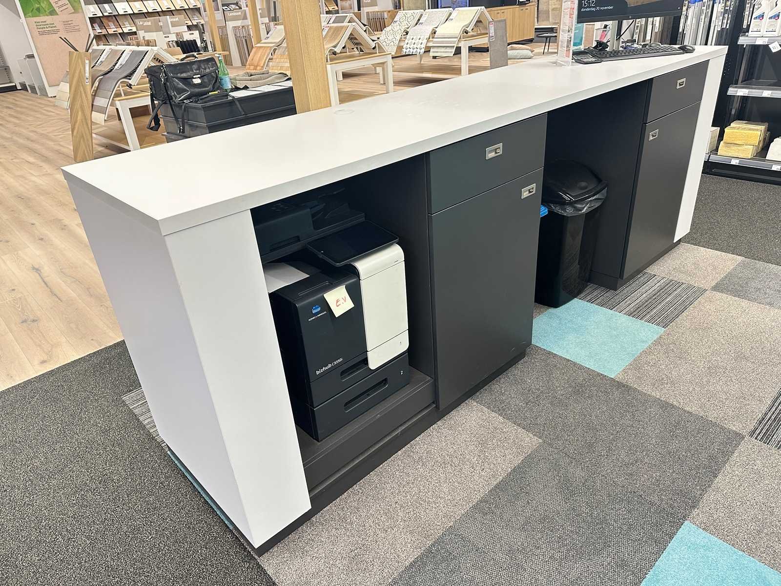 Moderne balie met inhoud en twee houten huisprofielen. Afmeting van deze houten decoratiestukken is 191x10x270 cm (BxDxH). De inhoud van de balie bestaat uit een kassalade, afstortkluis, kantoorgerief, labelprinter en printpapier. Exclusief PC met monitor, pinapparaat en printer. Totale afmeting L: 3000mm Totale afmeting Breedte: 400mm Totale afmeting Hoogte: 1100mm