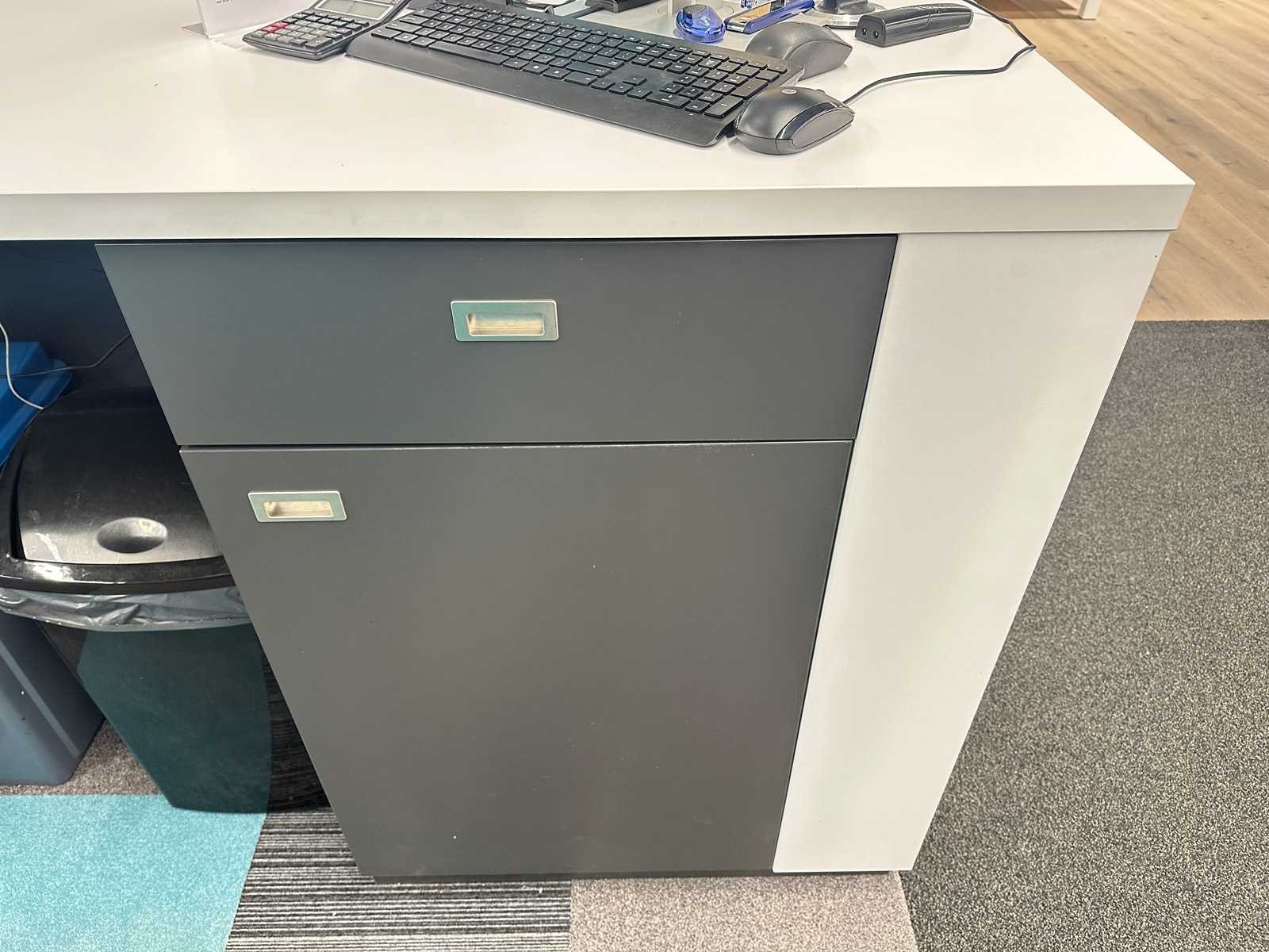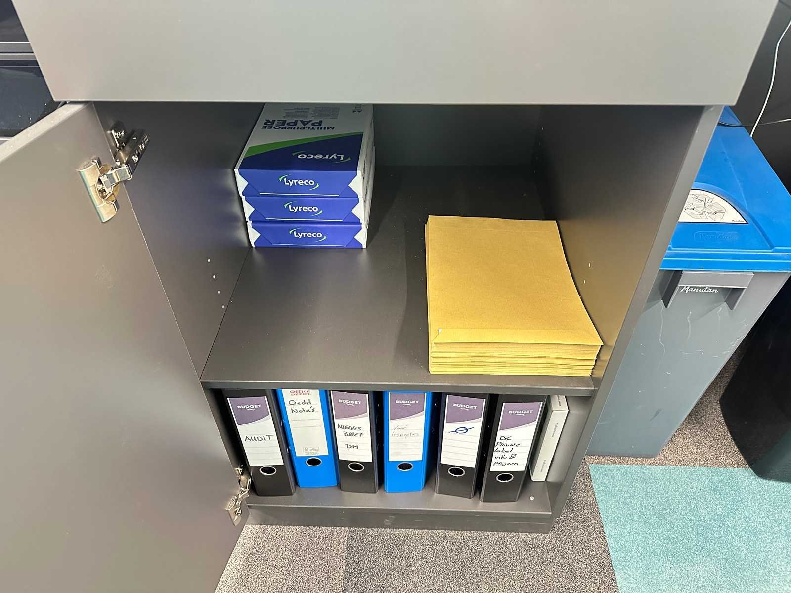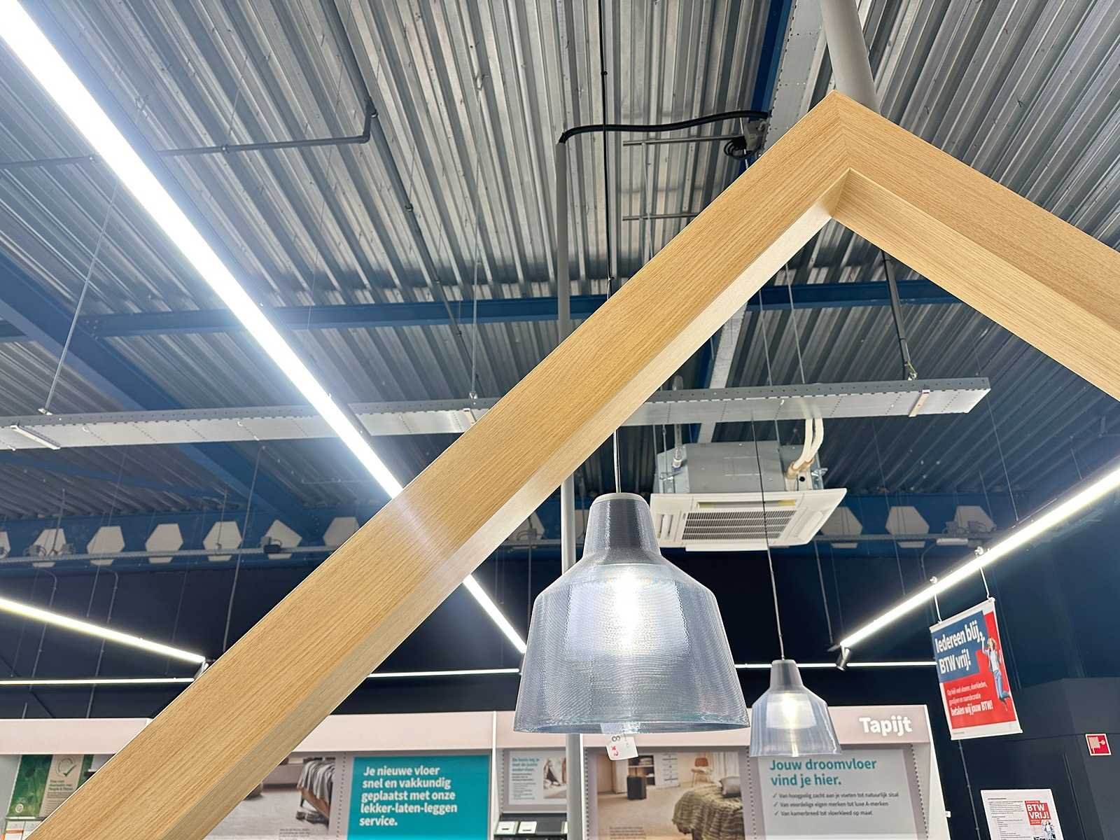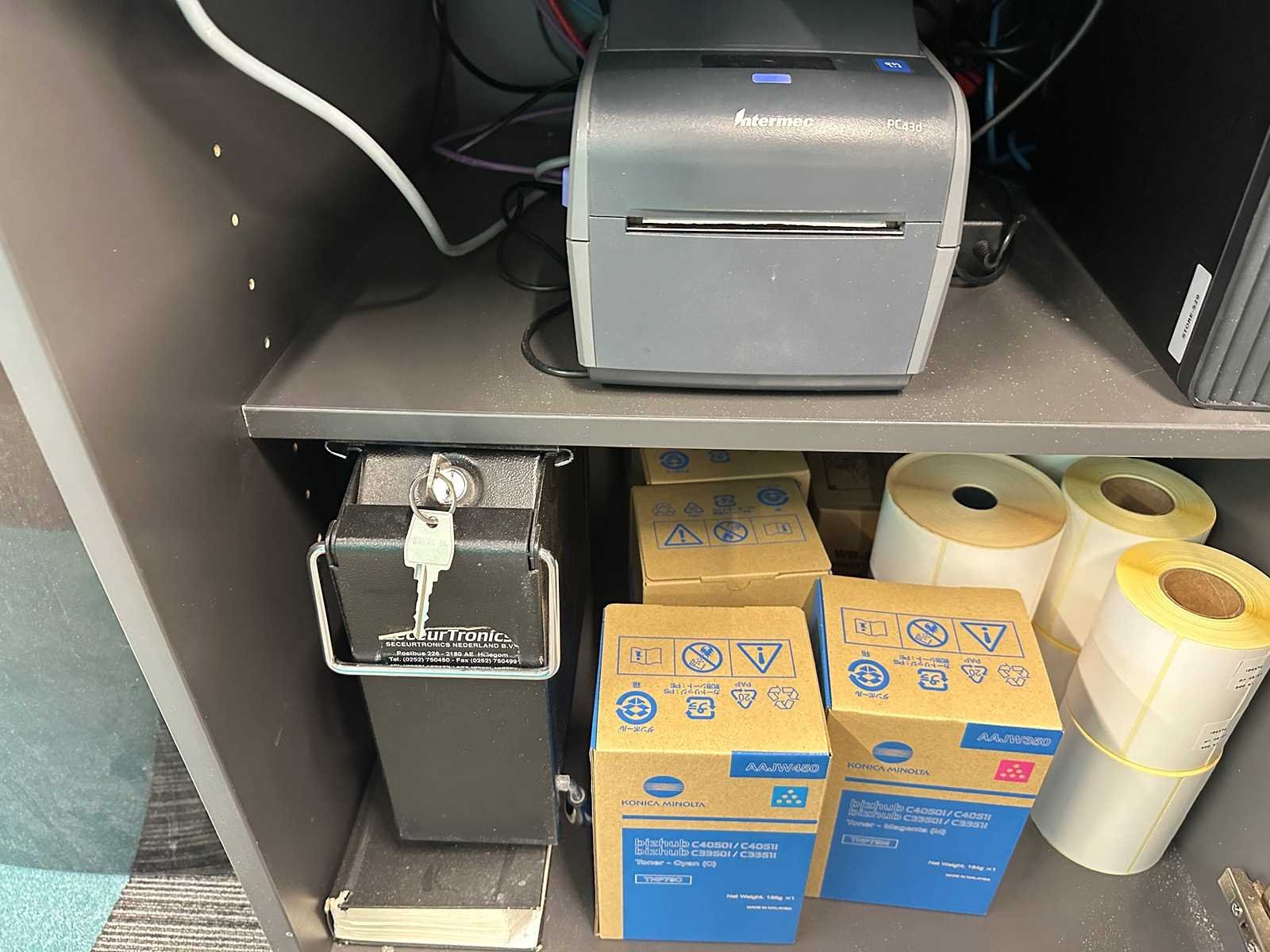 Moderne balie met inhoud en twee houten huisprofielen. Afmeting van deze houten decoratiestukken is 191x10x270 cm (BxDxH). De inhoud van de balie bestaat uit een kassalade, afstortkluis, kantoorgerief, labelprinter en printpapier. Exclusief PC met monitor, pinapparaat en printer. Totale afmeting L: 3000mm Totale afmeting Breedte: 400mm Totale afmeting Hoogte: 1100mm