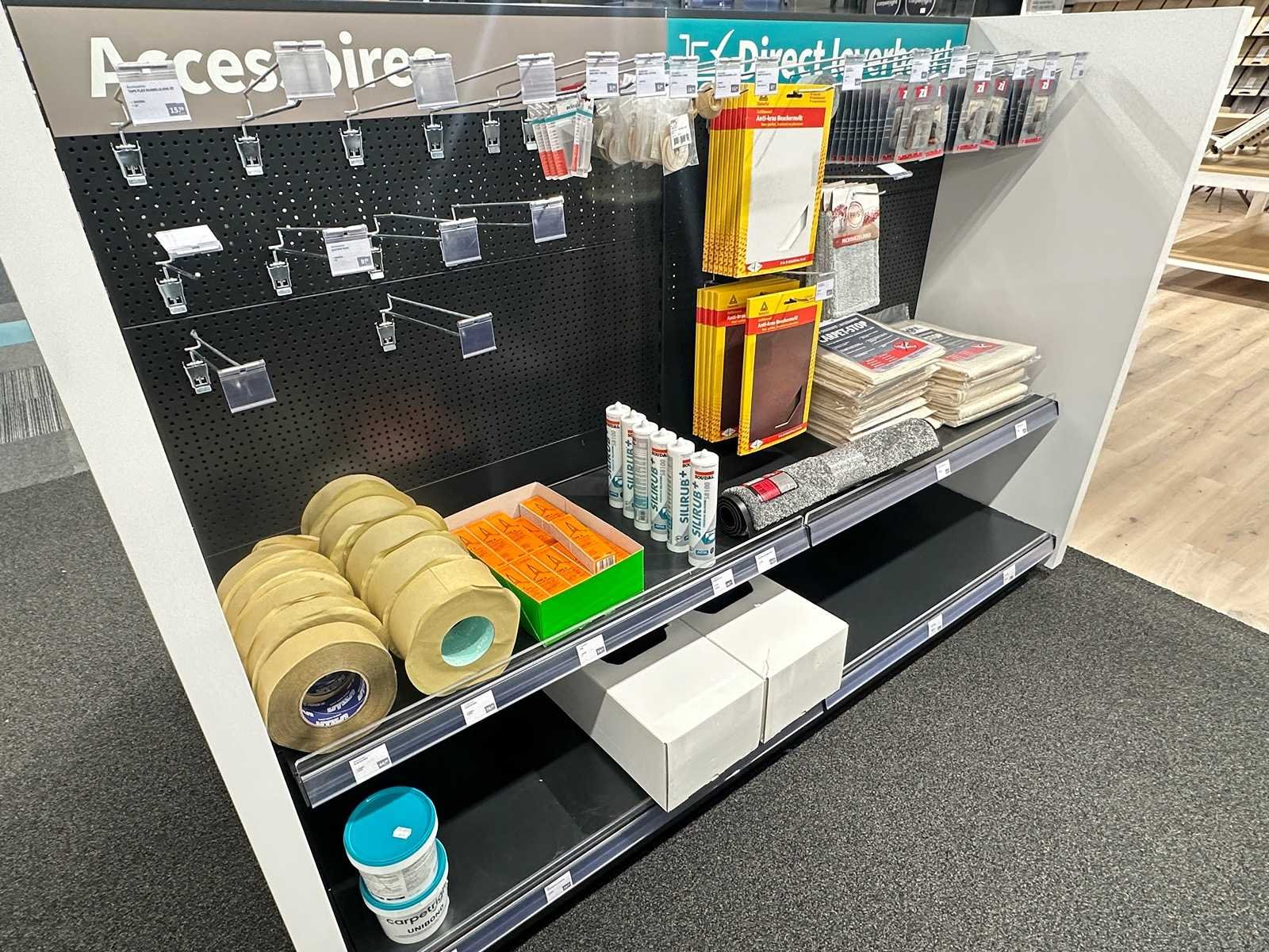 Deze voorraad bestaat uit montagemateriaal, trapbekleding, ondertapijt en deurmatten.