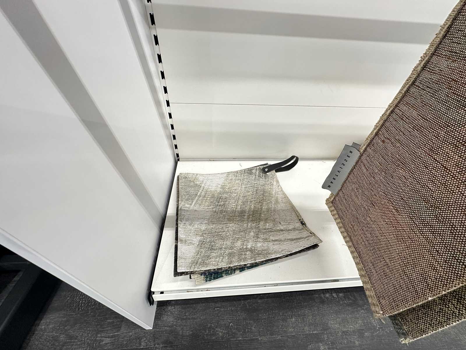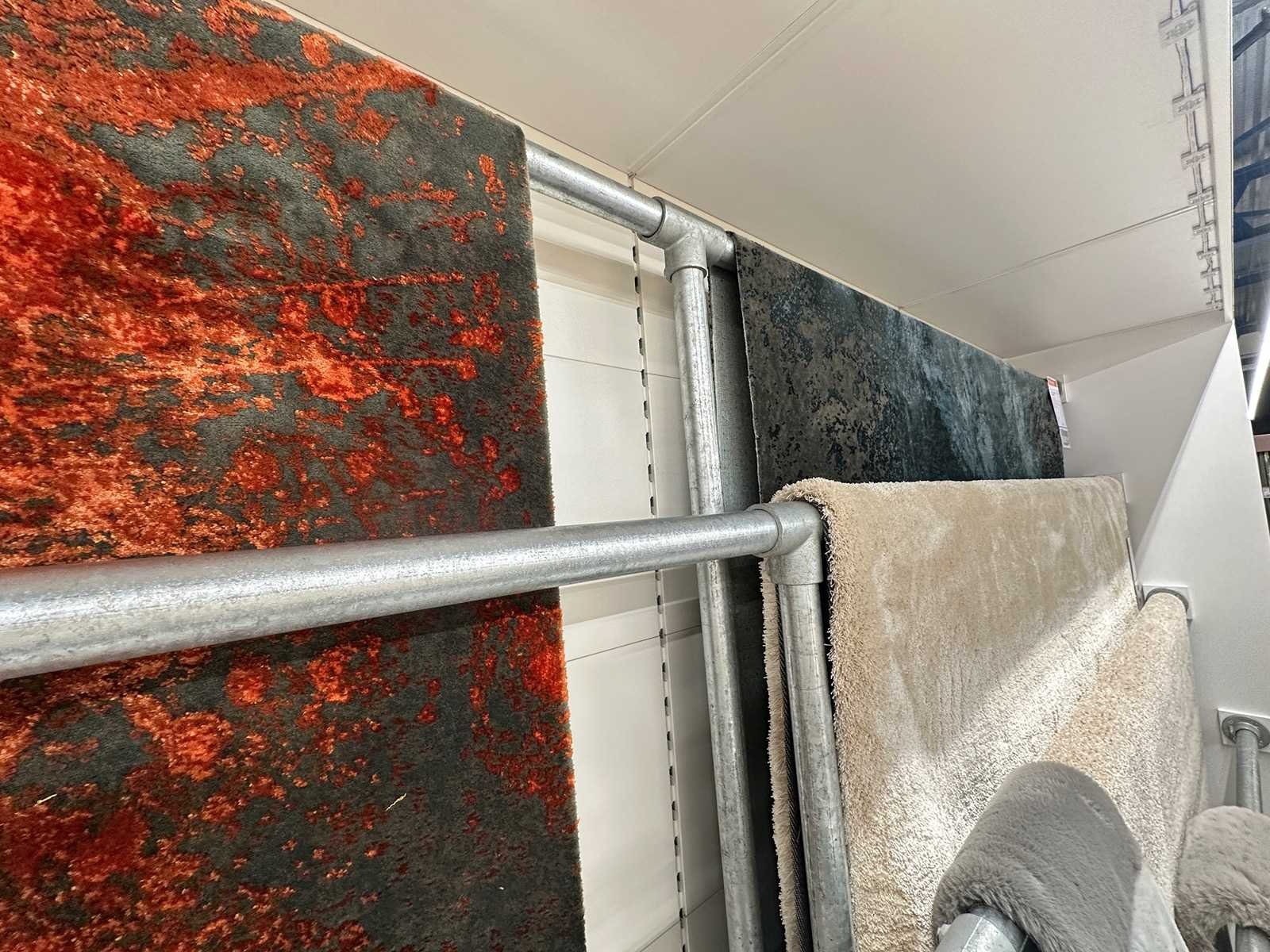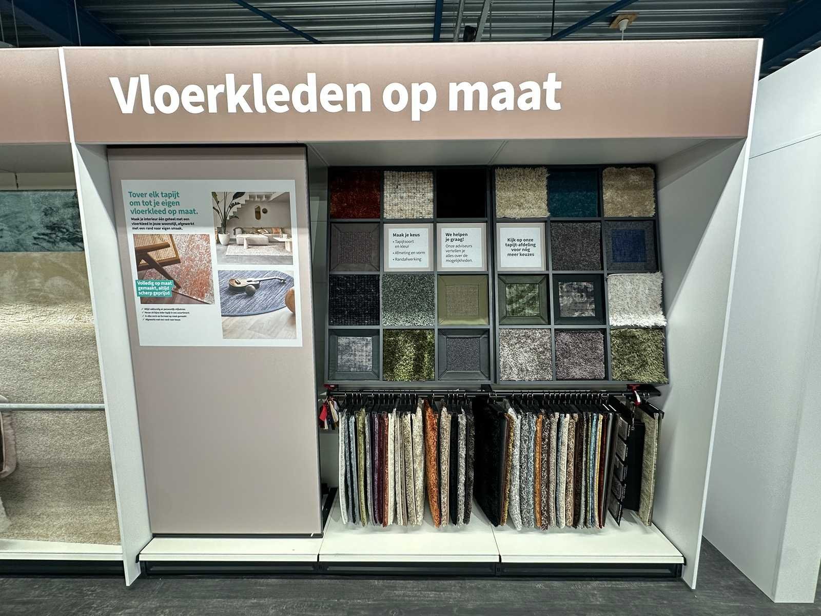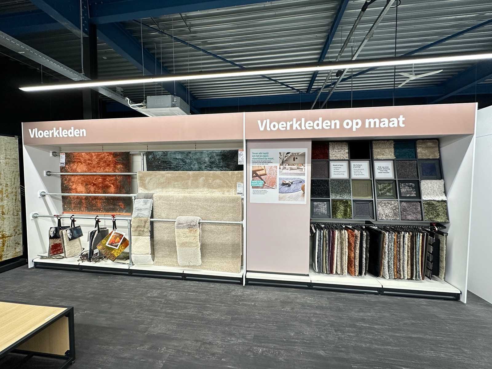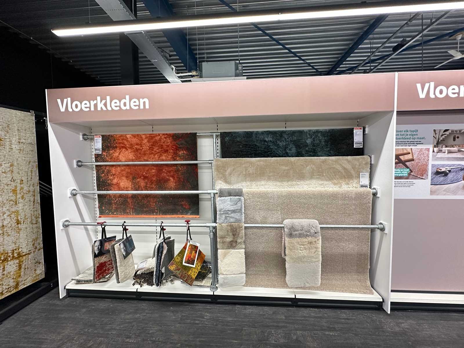 Deze wand bestaat uit wandopstelling met 7. delen van 1 meter. De delen zijn demontabel. Exclusief vloerkleden. Inclusief stalen en monsters. Voorzien van LED verlichting Afmeting l: 7000mm Afmeting b: 750mm Afmeting h: 2700mm Hout: true Staal: true