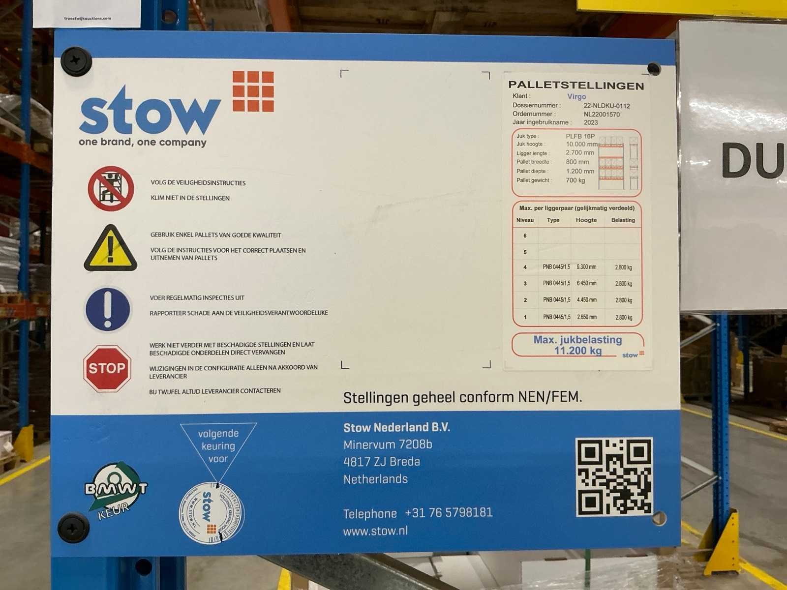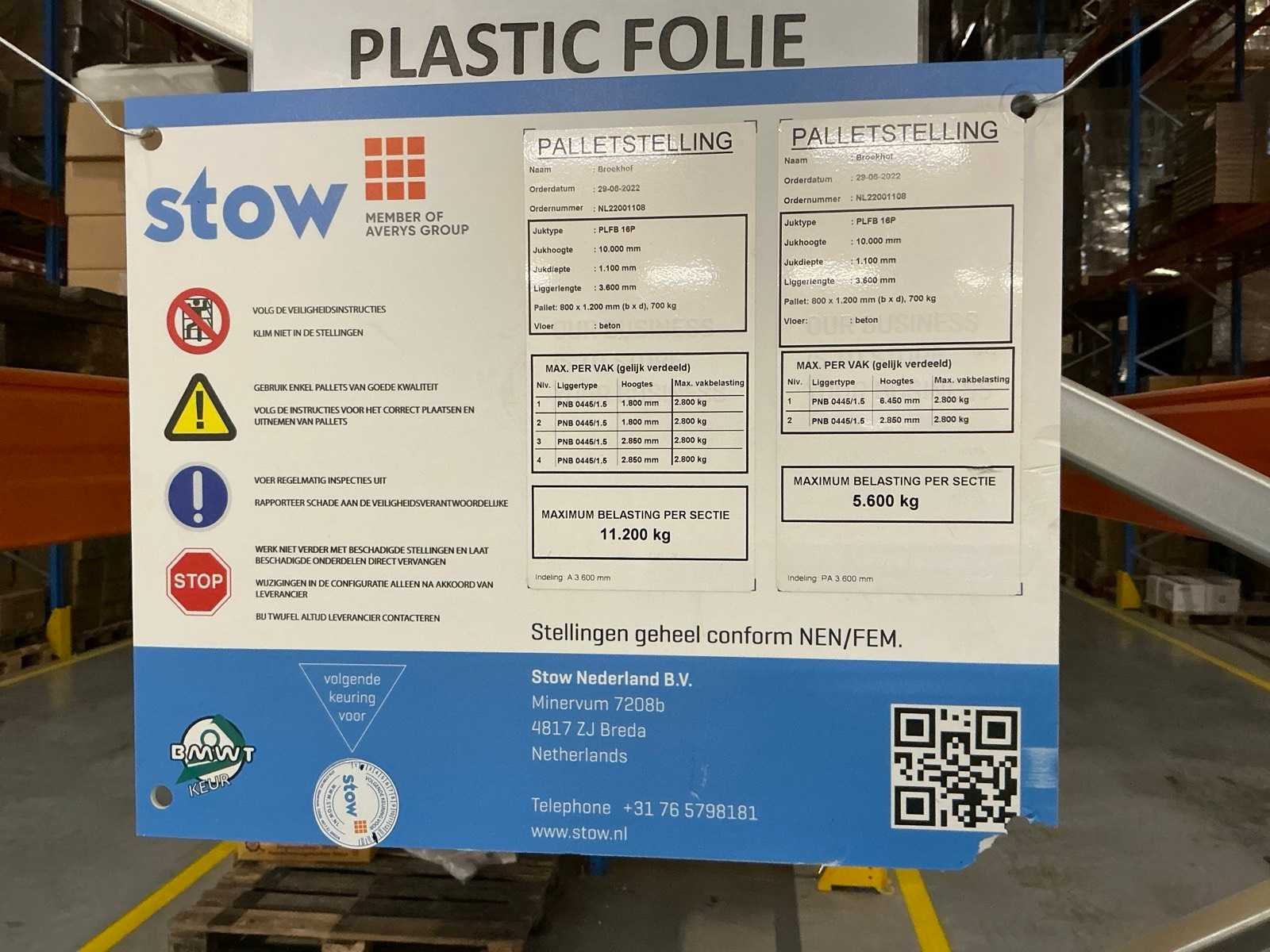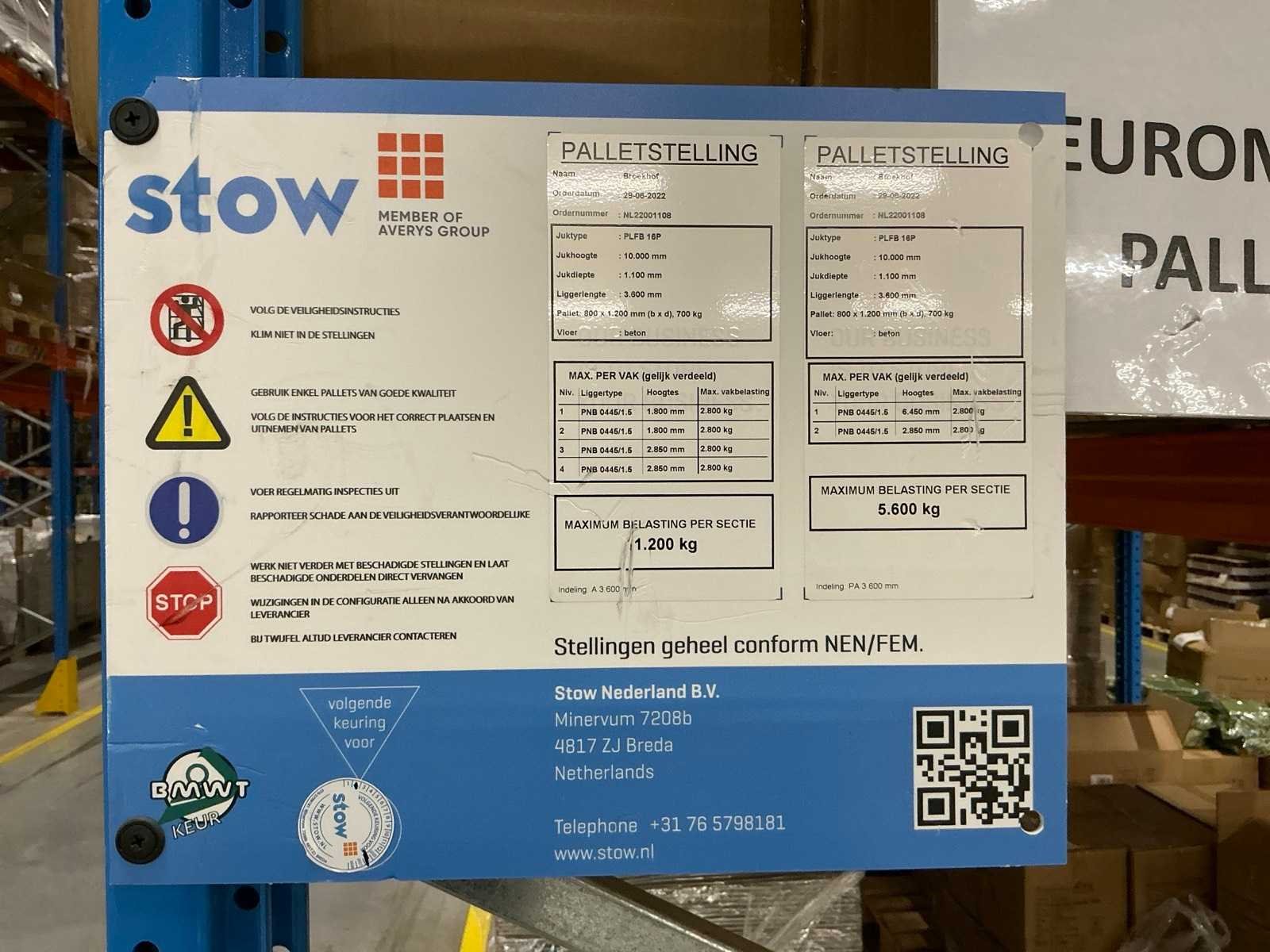 Bestaande uit zes opgebouwde palletstellingen, inclusief aanrijdbeveiliging. Goederen zijn niet inbegrepen. Dit kavel is onderdeel van een combinatiekavel (kavel 8), bestaande uit de volgende kavels: 1 t/m 4 Merk: Stow Bouwjaar: 2022 Aantal secties: 180 Sectie afm. b: 3600mm Sectie diepte: 1100mm Aantal staanders: 186 Aantal liggers: 1440 Max. sectiebelasting: 11200kg Totale afmeting Hoogte: 10000cm