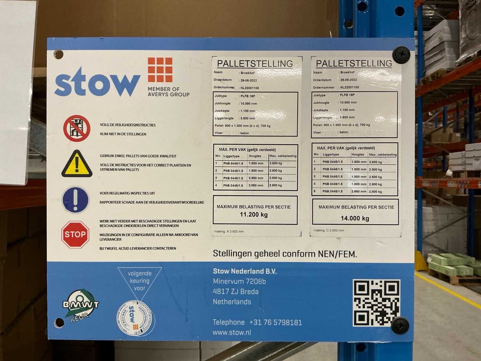 Bestaande uit zes opgebouwde palletstellingen, inclusief aanrijdbeveiliging. Goederen zijn niet inbegrepen. Dit kavel is onderdeel van een combinatiekavel (kavel 8), bestaande uit de volgende kavels: 1 t/m 4 Merk: Stow Bouwjaar: 2023 Aantal secties: 390 Sectie afm. b: 3600mm Sectie diepte: 1100mm Aantal staanders: 403 Aantal liggers: 3120 Max. sectiebelasting: 11200kg Totale afmeting Hoogte: 10000cm