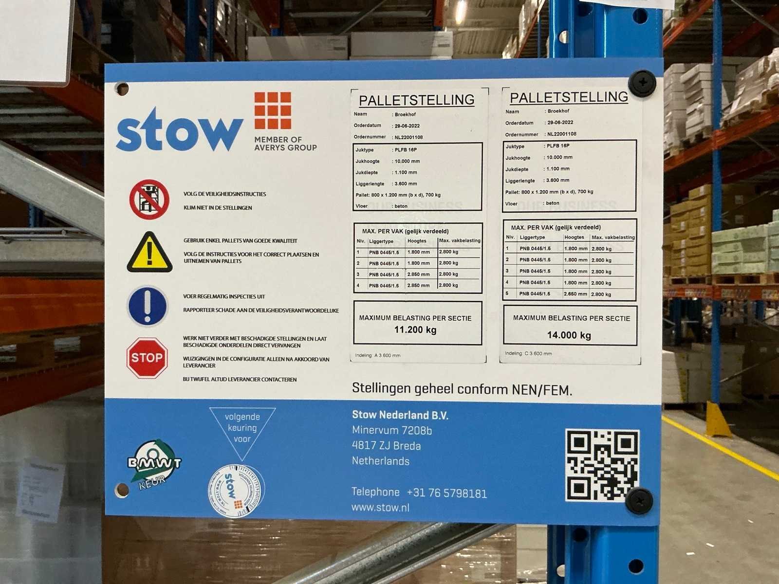 Bestaande uit 13 opgebouwde palletstellingen, inclusief aanrijdbeveiliging. Goederen zijn niet inbegrepen. Dit kavel is onderdeel van een combinatiekavel (kavel 8), bestaande uit de volgende kavels: 1 t/m 4 Merk: Stow Bouwjaar: 2022 Aantal secties: 140 Sectie afm. b: 3600mm Sectie diepte: 1100mm Aantal staanders: 150 Aantal liggers: 1218 Max. sectiebelasting: 11200kg Totale afmeting Hoogte: 10000cm