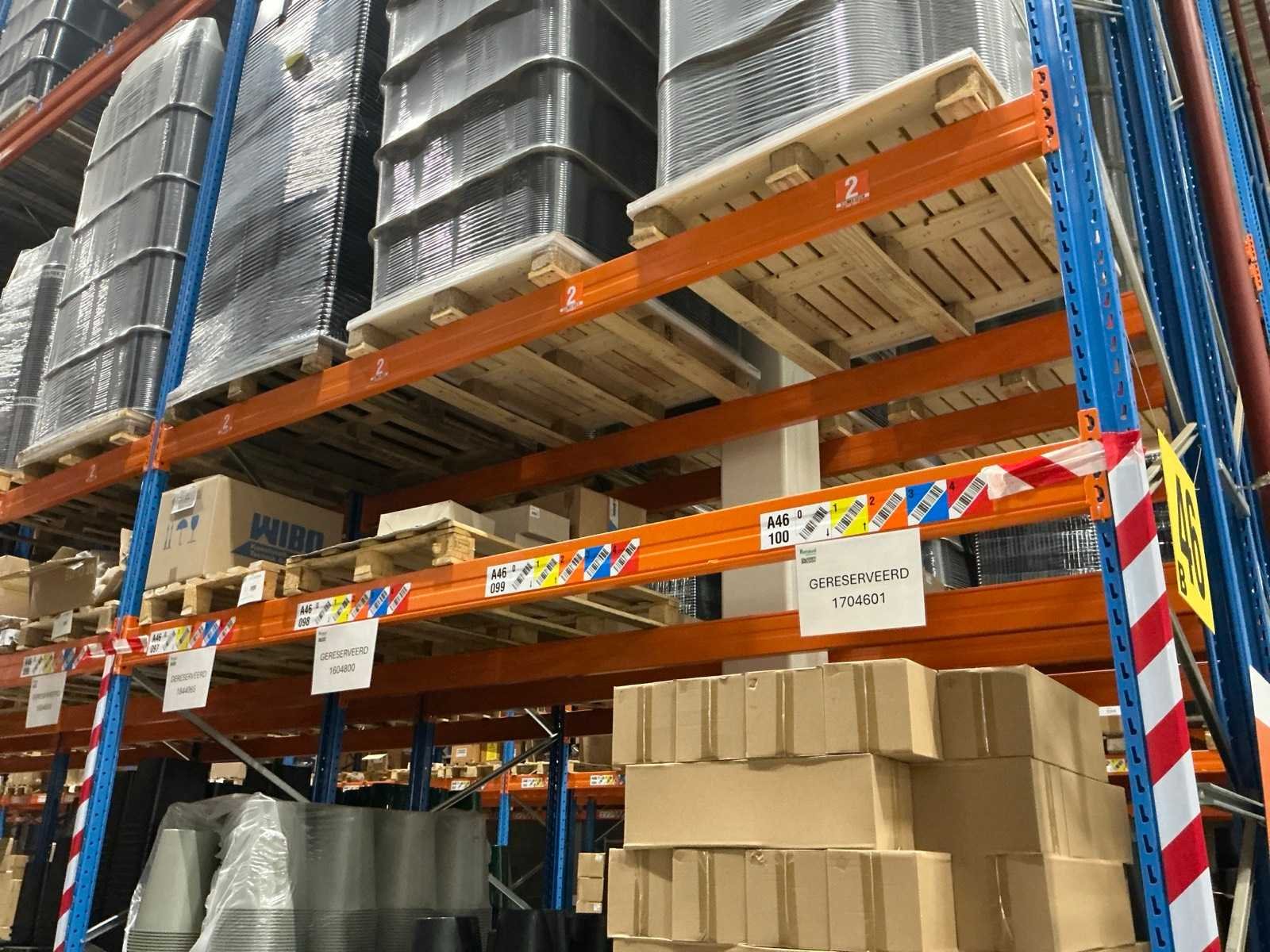 Bestaande uit zeven opgebouwde palletstellingen, inclusief aanrijdbeveiliging. Goederen zijn niet inbegrepen. Merk: Stow Bouwjaar: 2024 Aantal secties: 168 Sectie afm. b: 3600mm Sectie diepte: 1100mm Aantal staanders: 217 Aantal liggers: 1400 Max. sectiebelasting: 11200kg Totale afmeting Hoogte: 10000cm