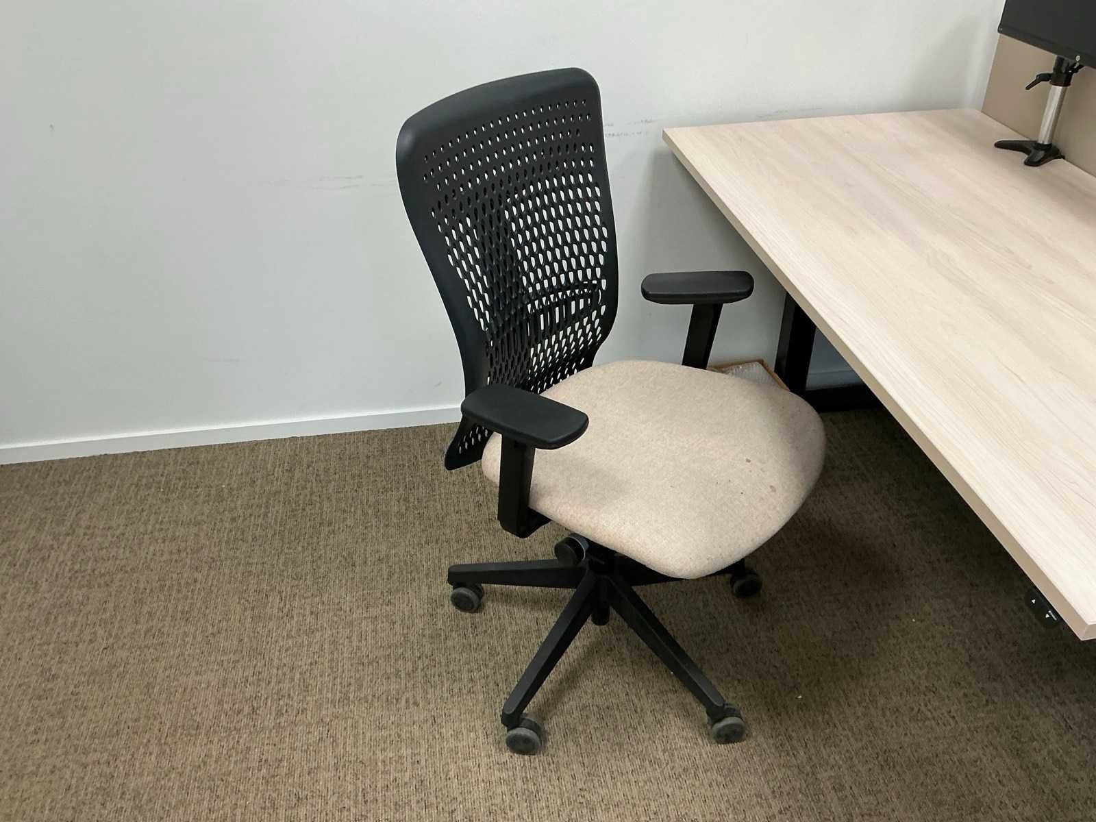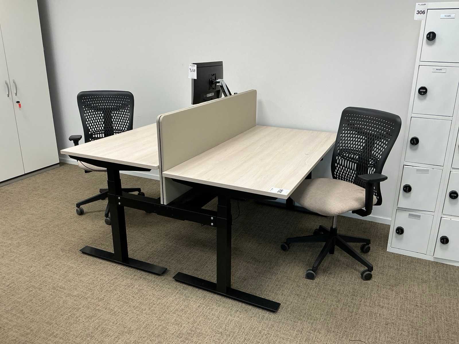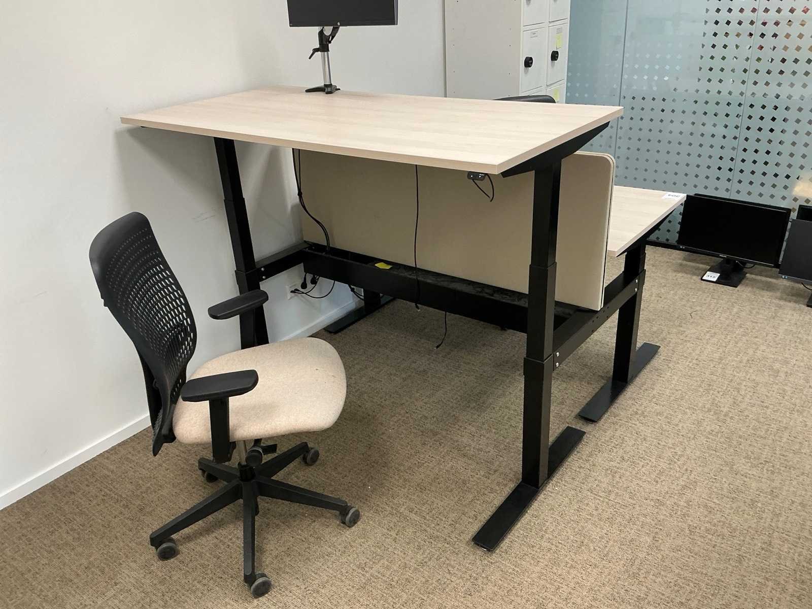 Hoogte 72-130cm. Voorzien van 2 Luxy Bureaustoelen. Zonder de los verkavelde monitor met arm. Merk: Bralco Type: Elektrisch verstelbare Lengte: 160cm Breedte: 166cm