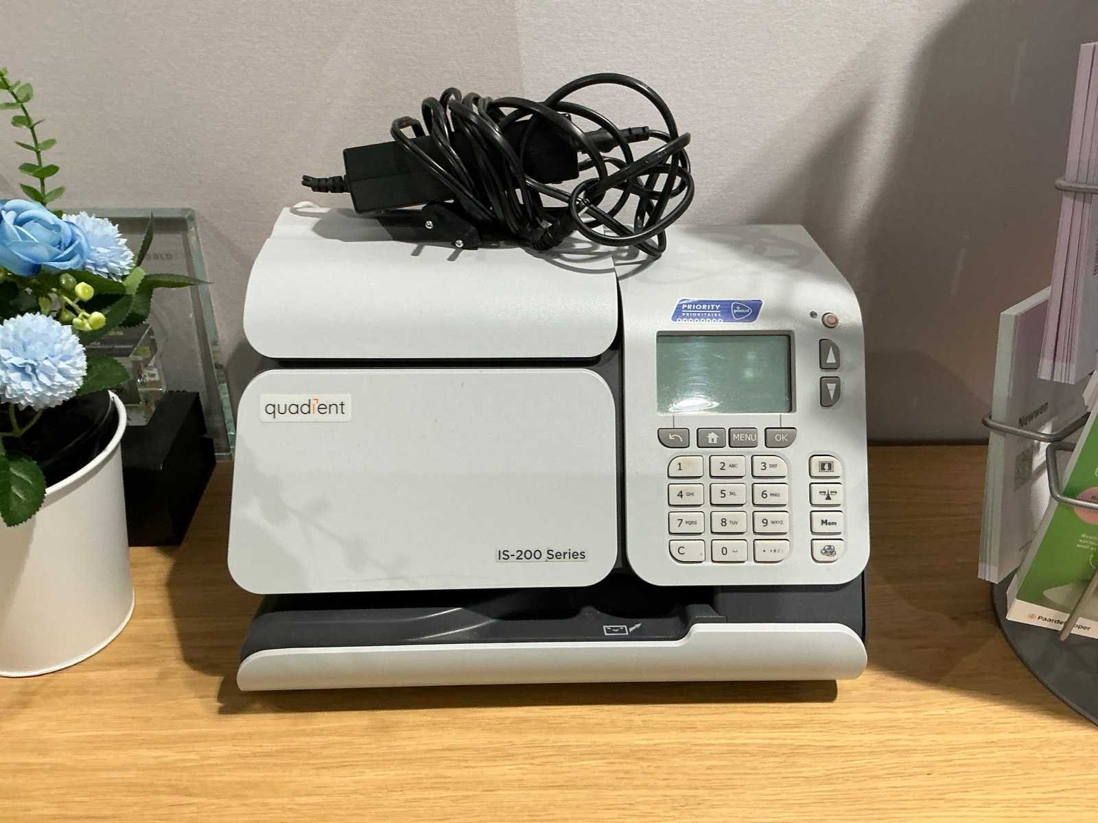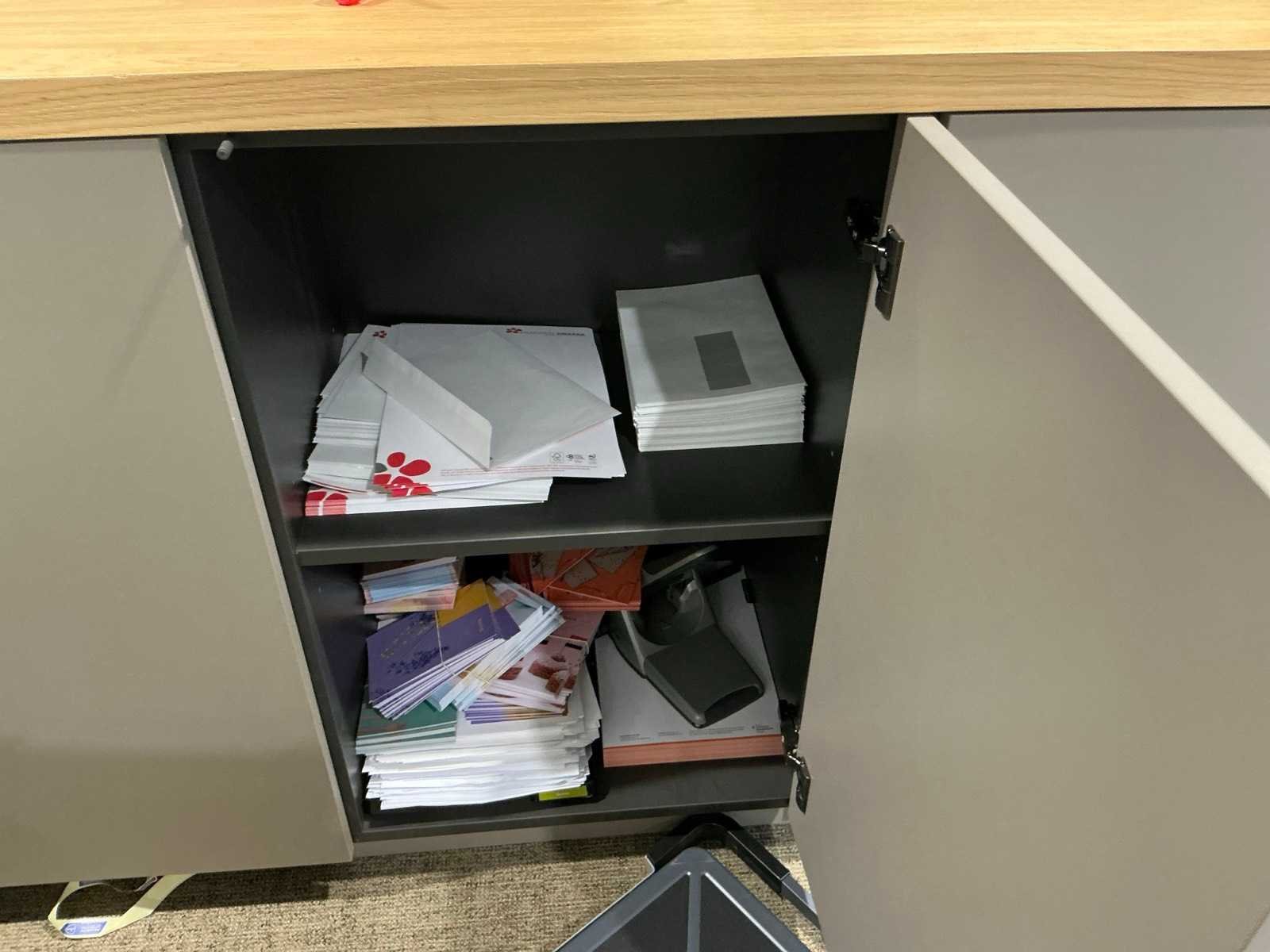 Voorzien van 2 Luxy bureaustoelen, Dymo pakketweegschaal, Quadient IS-200 frankeermachine. Met inhoud van de opbergkast Lengte: 208cm Breedte: 40cm Hoogte: 91cm