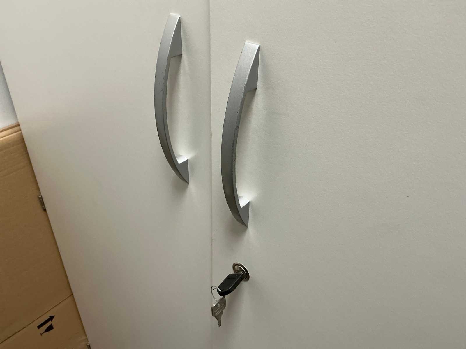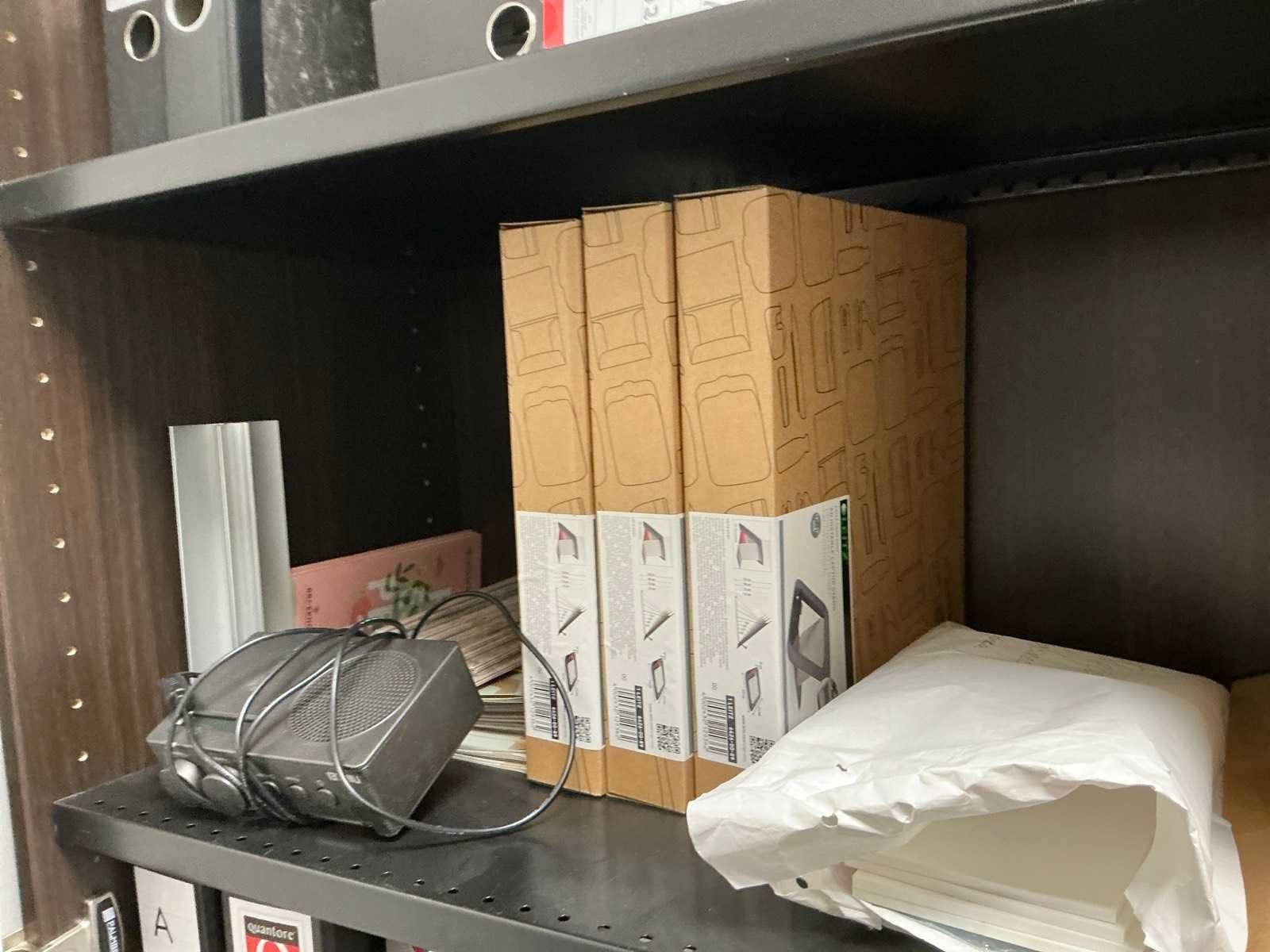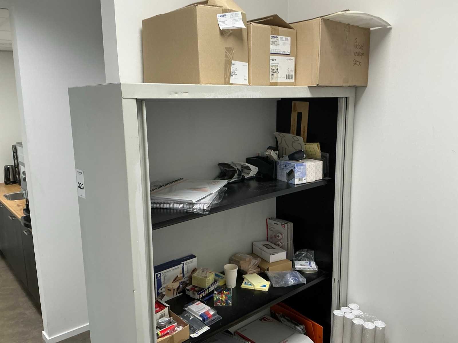 Met roldeurkast voorzien van inhoud bestaande uit kantoorgerief. Zonder de administratie. Merk: Palmberg Lengte: 100cm Breedte: 45cm Hoogte: 227cm