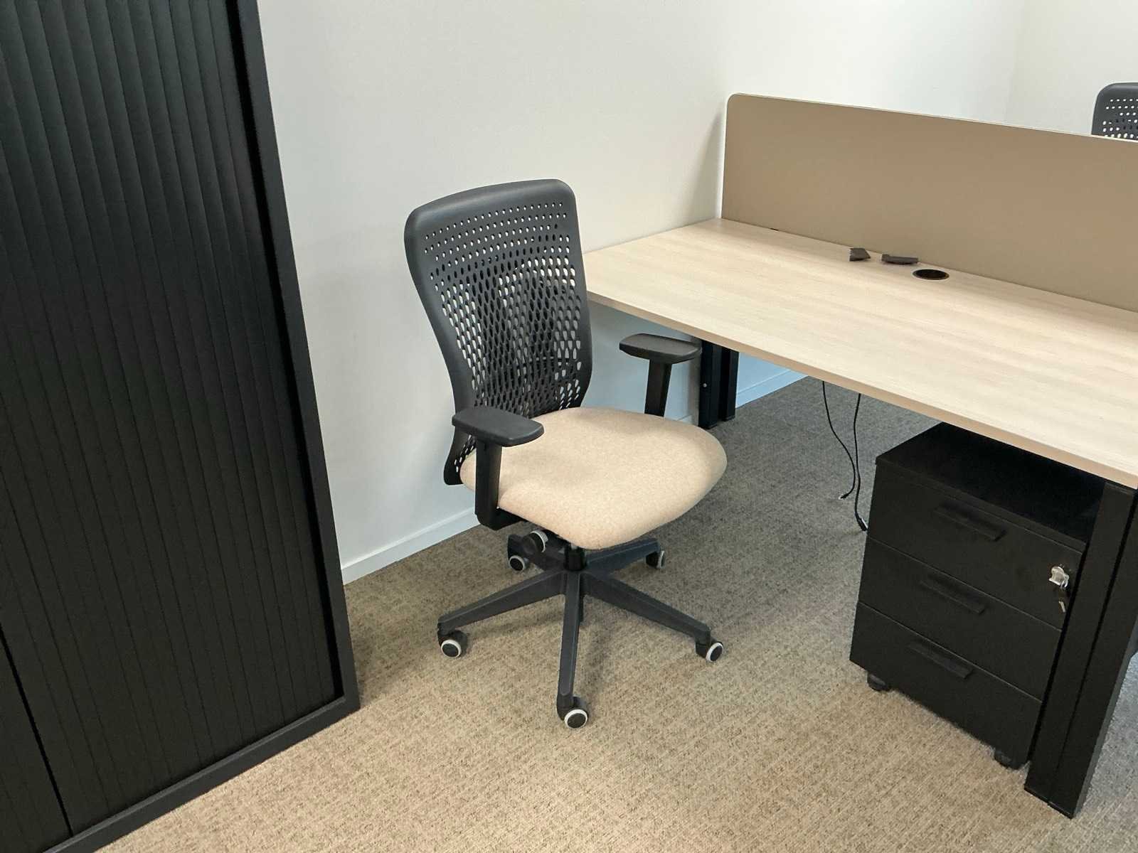 Met 3 ladekasten en 3 Luxy bureaustoelen. Merk: Bralco Lengte: 160cm Breedte: 80cm Hoogte: 74cm