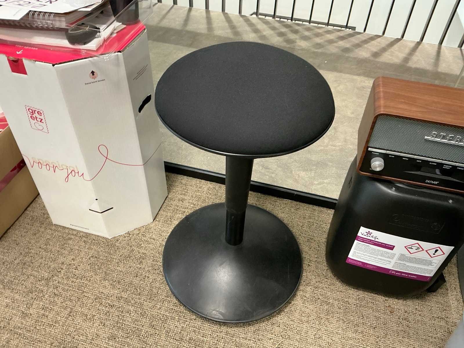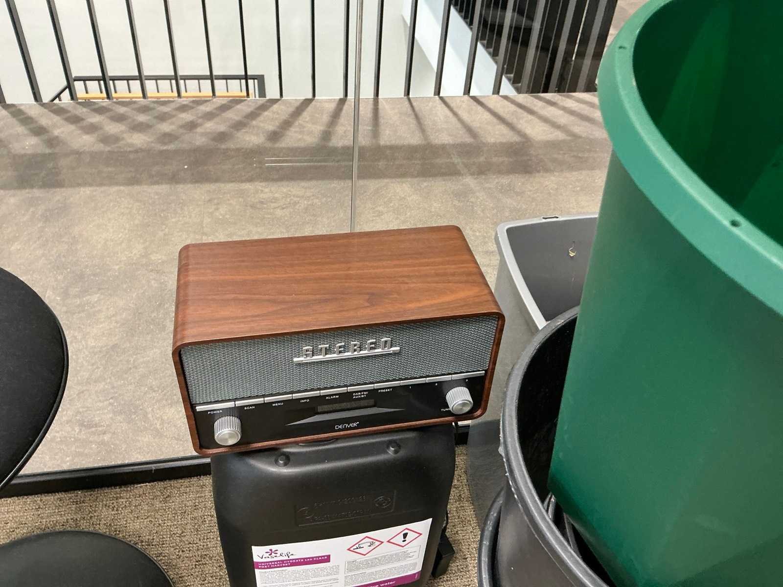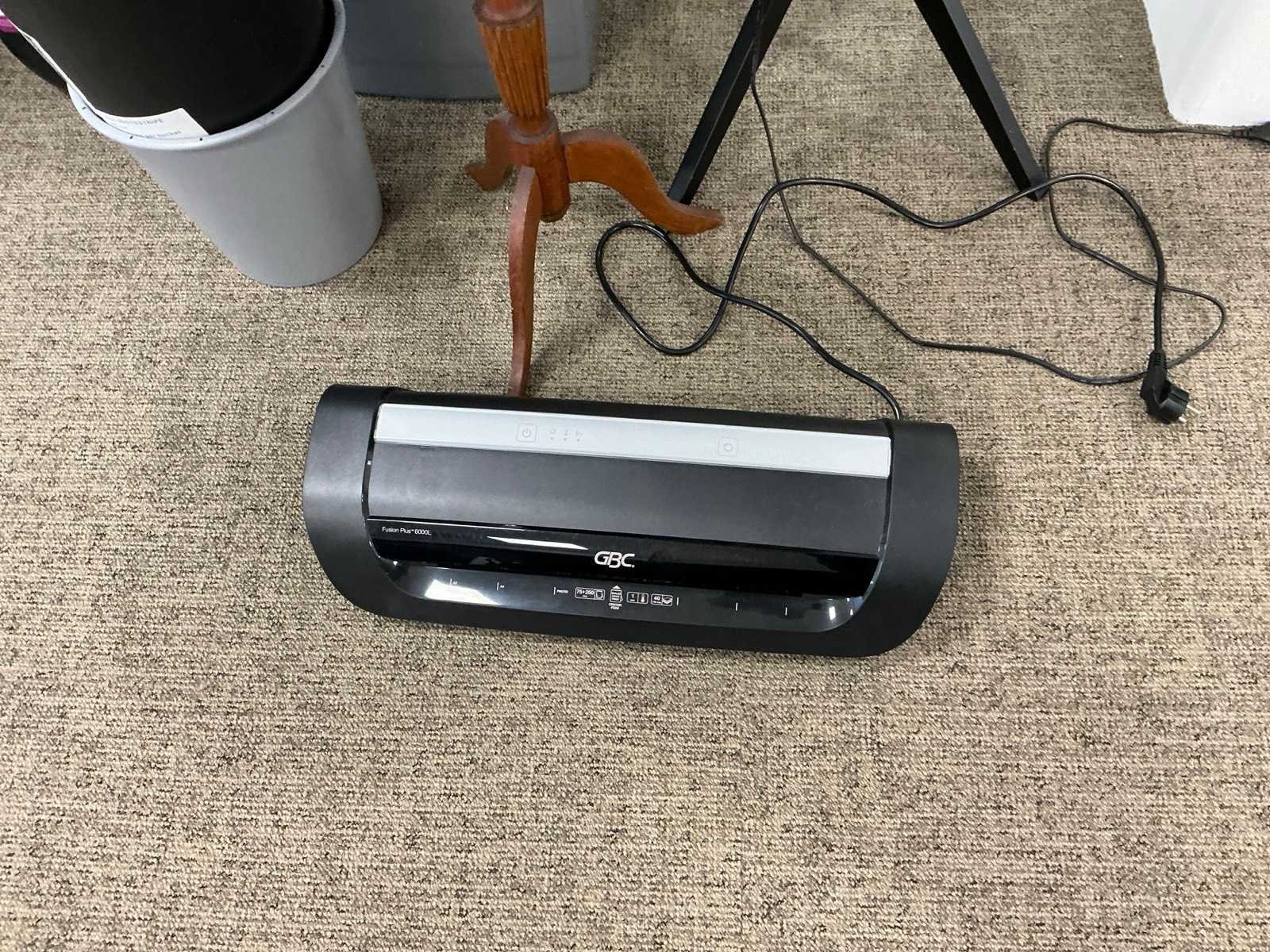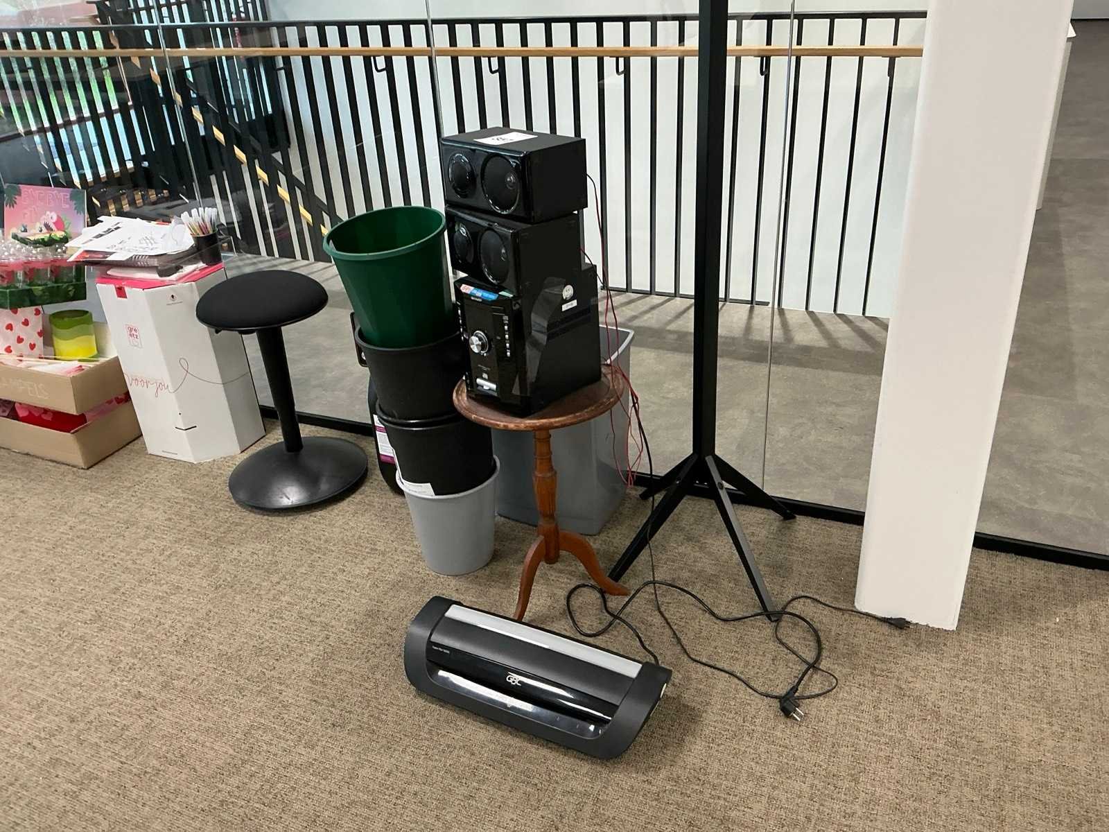 Bestaande uit GBC Fusion Plus 6000L lamineermachine, Sharp stereotoren, Denver radio, wiebelkruk, bloemenemmers, bijzettafel met bloempotten, etagère, 2x kapstokken