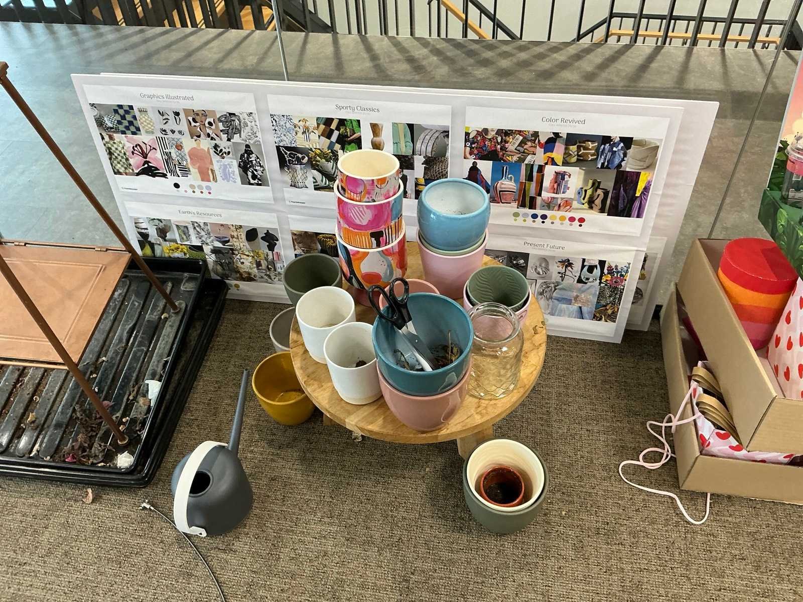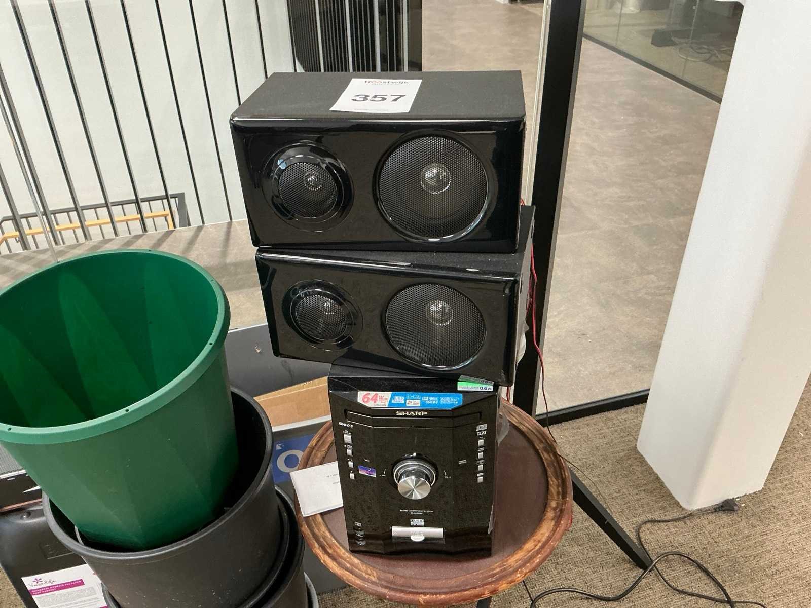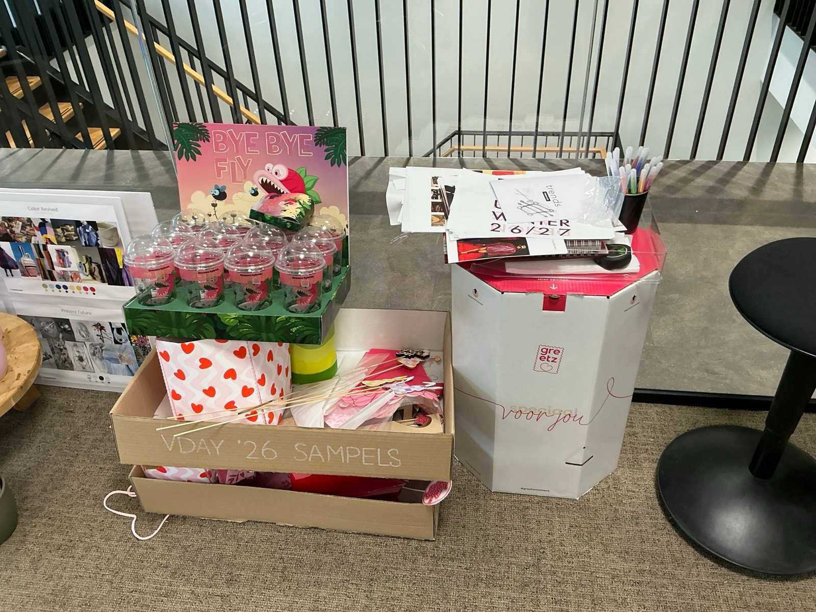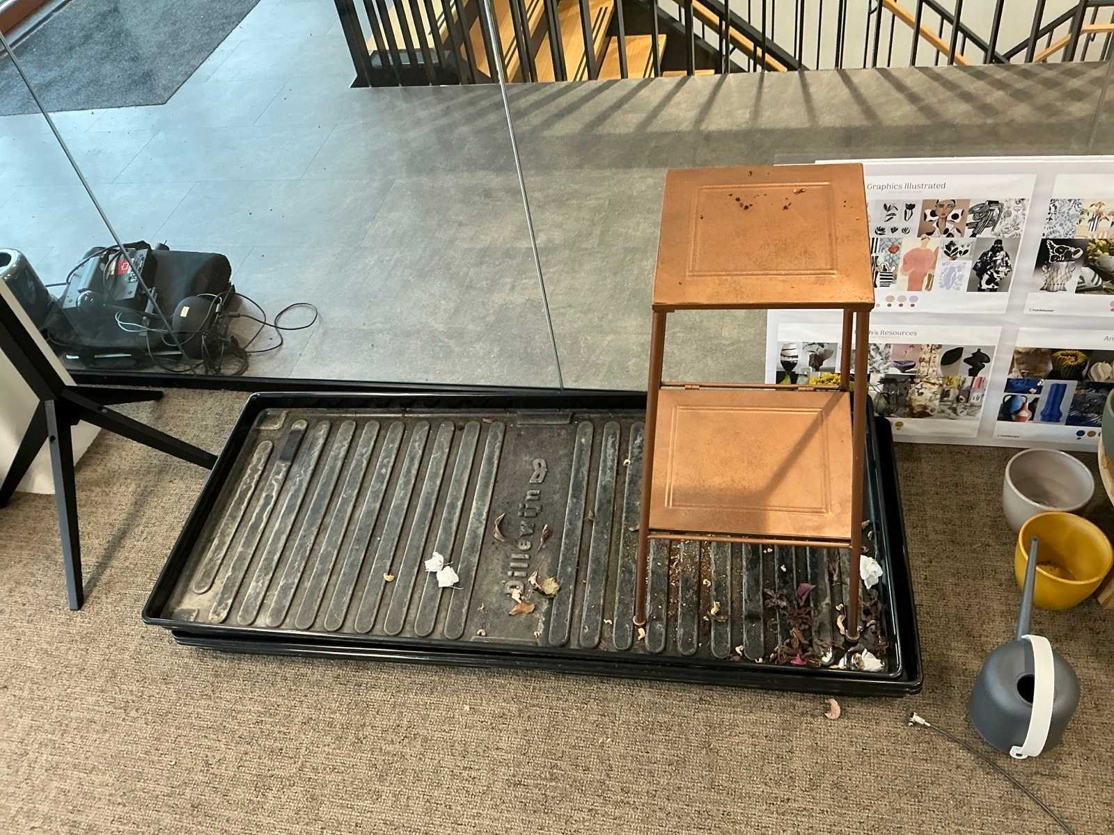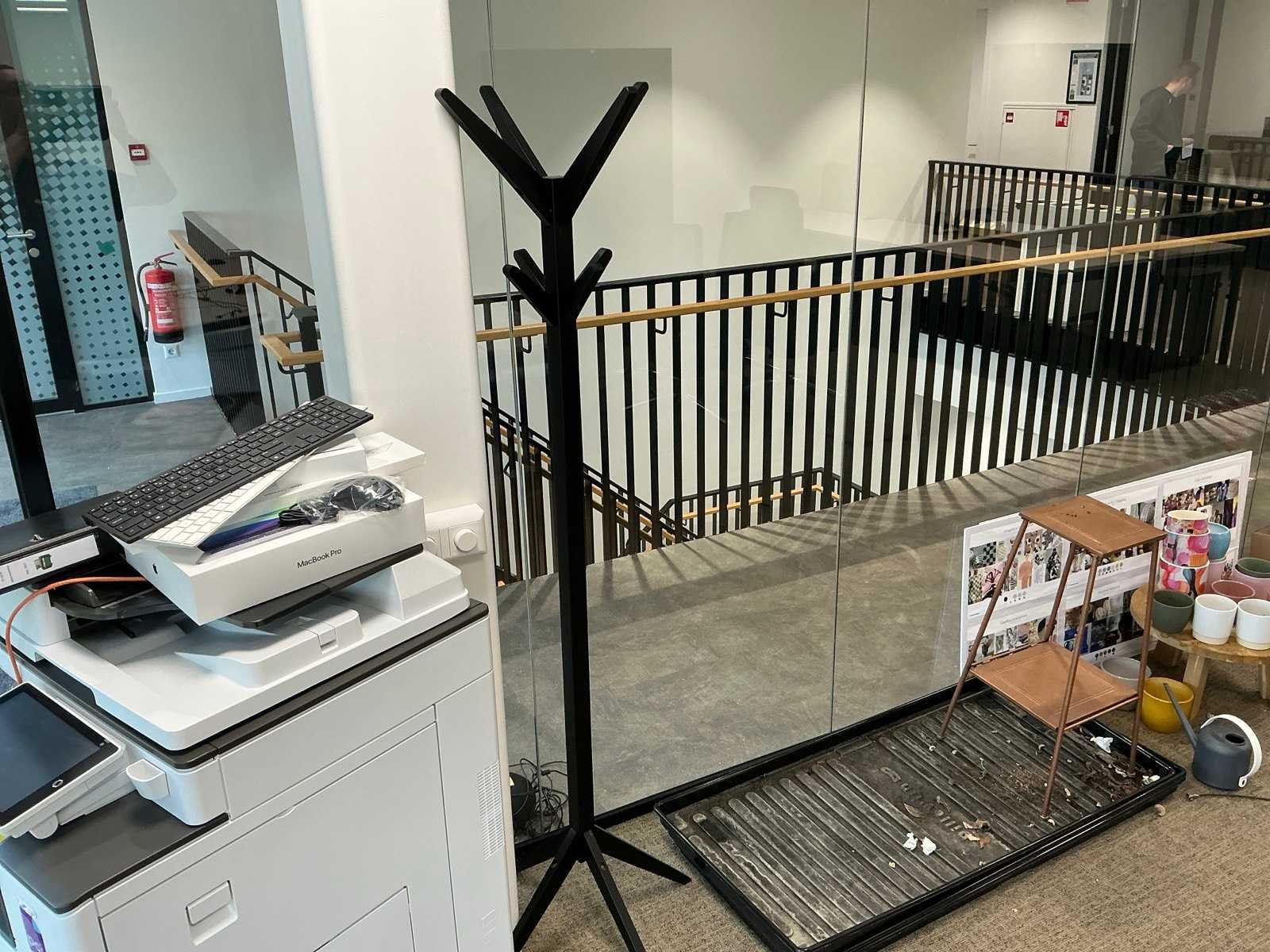 Bestaande uit GBC Fusion Plus 6000L lamineermachine, Sharp stereotoren, Denver radio, wiebelkruk, bloemenemmers, bijzettafel met bloempotten, etagère, 2x kapstokken