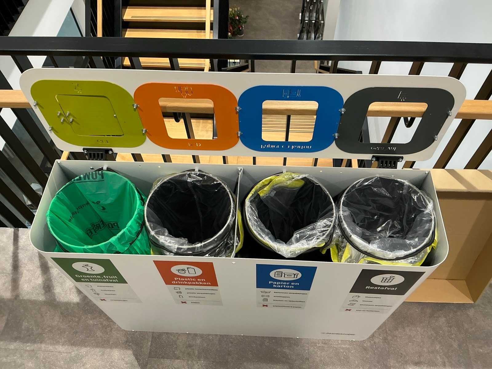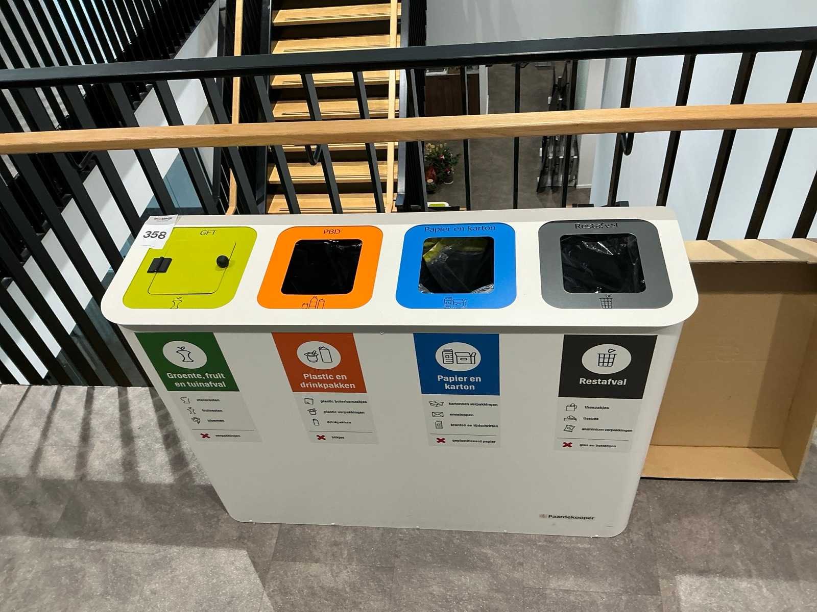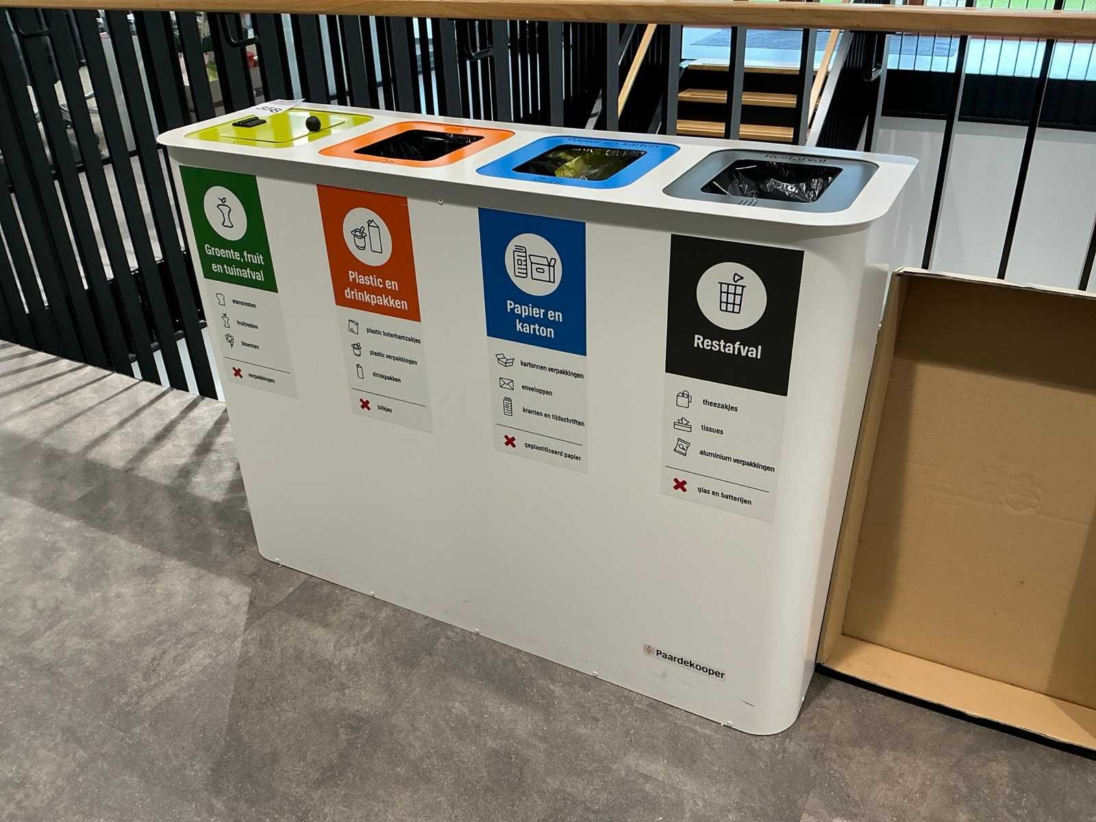 Voorzien van 4 afvalbakken. Model: Paardekoper Lengte: 114cm Breedte: 33.5cm Hoogte: 83cm Materiaal: Metaal