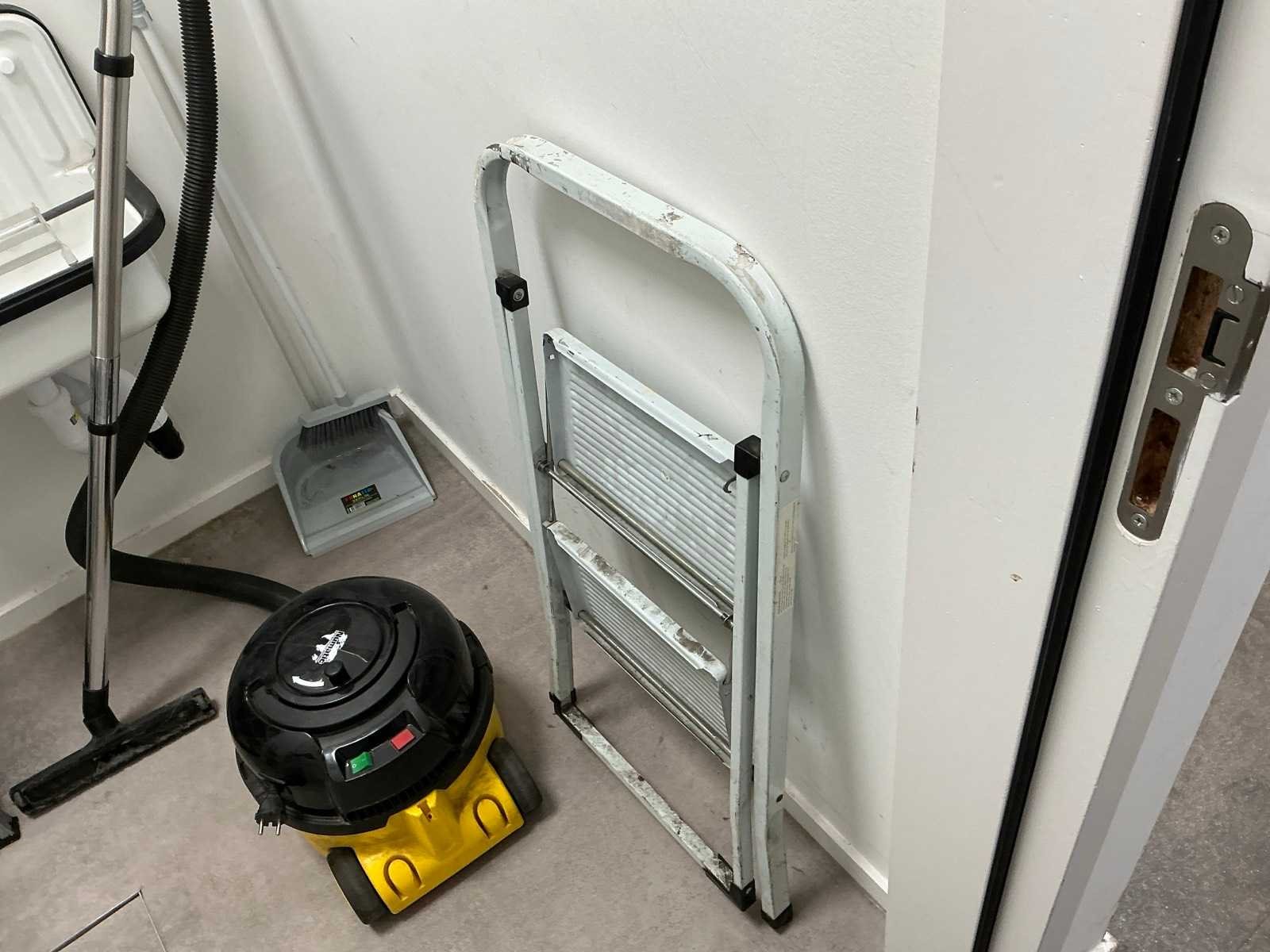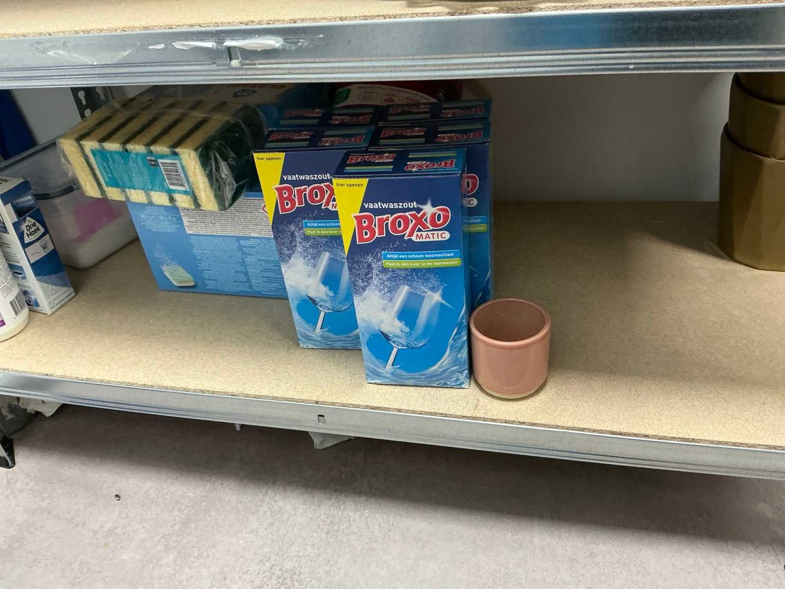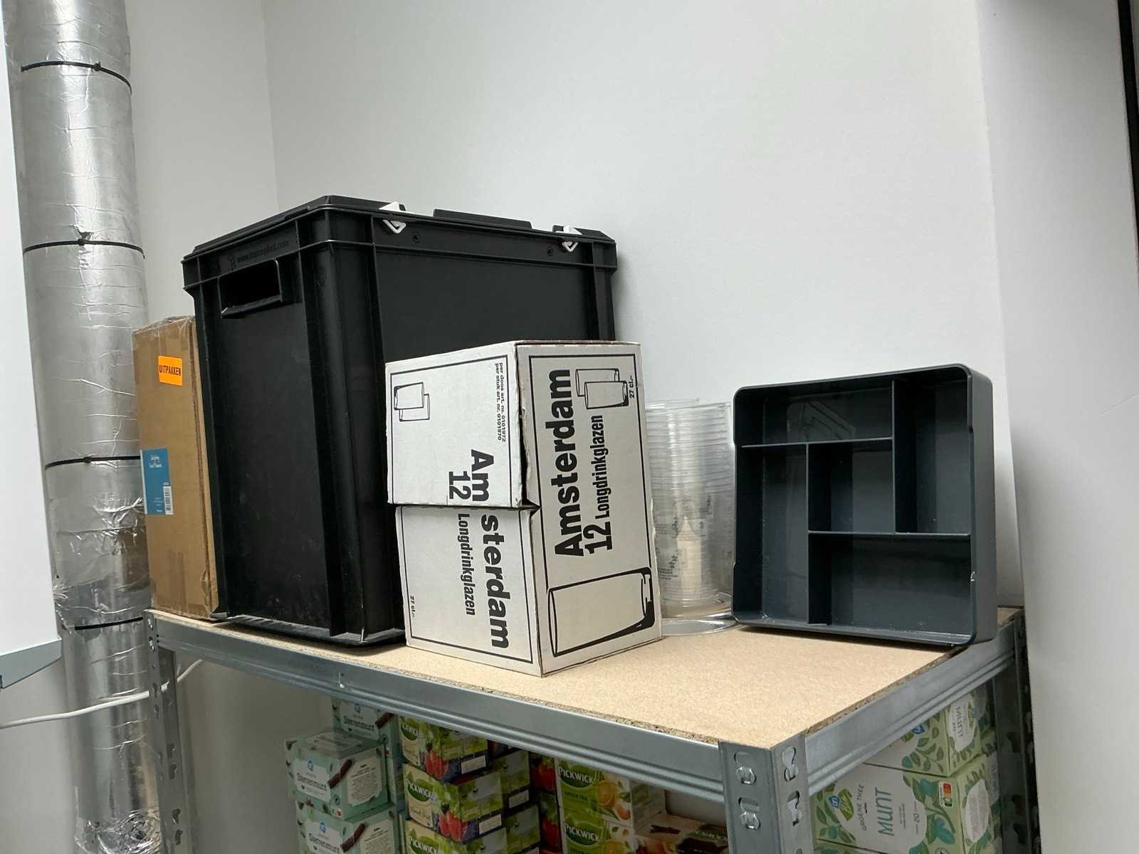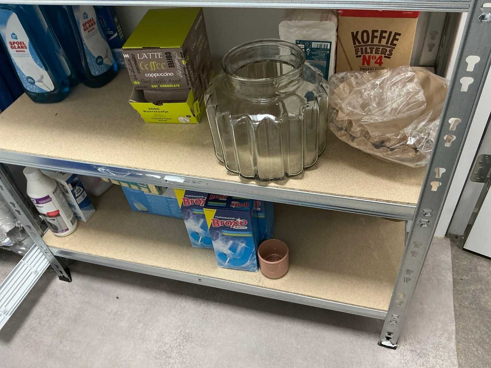 Bestaande uit koffie en theevoorraad, 2 magazijnstellingen met inhoud, Numatic stofzuiger, glaswerk, bestek. Zonder de los verkavelde koffiemachine en wasmachine.