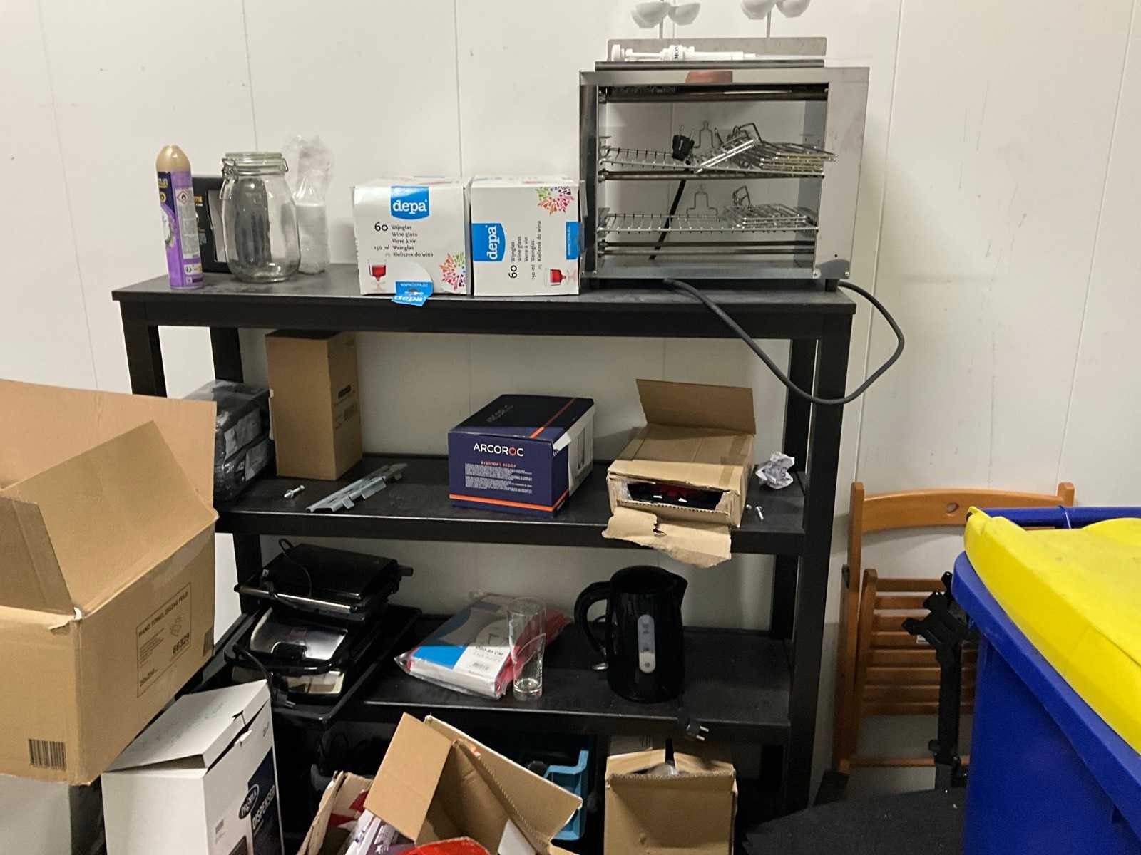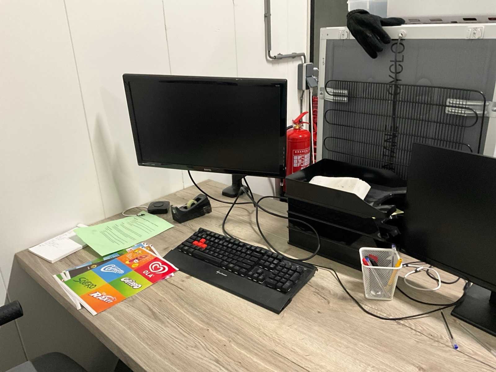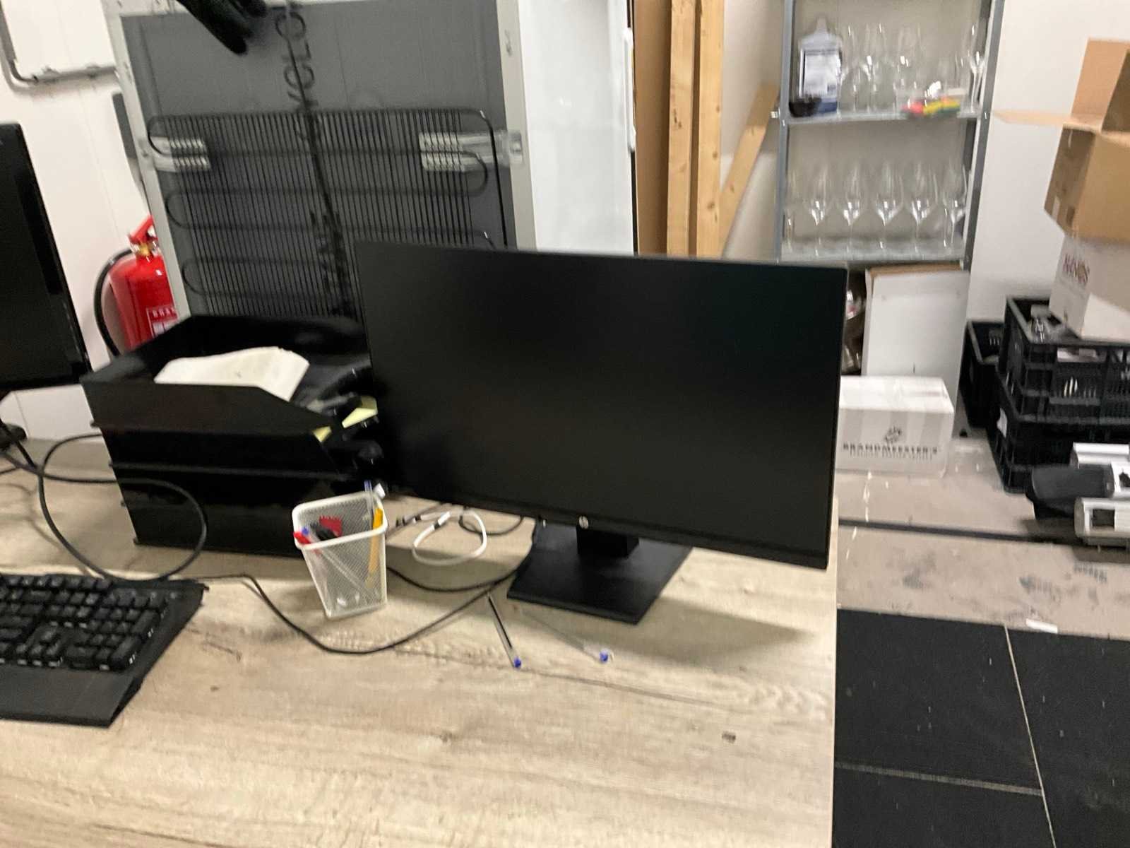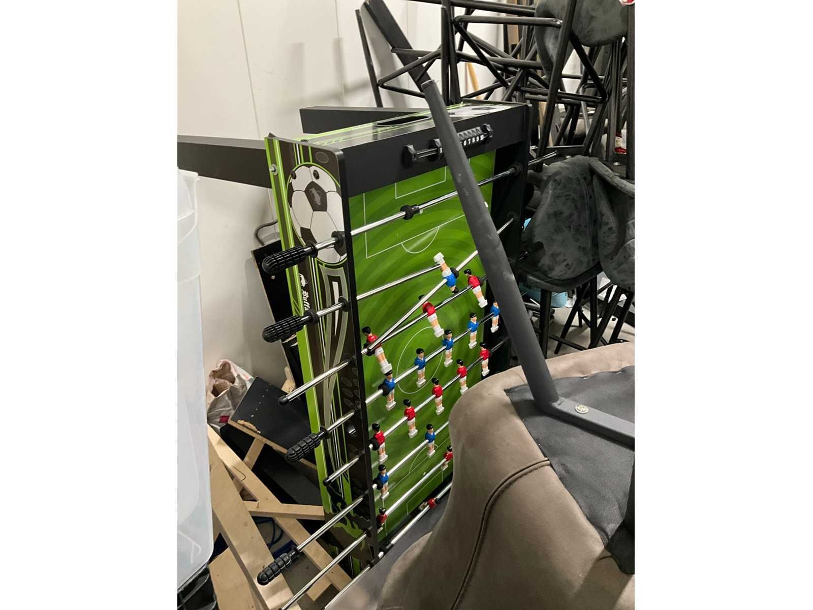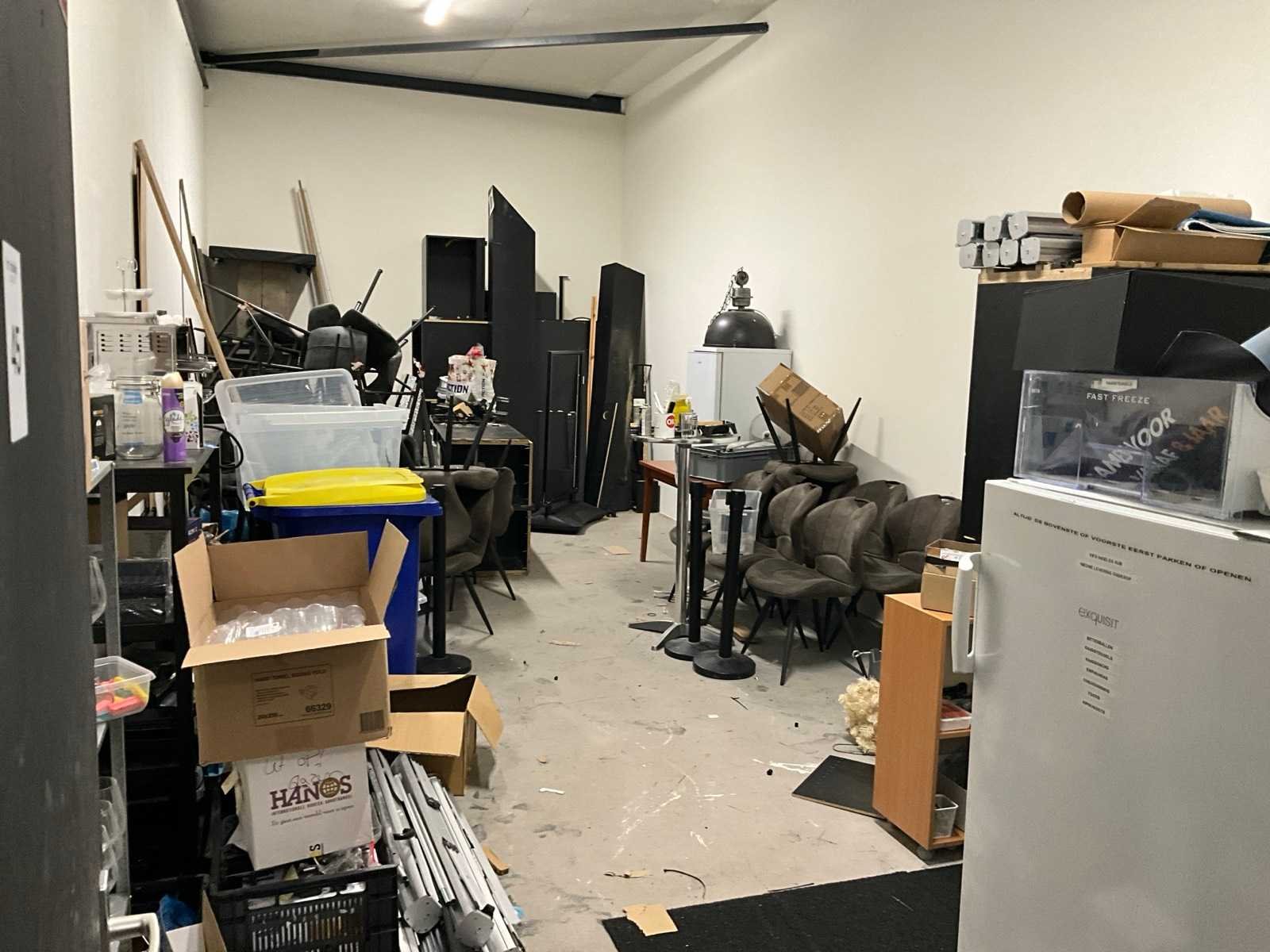 Bestaande uit stoelen, koelkast en vriezer, tafelvoetbalspel, tafels, kastonderdelen, glazen, beeldschermen en buro met stoelen.
