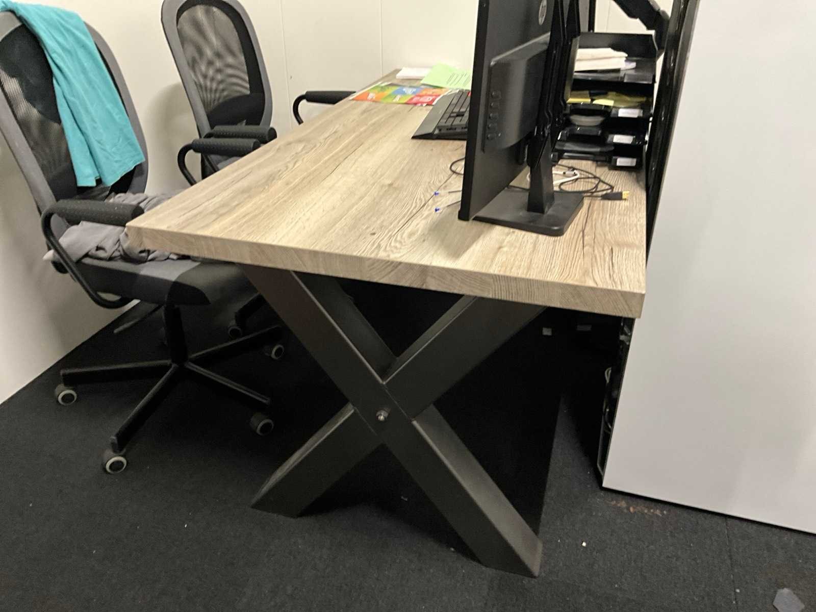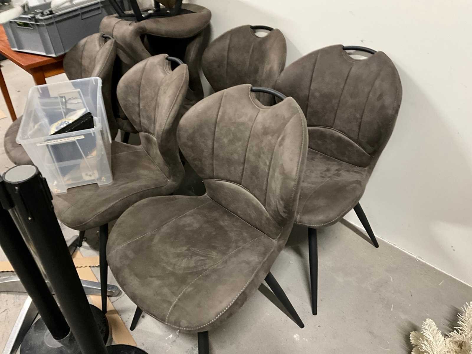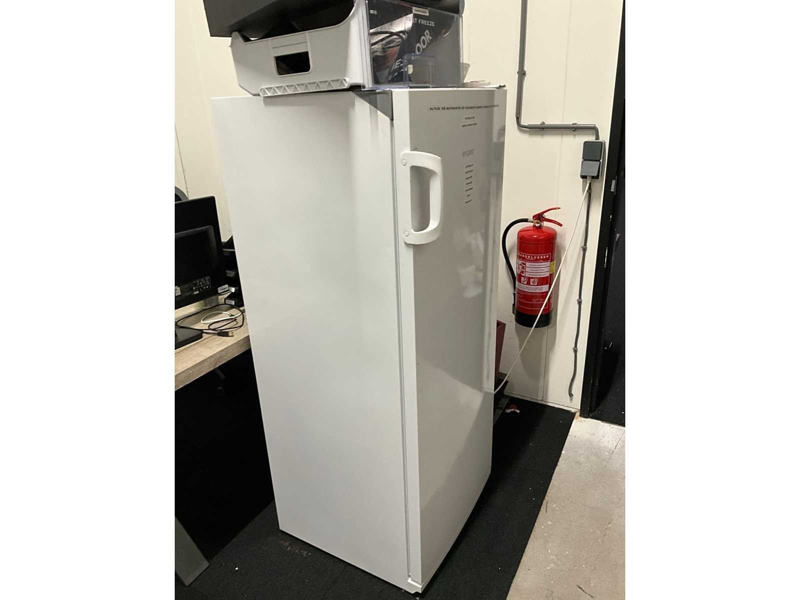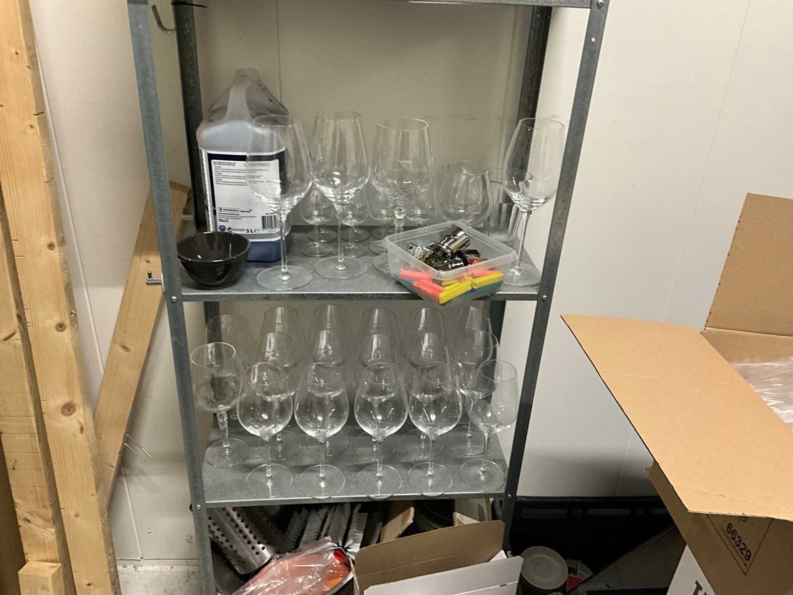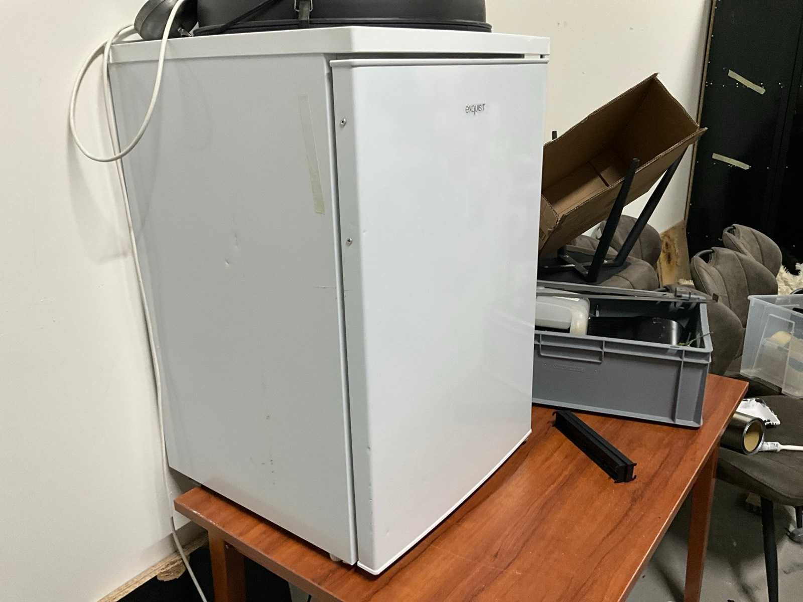 Bestaande uit stoelen, koelkast en vriezer, tafelvoetbalspel, tafels, kastonderdelen, glazen, beeldschermen en buro met stoelen.