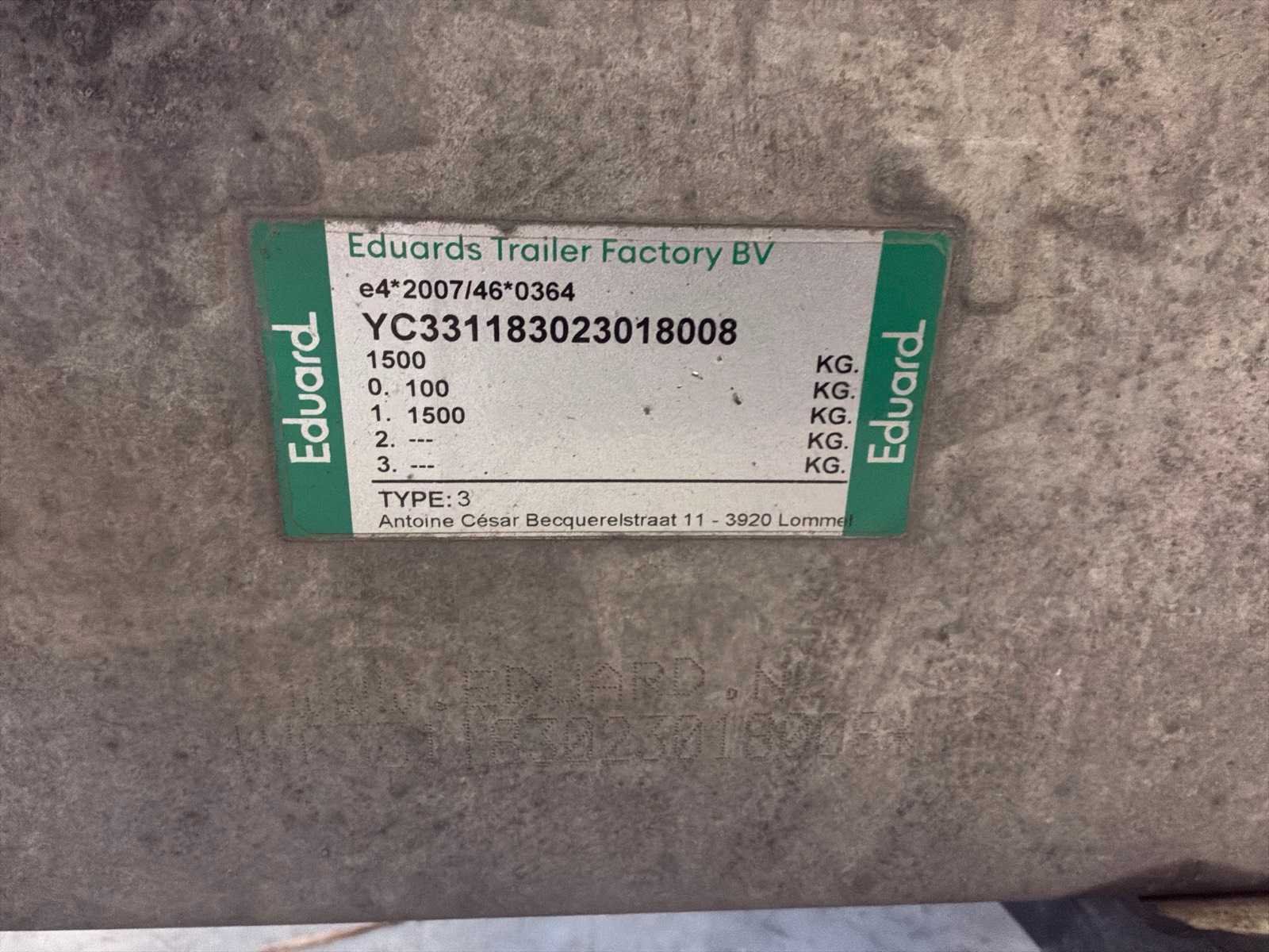 Let op! Dit voertuig heeft een kentekenregristratie, bij afhalen dient u dit ter plaatse bij een derde partij te naam te stellen of te exporteren. Hier ijn extra kosten aan verbonden. Merk: Eduard Bouwjaar: 2023 Chassisnummer: YC331183023018008 Aantal assen: 1 Laadbak afmeting l: 315cm Laadbak afmeting b: 183cm Ledig gewicht: 356kg Laadvermogen: 1144kg Datum eerste toelating: 2023-11-24 Datum eerste toelating (NL): 2023-11-24 Kenteken: 03-WJX-4 Lengte: 445cm Nationaliteit documenten: Nederlands Zelf rijdend exporteren: Mogelijk
