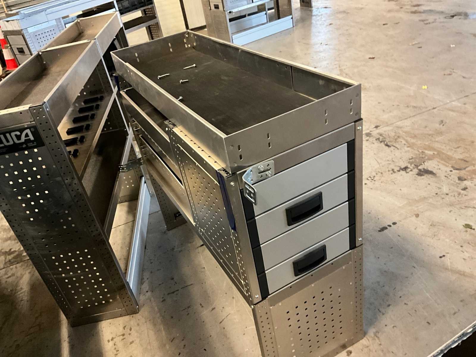 Bestaande uit 2x kast, afmeting circa: 42x119x106 cm en 32x199x105 cm, voorzien van assortimentbak opbergsysteem. Merk: Aluca Lengte: 42cm Breedte: 119cm Hoogte: 106cm Materiaal: Aluminum