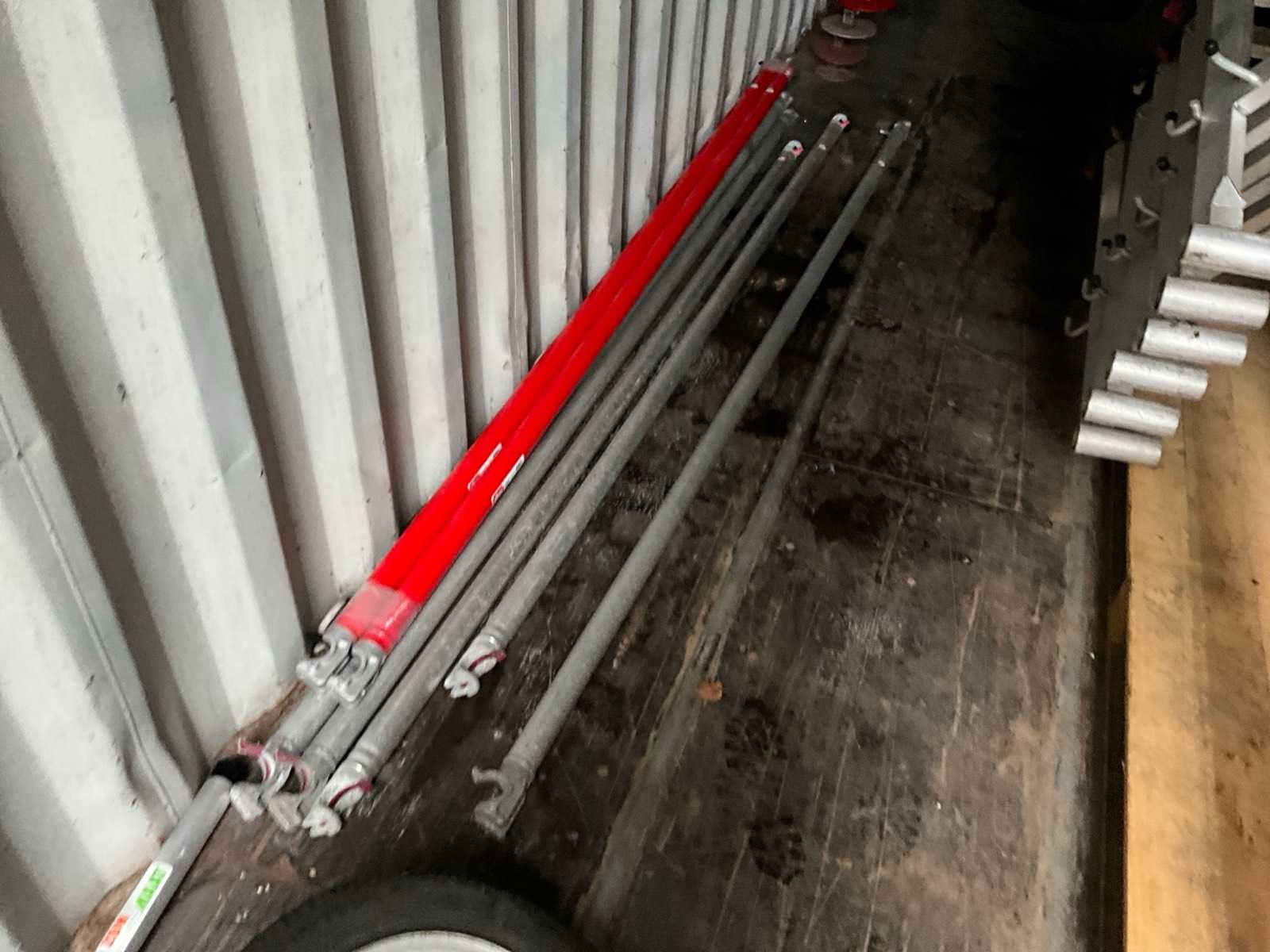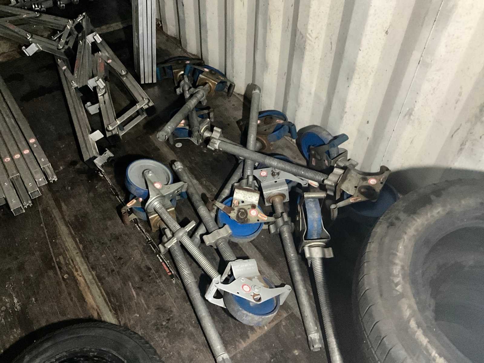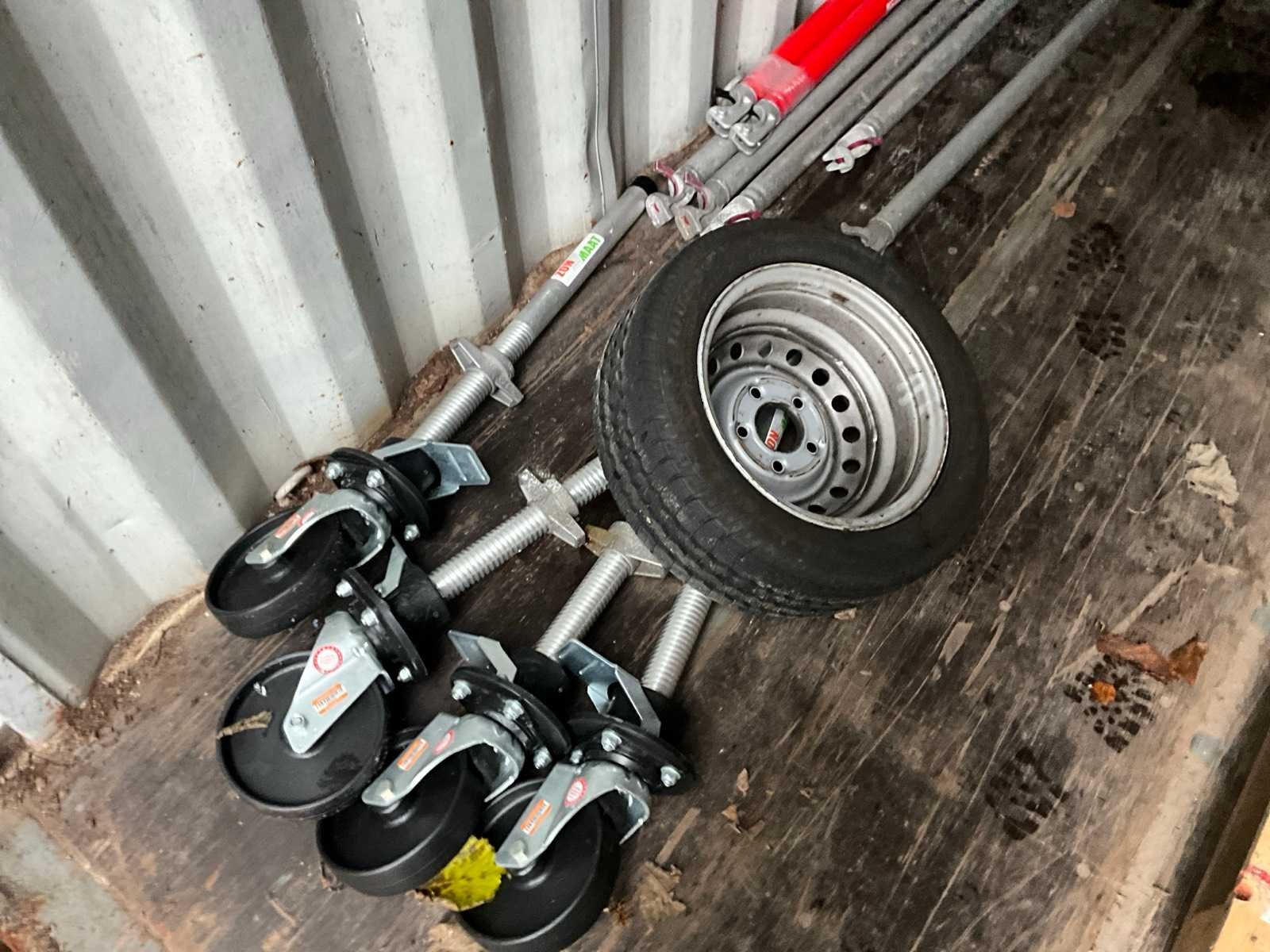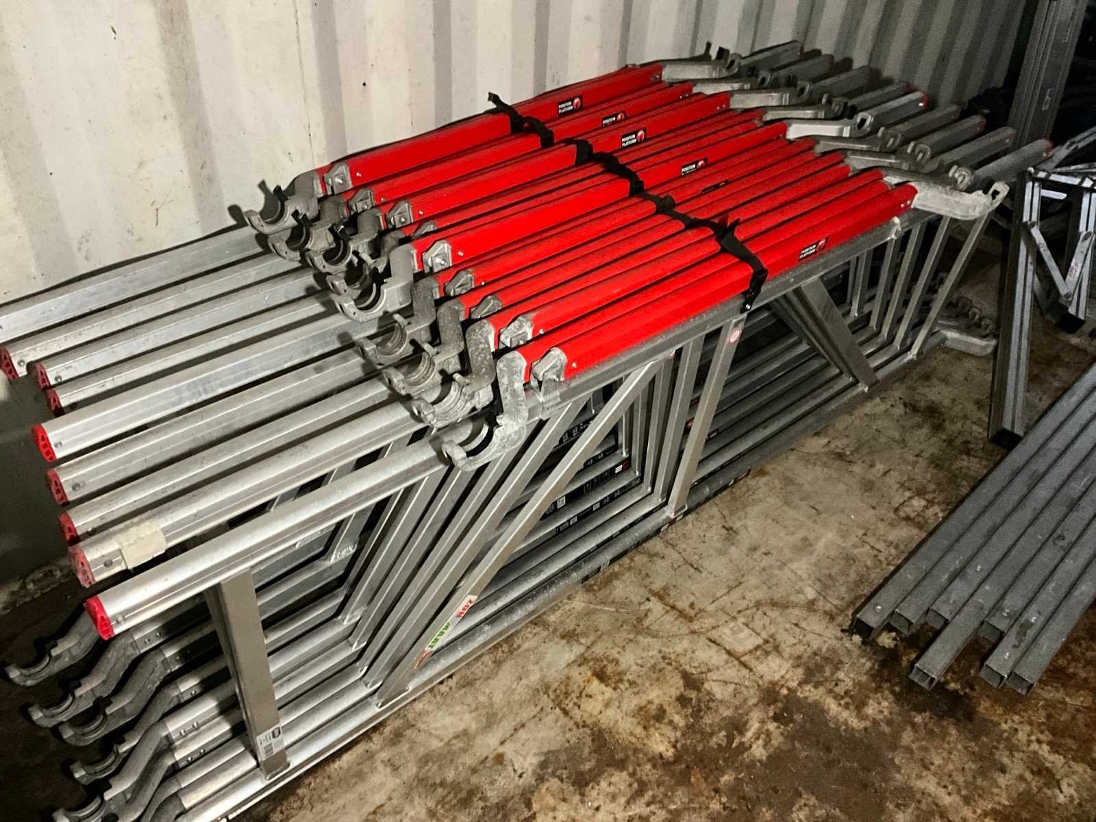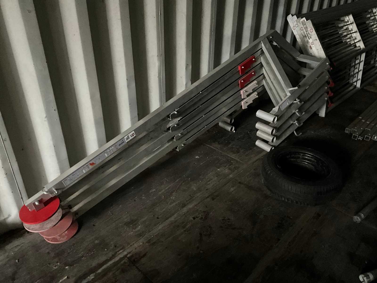 Waaronder: 10x RSS Staander schuindak, 8x Dakrandbeveiliging. Inclusief divers steigermateriaal, aanhanger wielen en divers, 40 ft zeecontainer niet inbegrepen.