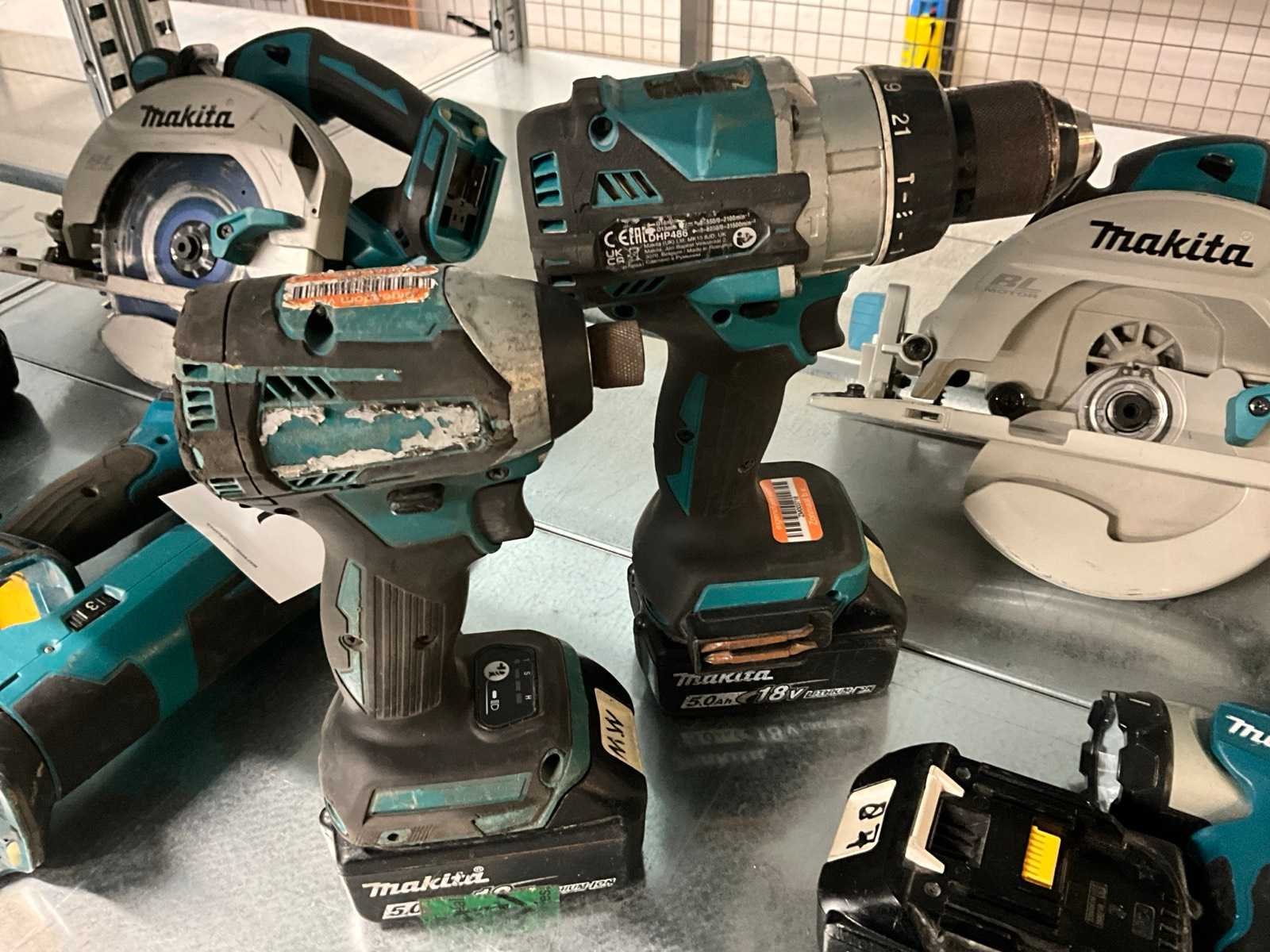 Bestaande uit: slagschroevendraaier, schroefboormachine, multi-tool, cirkelzaag en loop lamp Merk: Makita Accu type: 18 V 5Ah Aantal accu's: 4