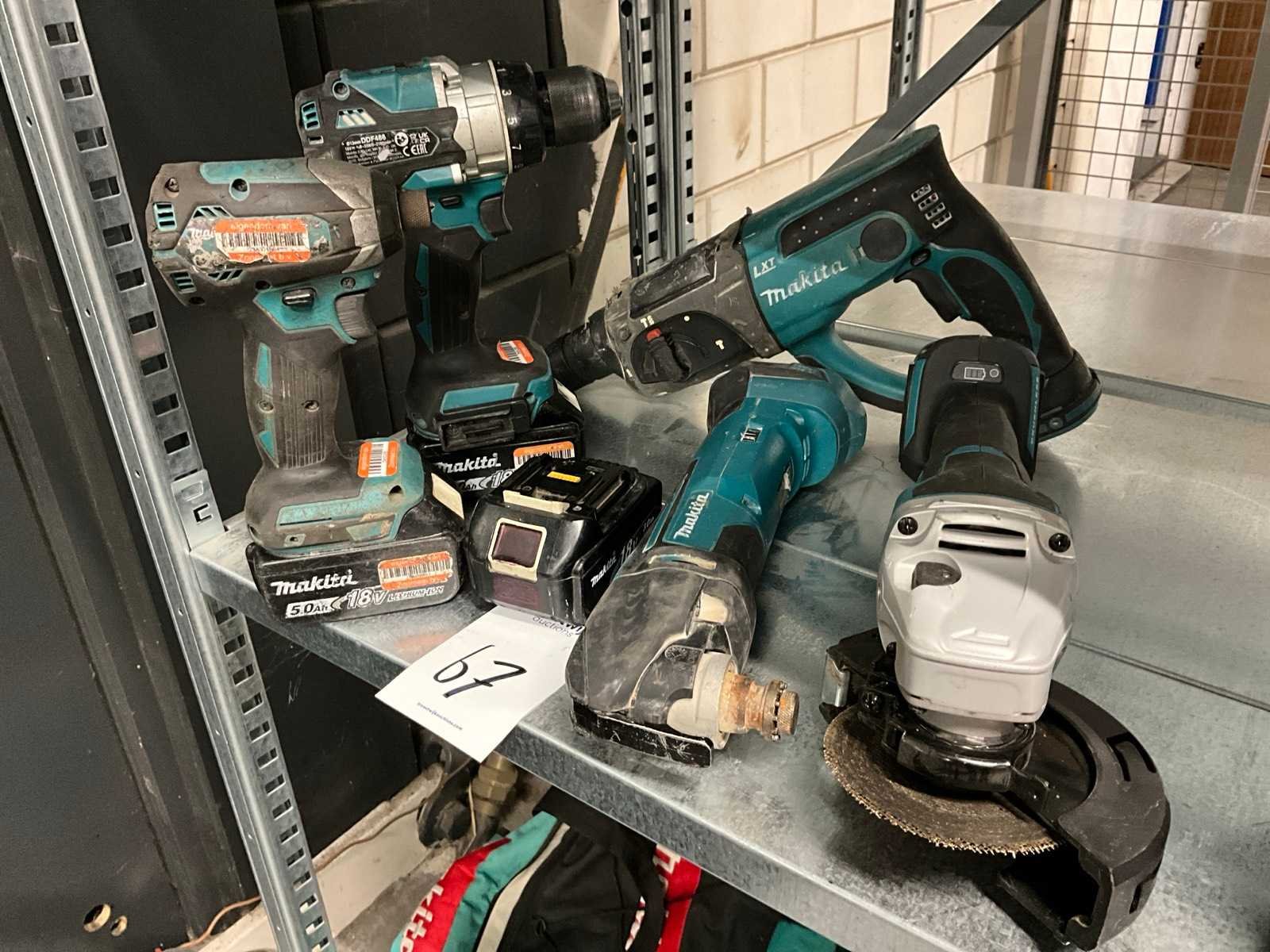 Bestaande uit: slagschroevendraaier, schroefboormachine, haakse slijpmachine, multi-tool, combihamer. Merk: Makita Accu type: 18 V 5Ah Aantal accu's: 3