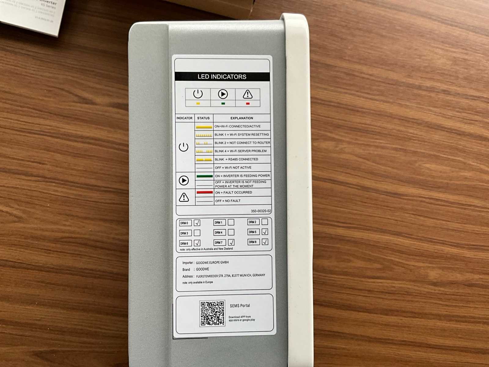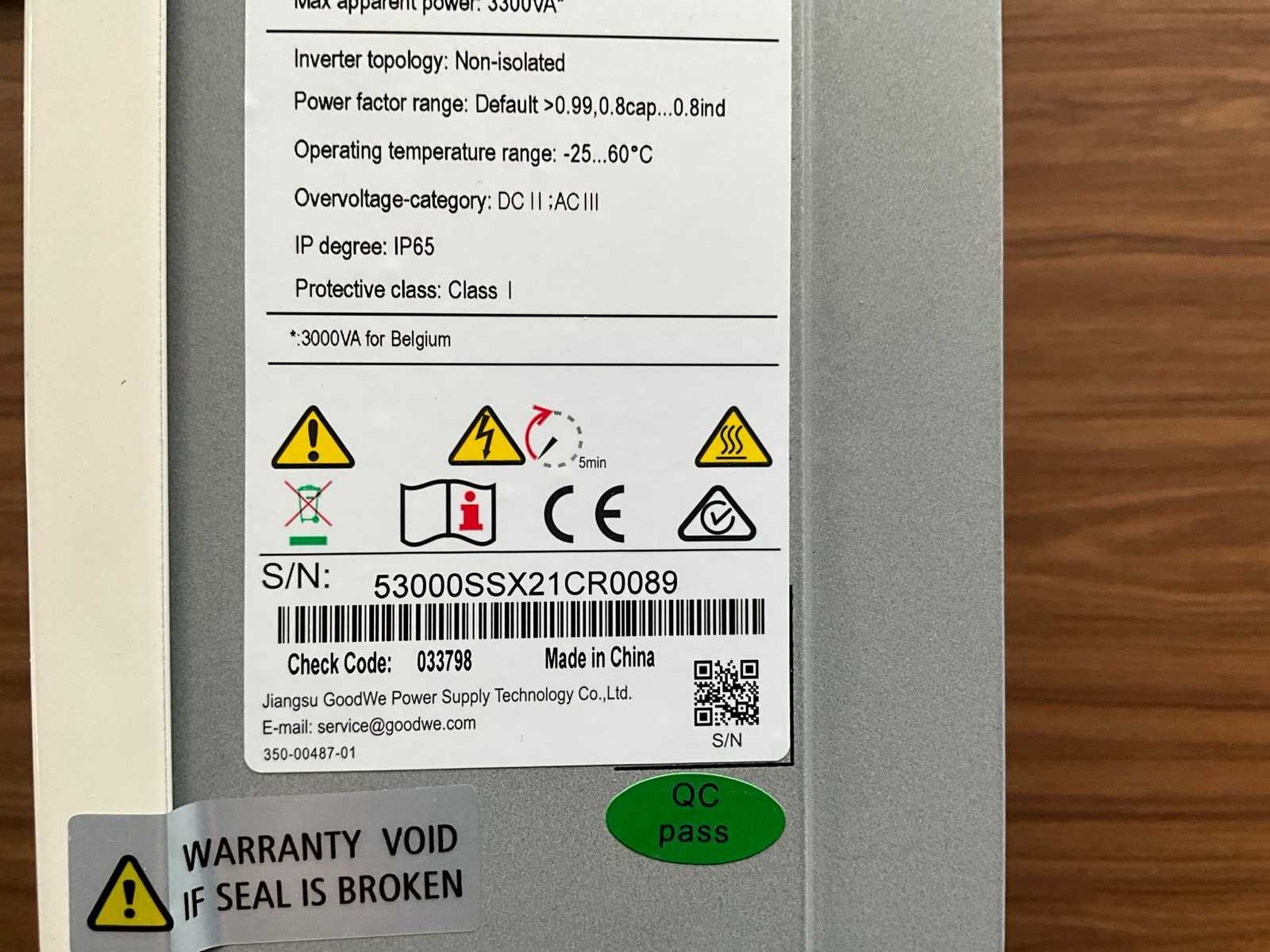 Merk: Goodwe Type: GW3000-XS Serienummer: 53000SSX21CR0089 Totale afmeting L: 120mm Totale afmeting Breedte: 300mm Totale afmeting Hoogte: 230mm