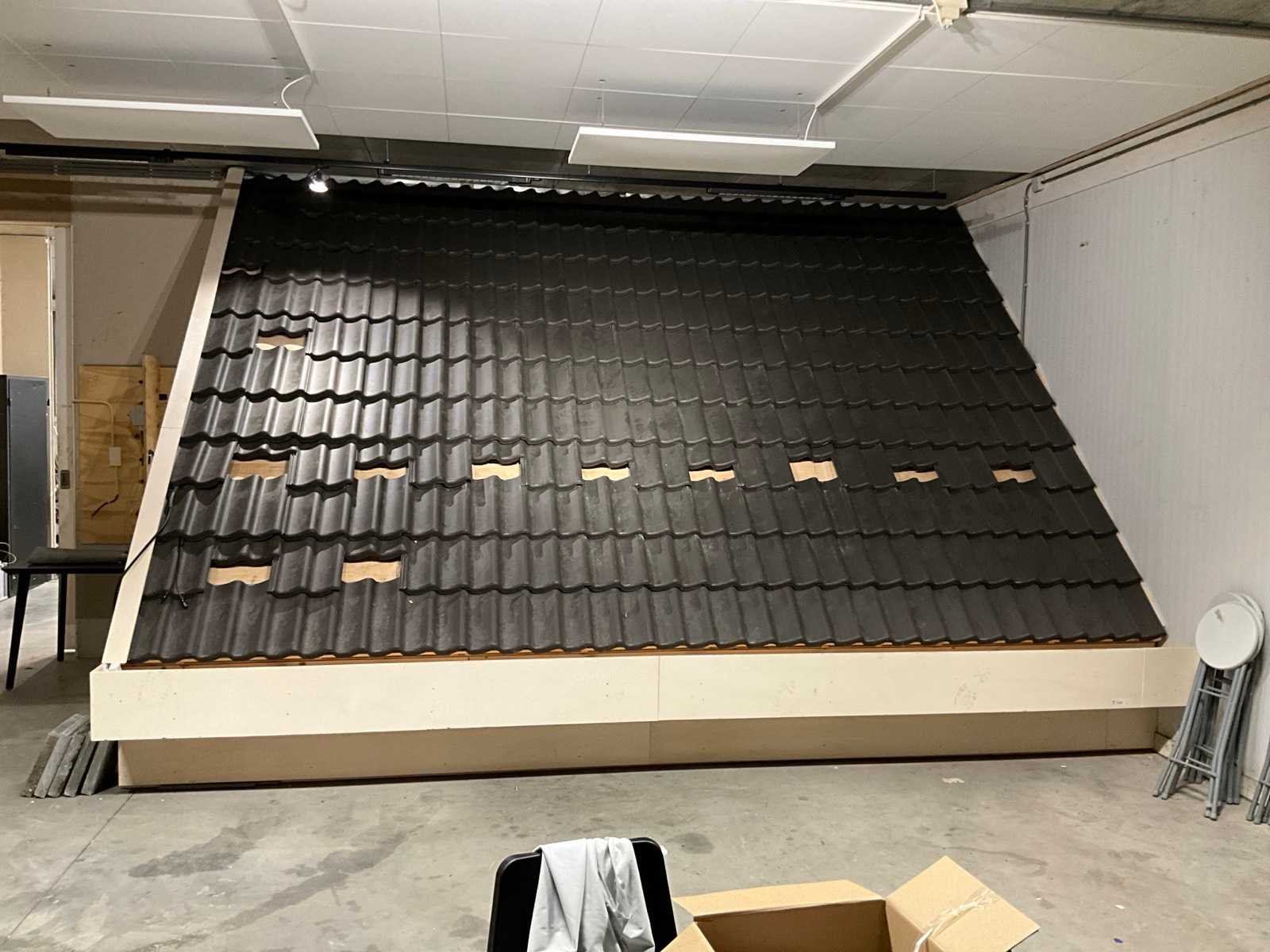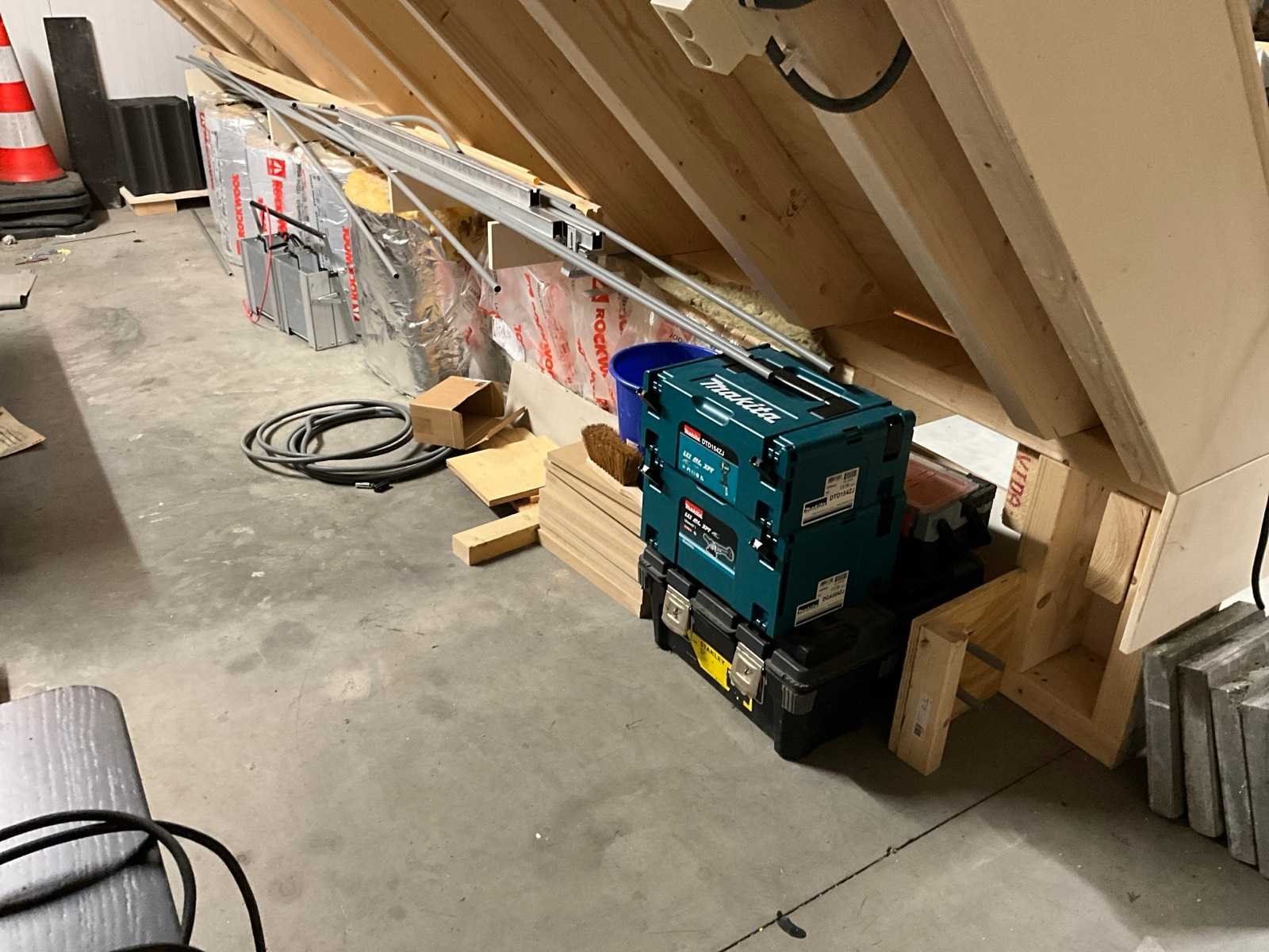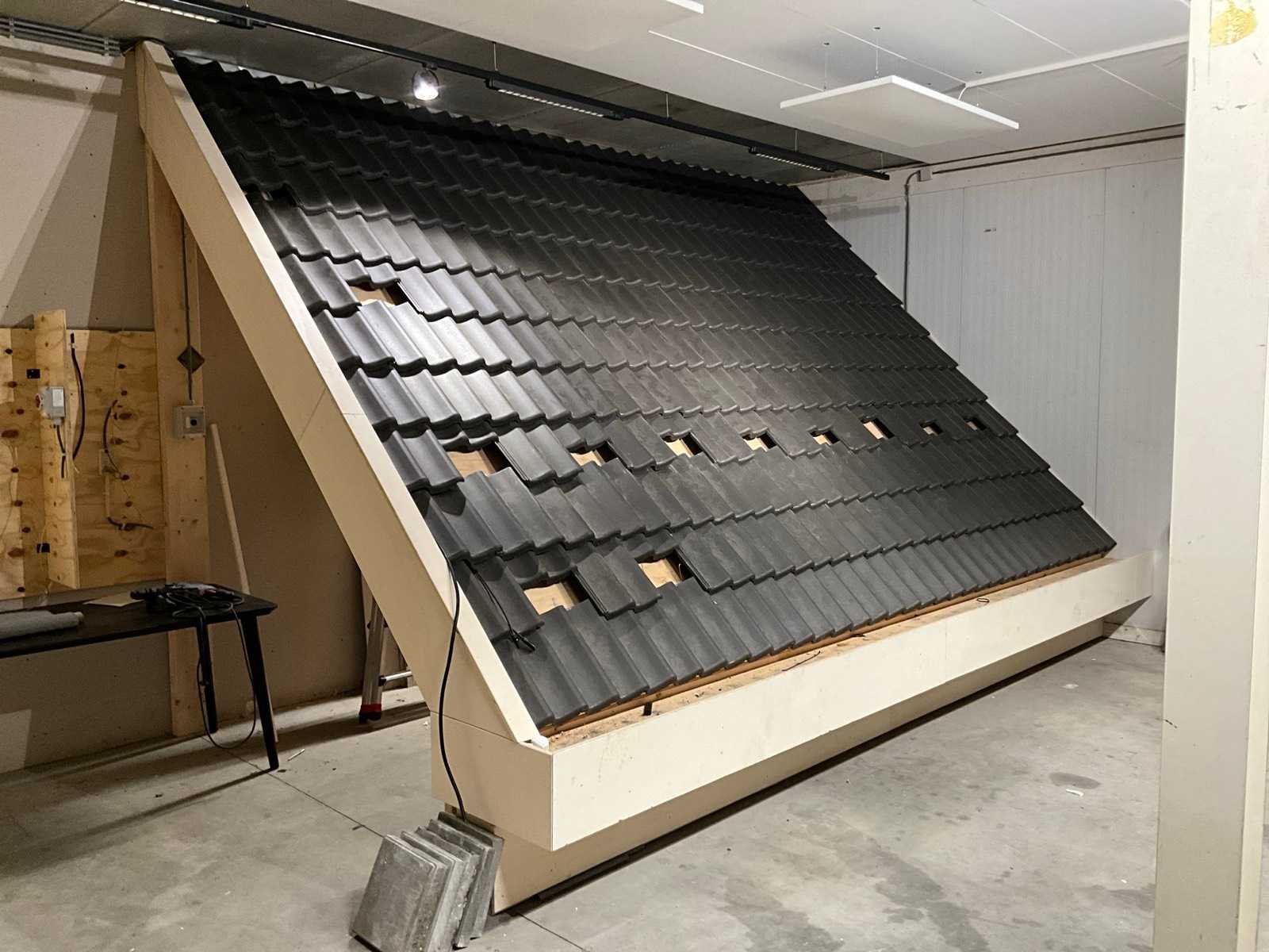 Bestaande uit schuine dak opbouw voor les doeleinde afmetingen (520x390cm) 8x tafel (140x78x75cm) 15x kunststof stoel, 3x archiefkast, Samsung televisie op onderstel, 5x test opstelling meterkast, afgekeurde dakrand beveiliging, 7x sta tafel rond, 10x kruk, 6X bouw stofzuiger, diverse installatie materialen.