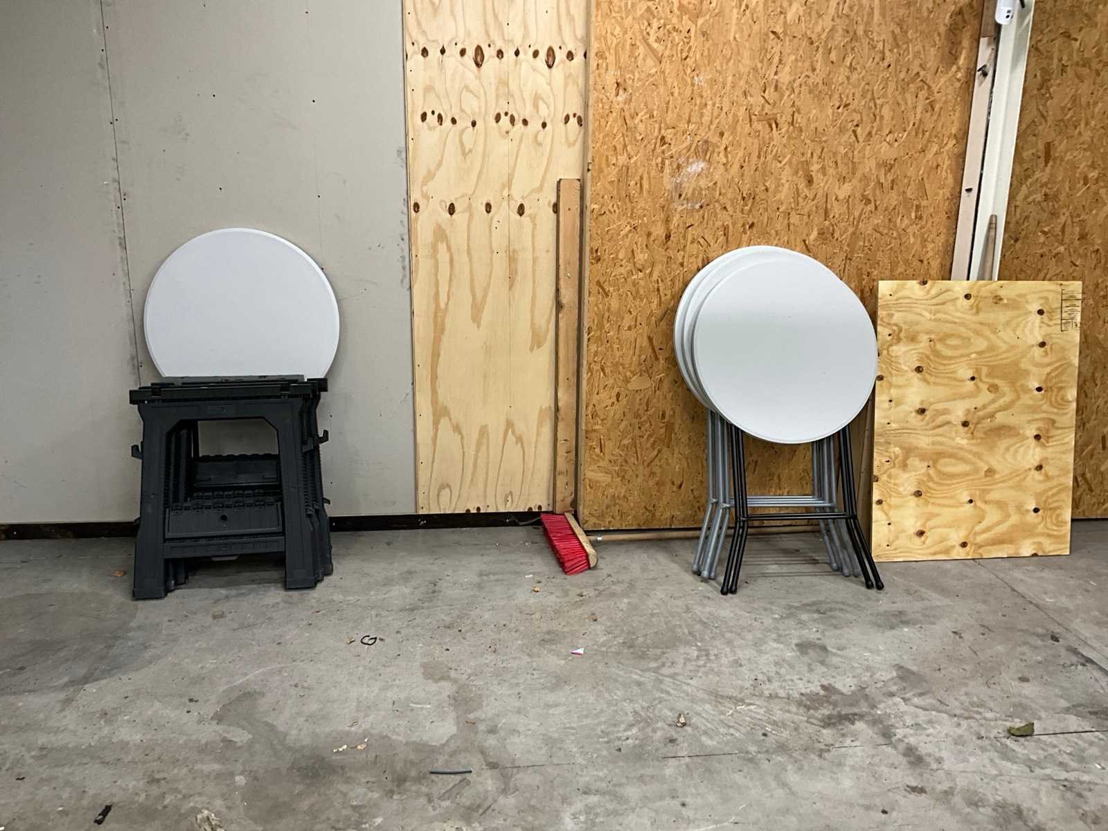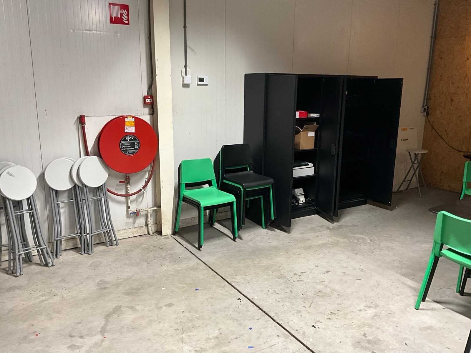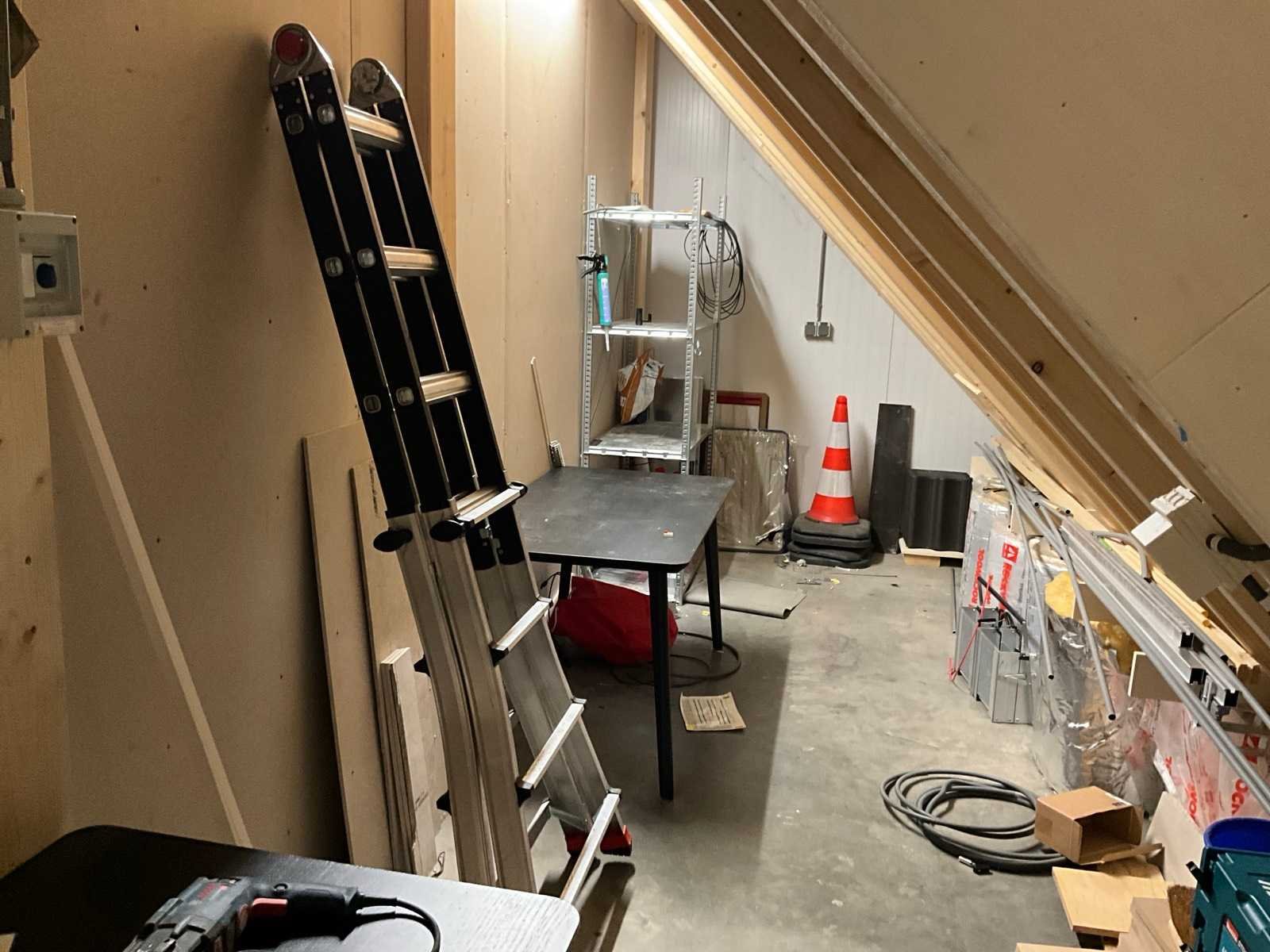 Bestaande uit schuine dak opbouw voor les doeleinde afmetingen (520x390cm) 8x tafel (140x78x75cm) 15x kunststof stoel, 3x archiefkast, Samsung televisie op onderstel, 5x test opstelling meterkast, afgekeurde dakrand beveiliging, 7x sta tafel rond, 10x kruk, 6X bouw stofzuiger, diverse installatie materialen.