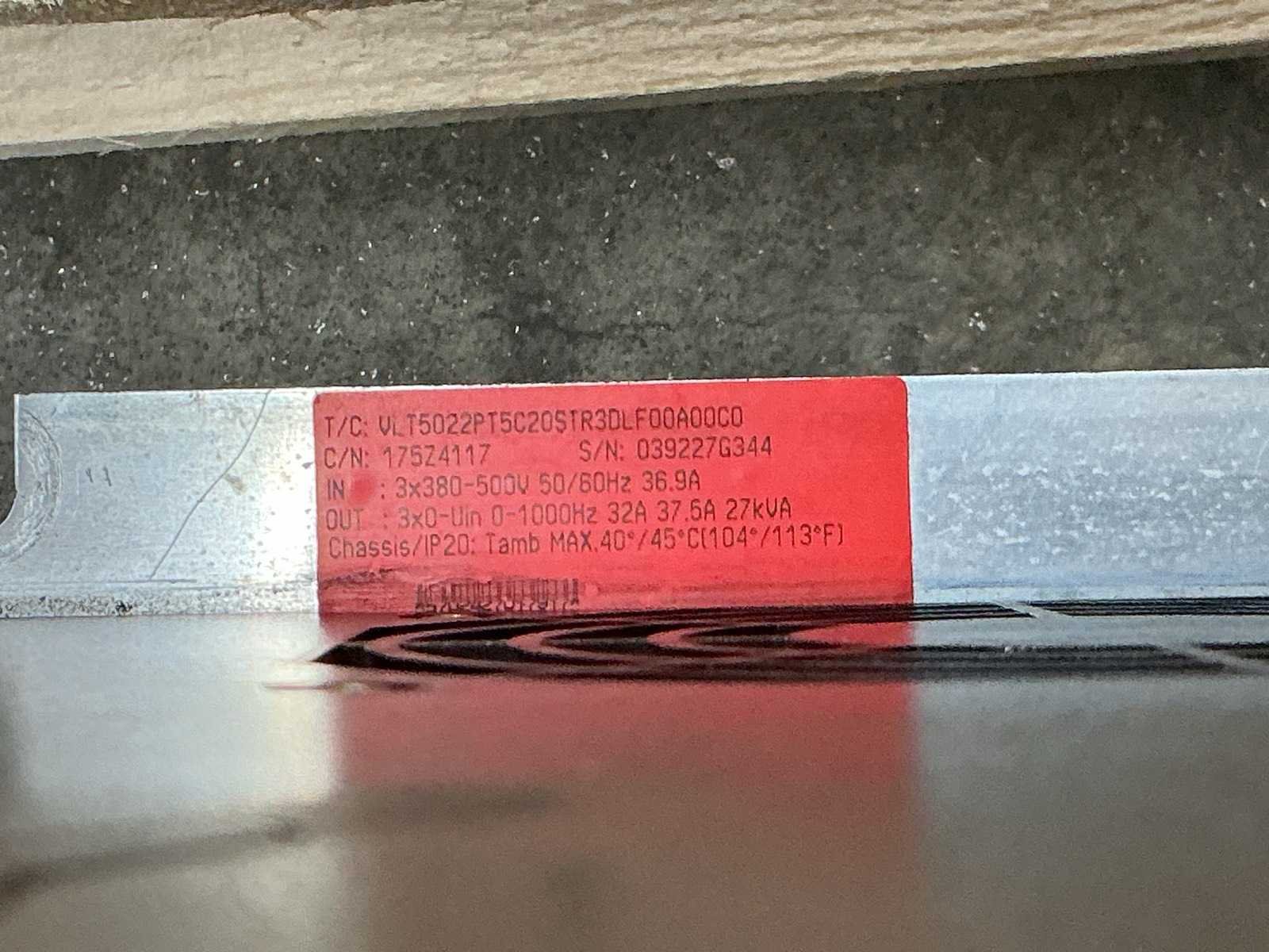 In: 3x380-500V 36,9A 50/60HZ, out: 0-1000hz 32A 37,5A 27kVA Merk: DANFOSS Model: VLT 5000 175Z4117 27kVA Lengte: 26cm Breedte: 24cm Hoogte: 54cm Vermogen (kW): 27kW