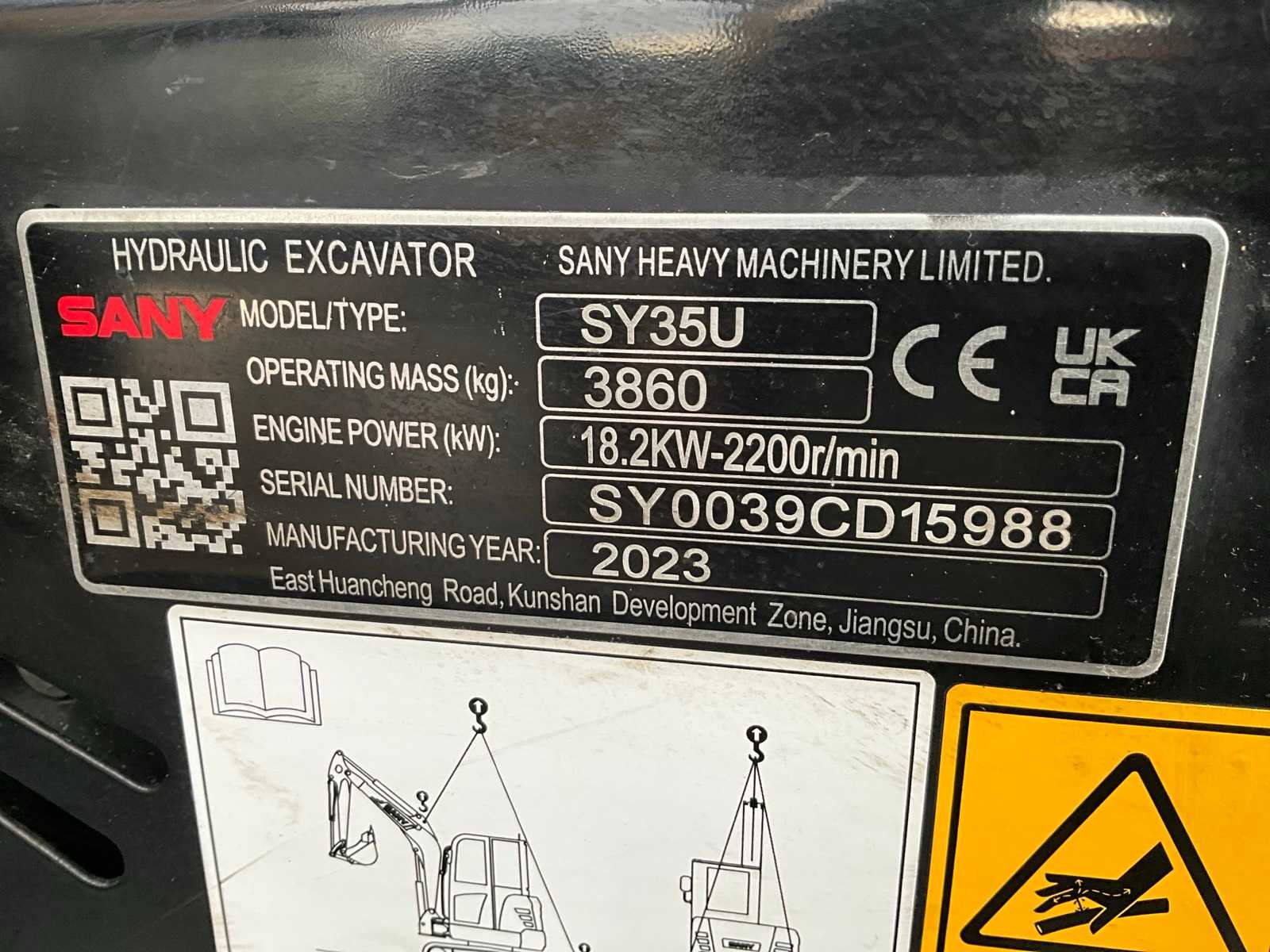 Voorzien van rubber tracks, dozerblad en hydraulische snelwissel Merk: SANY Type: SY35U Bouwjaar: 2023 Serienummer: SY0039CD15988 Merk motor: Yanmar Motorvermogen (kW): 18.2kW Aantal cilinders: 3 Brandstof: Diesel Bedrijfsgewicht: 3860kg Max. werkbereik: 5465mm Max. graafdiepte: 3105mm Inclusief graafbak: Yes Graafbak afm. l: 1150mm Graafbak afm. b: 500mm Graafbak afm. h: 250mm Rups breedte: 300mm Afgelezen urenstand: 909 Totale afmeting L: 4915mm Totale afmeting Breedte: 1720mm Totale afmeting Hoogte: 2515mm